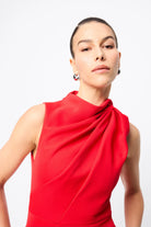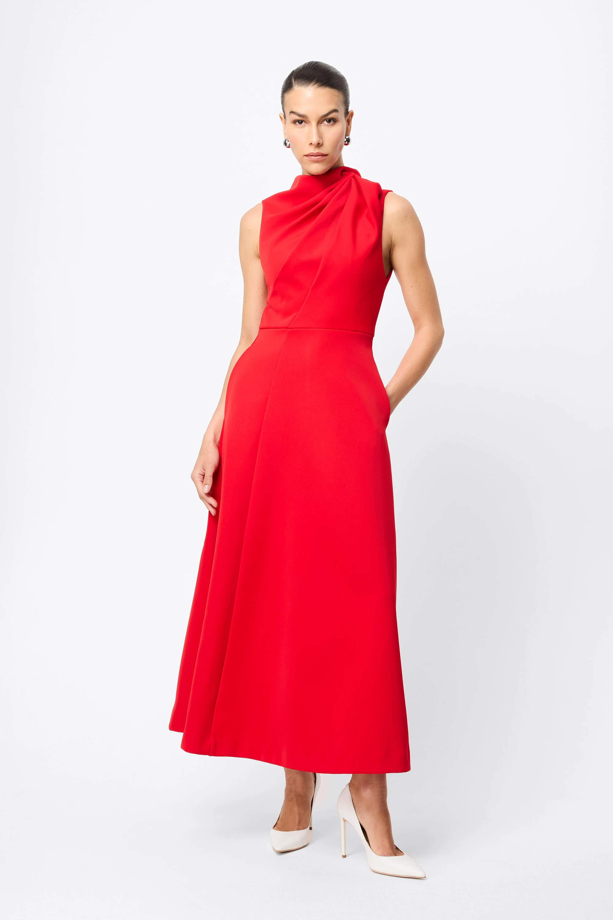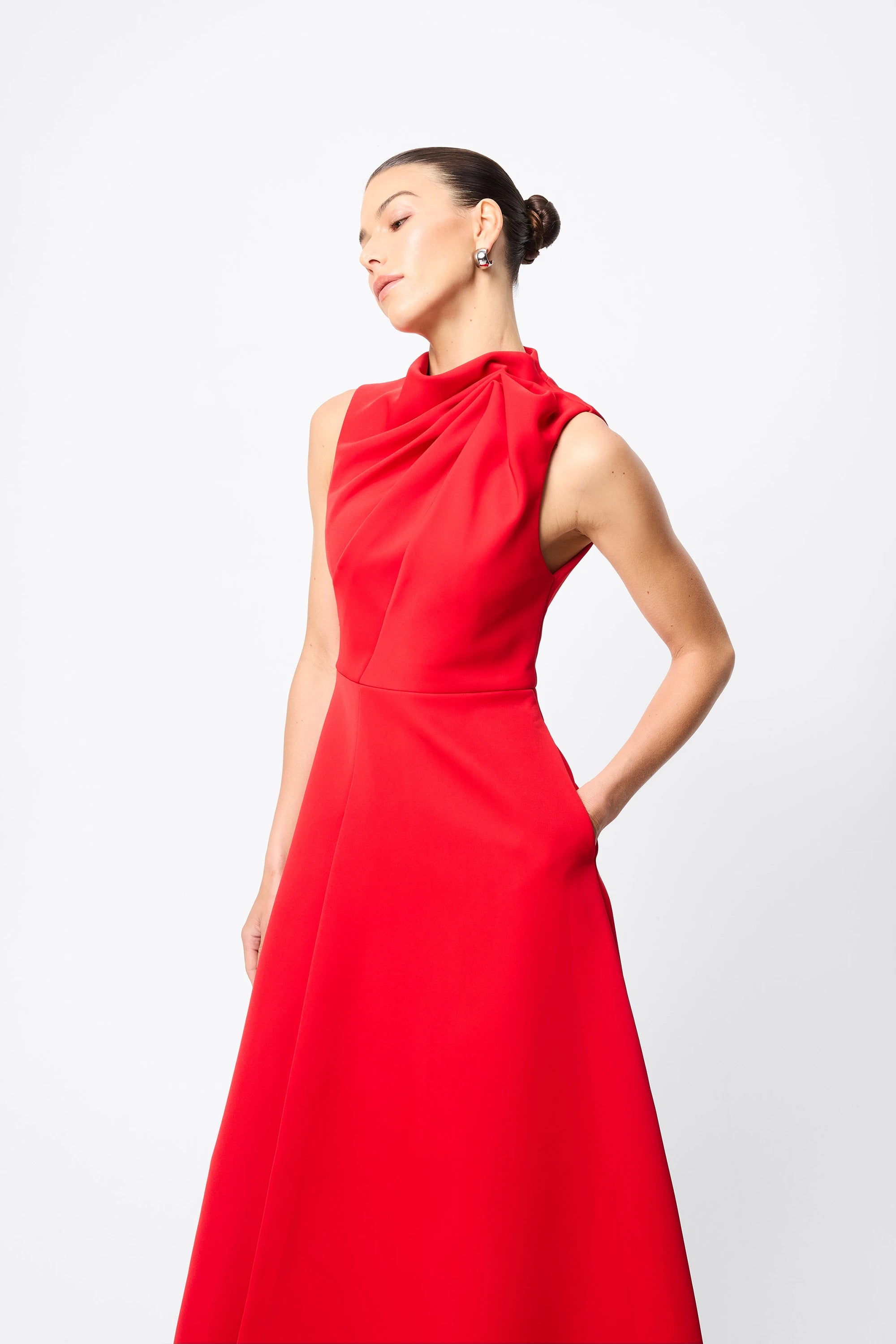 Our Cosmic Maxi Dress in red is the epitome of timeless elegance. Featuring a flattering A-line design, this dress includes a draped bodice, shoulder tucks and a defined waistline to accentuate the silhouette. Complete the look with minimalist heels for an effortlessly elegant style for your next formal event.