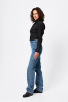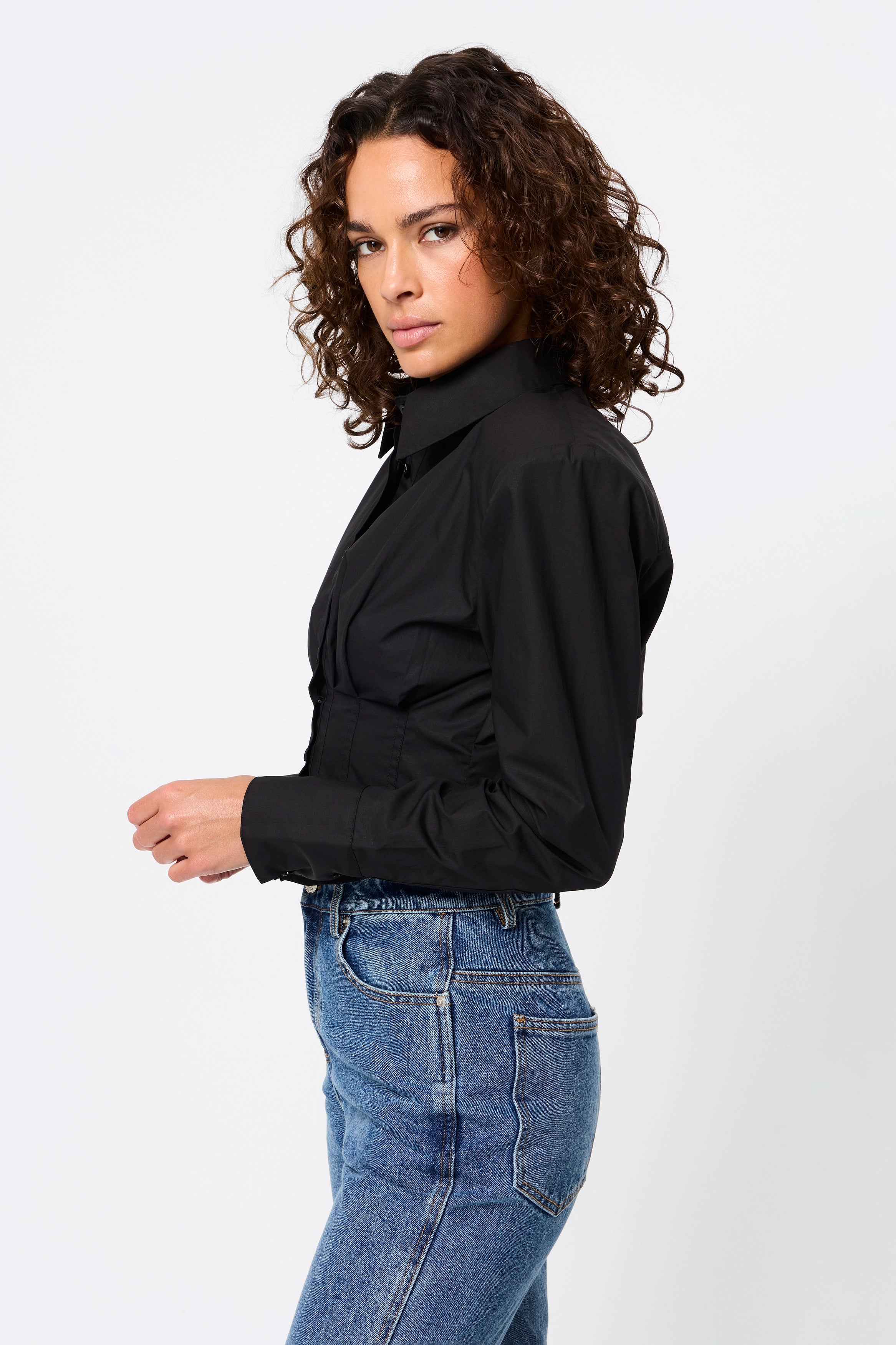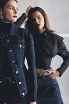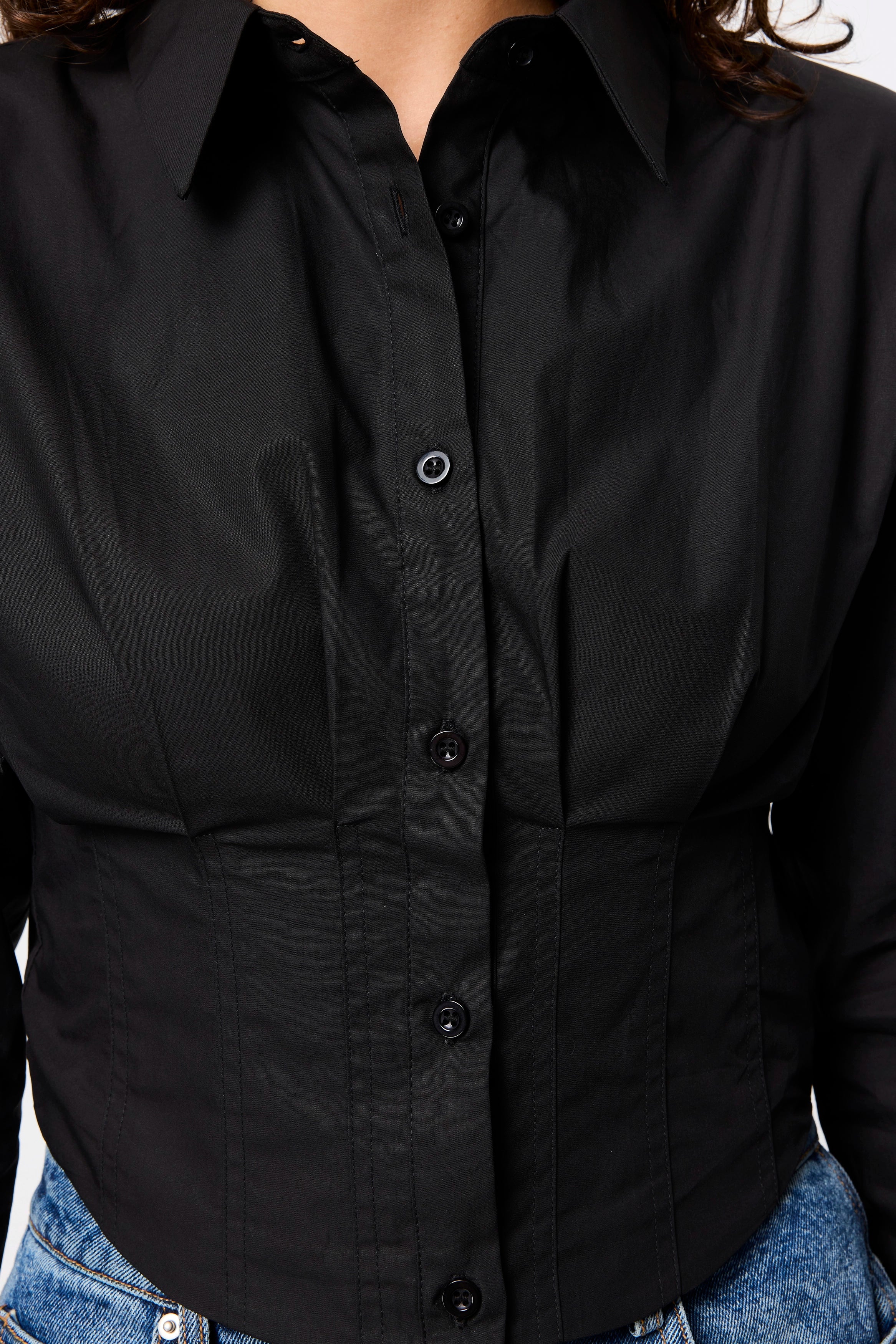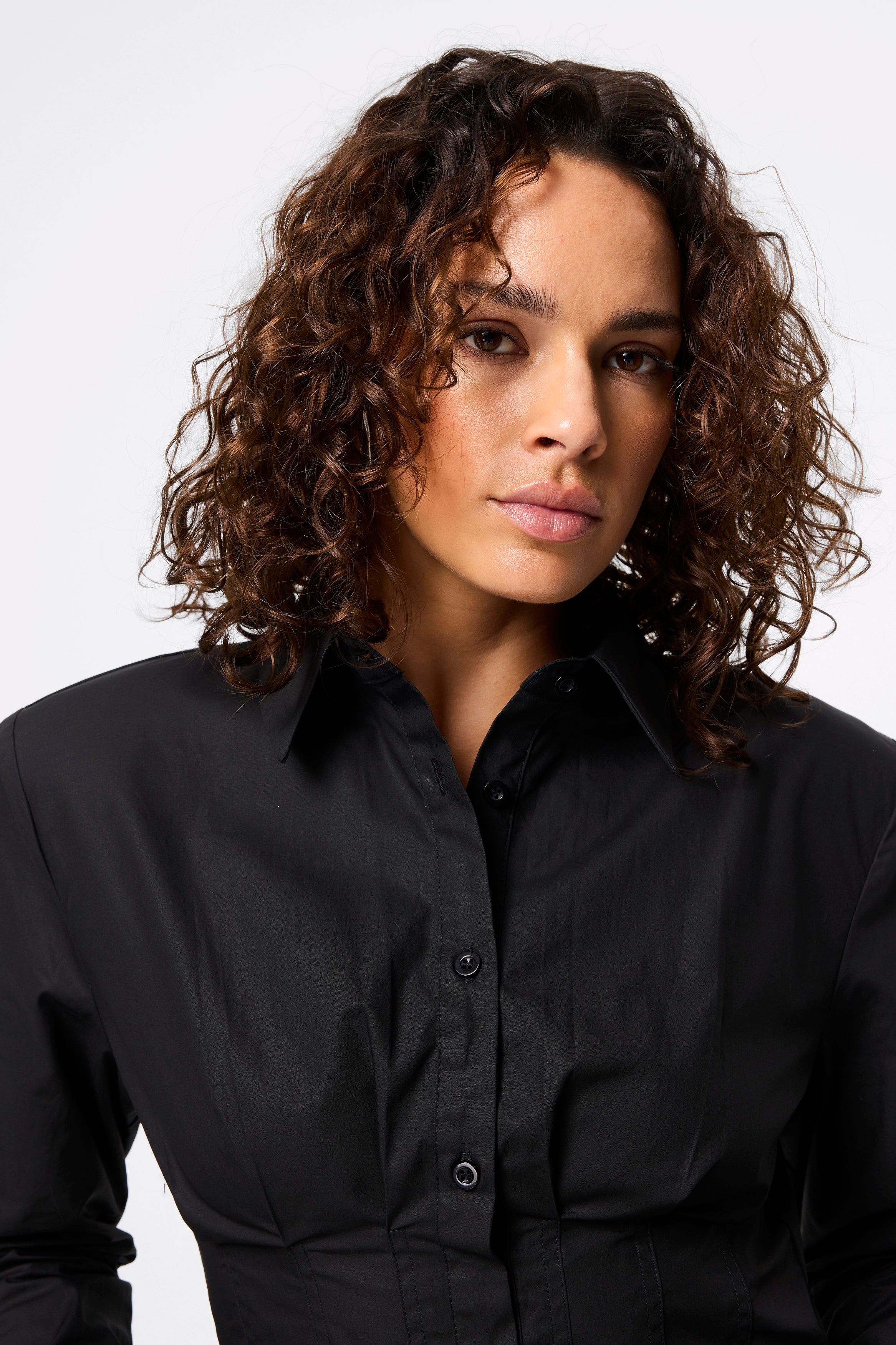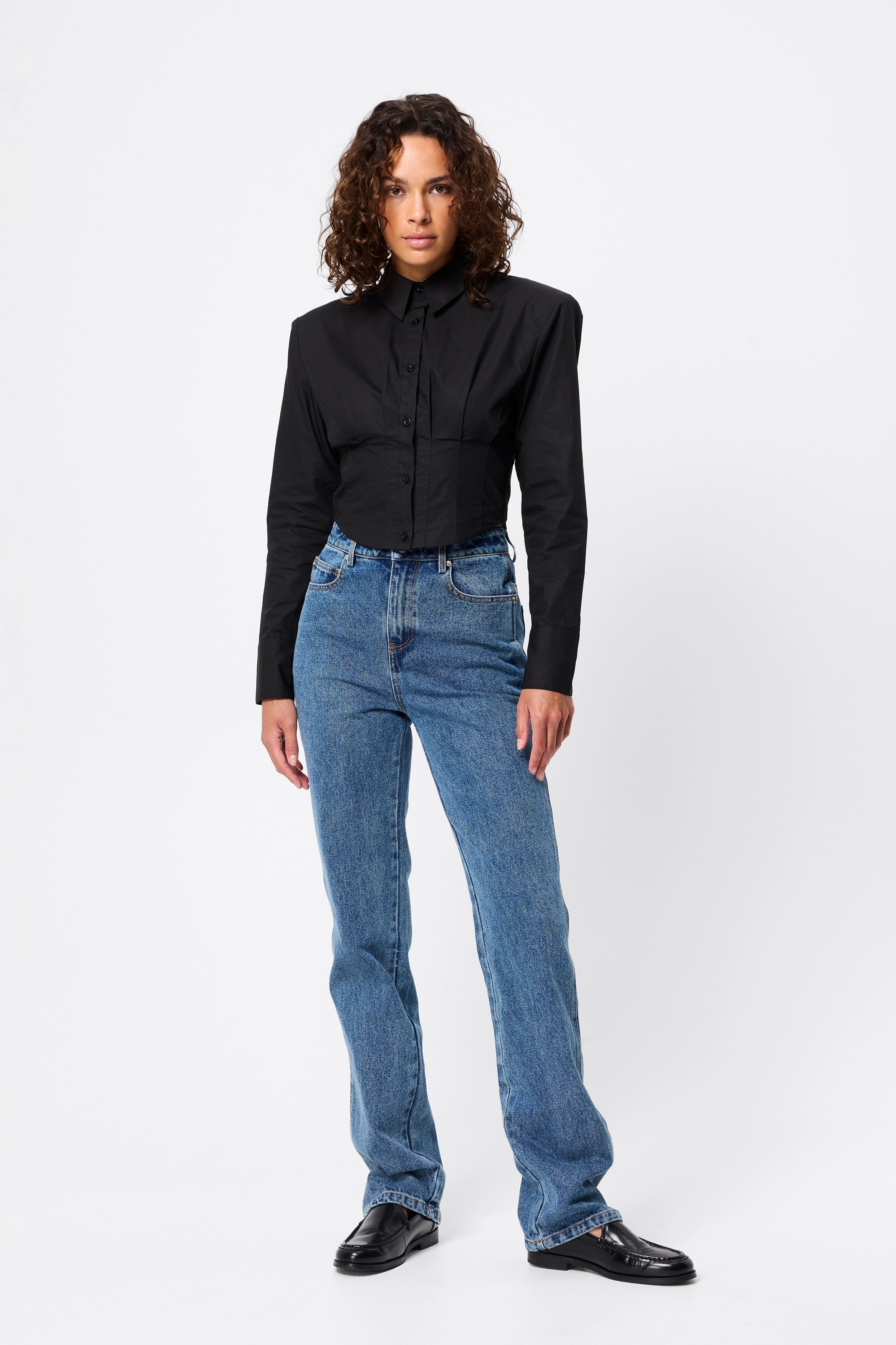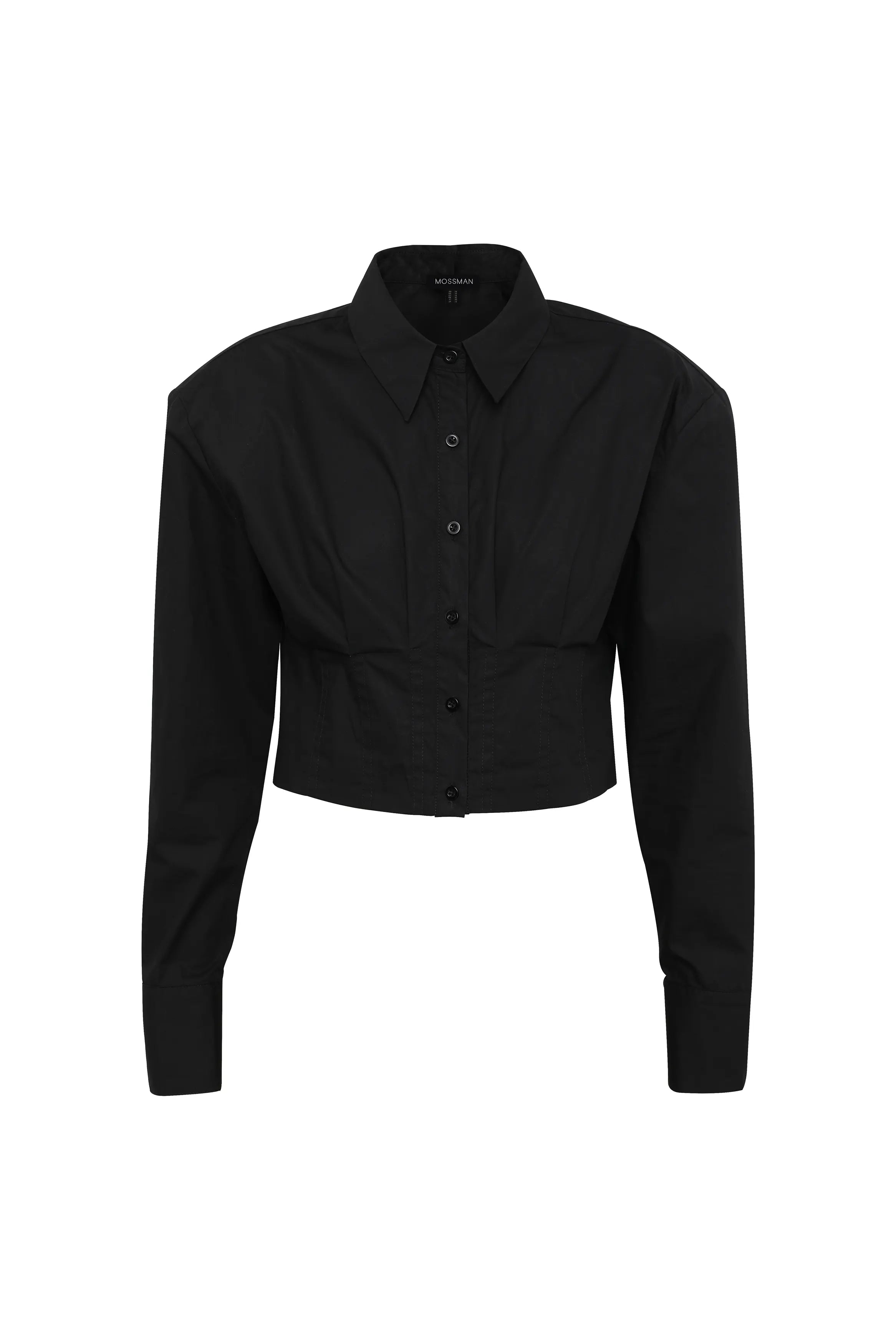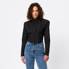 The Darcy Shirt in Black redefines classic tailoring with a modern, structured edge. Crafted from crisp cotton, it features shoulder pads for a sharp silhouette, a collared neckline, and an exposed button-front closure. The cropped length and topstitch detailing at the fitted waist create a flattering shape, while long sleeves with buttoned cuffs complete the polished look. A contemporary essential that transitions effortlessly from office to evening.