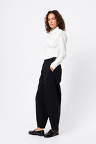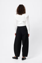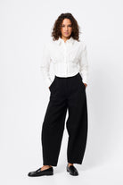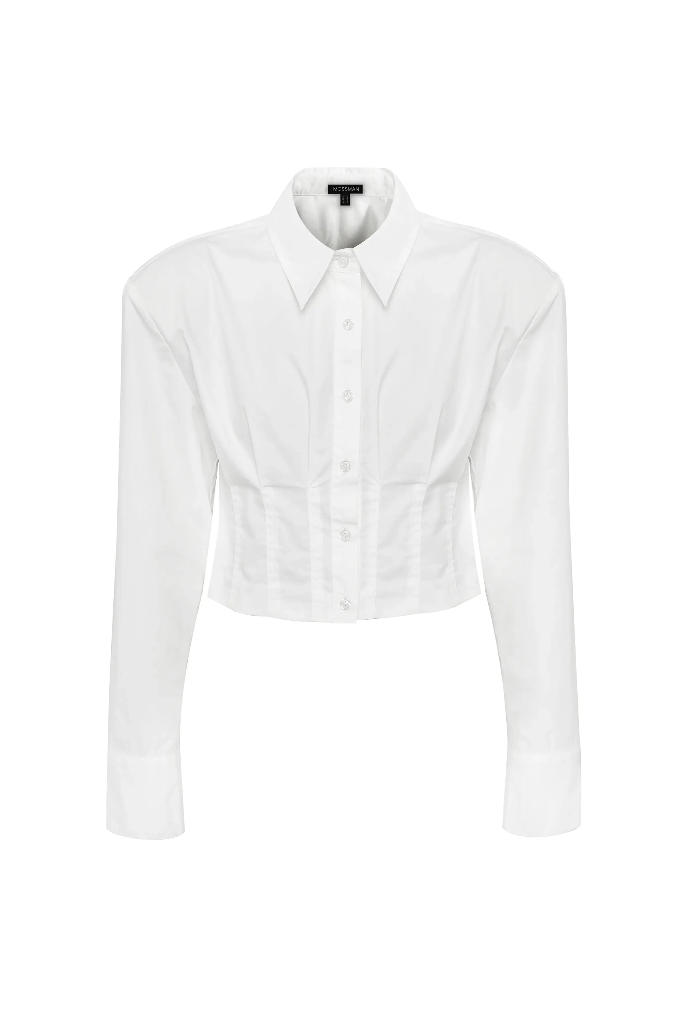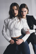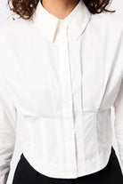 The Darcy Shirt in White redefines classic tailoring with a modern, structured edge. Crafted from crisp cotton, it features shoulder pads for a sharp silhouette, a collared neckline, and an exposed button-front closure. The cropped length and topstitch detailing at the fitted waist create a flattering shape, while long sleeves with buttoned cuffs complete the polished look. A contemporary essential that transitions effortlessly from office to evening.