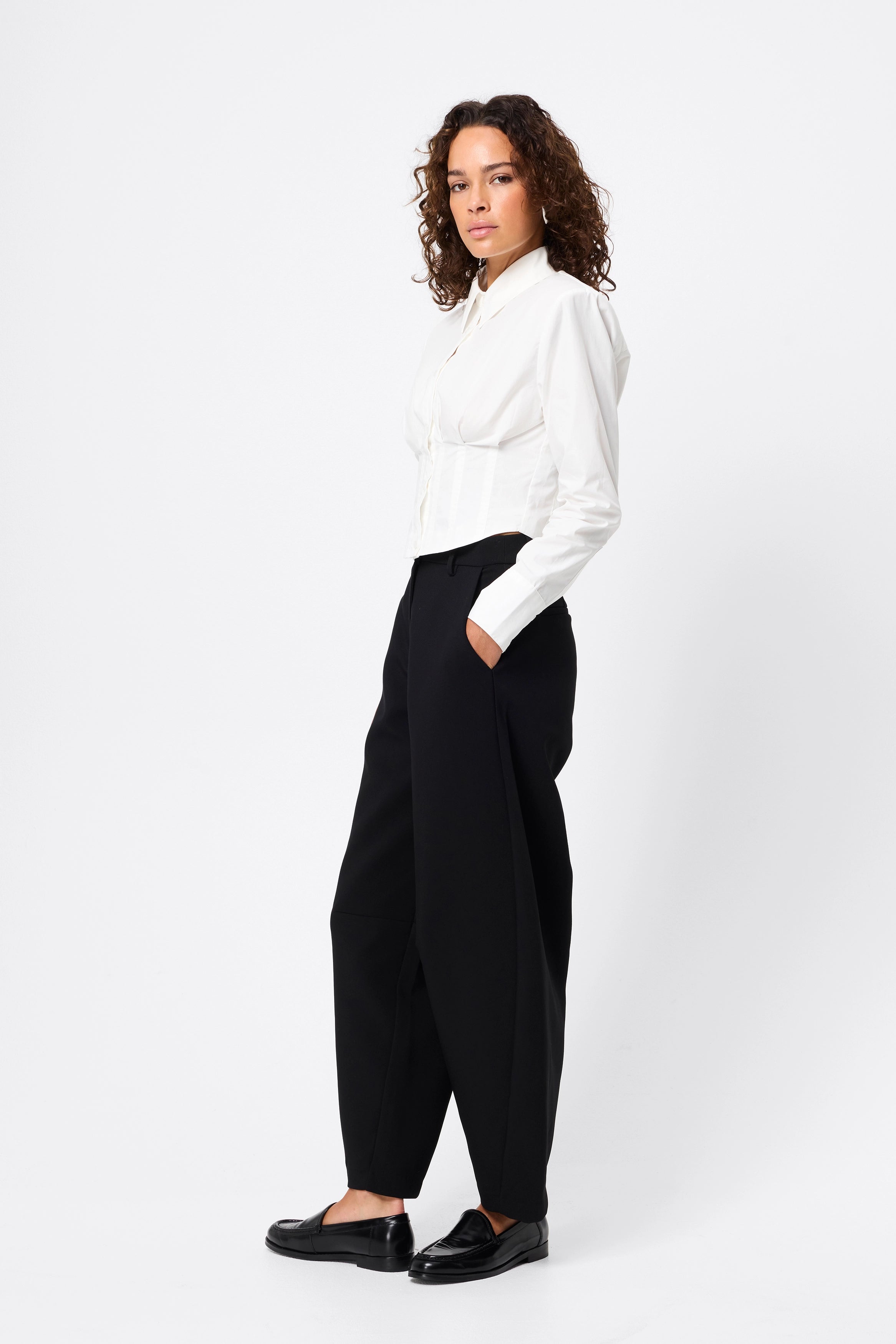 - Cropped length with topstitch detailing