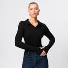 A modern essential with timeless appeal, the Florence Polo Top in Black is crafted from a double-layered ribbed jersey fabrication for a soft, sculpting fit. Featuring a collared neckline and long sleeves with thumb openings, this piece combines classic polo detailing with a contemporary, form-fitting silhouette. Designed for versatility, it transitions effortlessly from desk to dinner when paired with tailoring or denim.