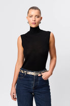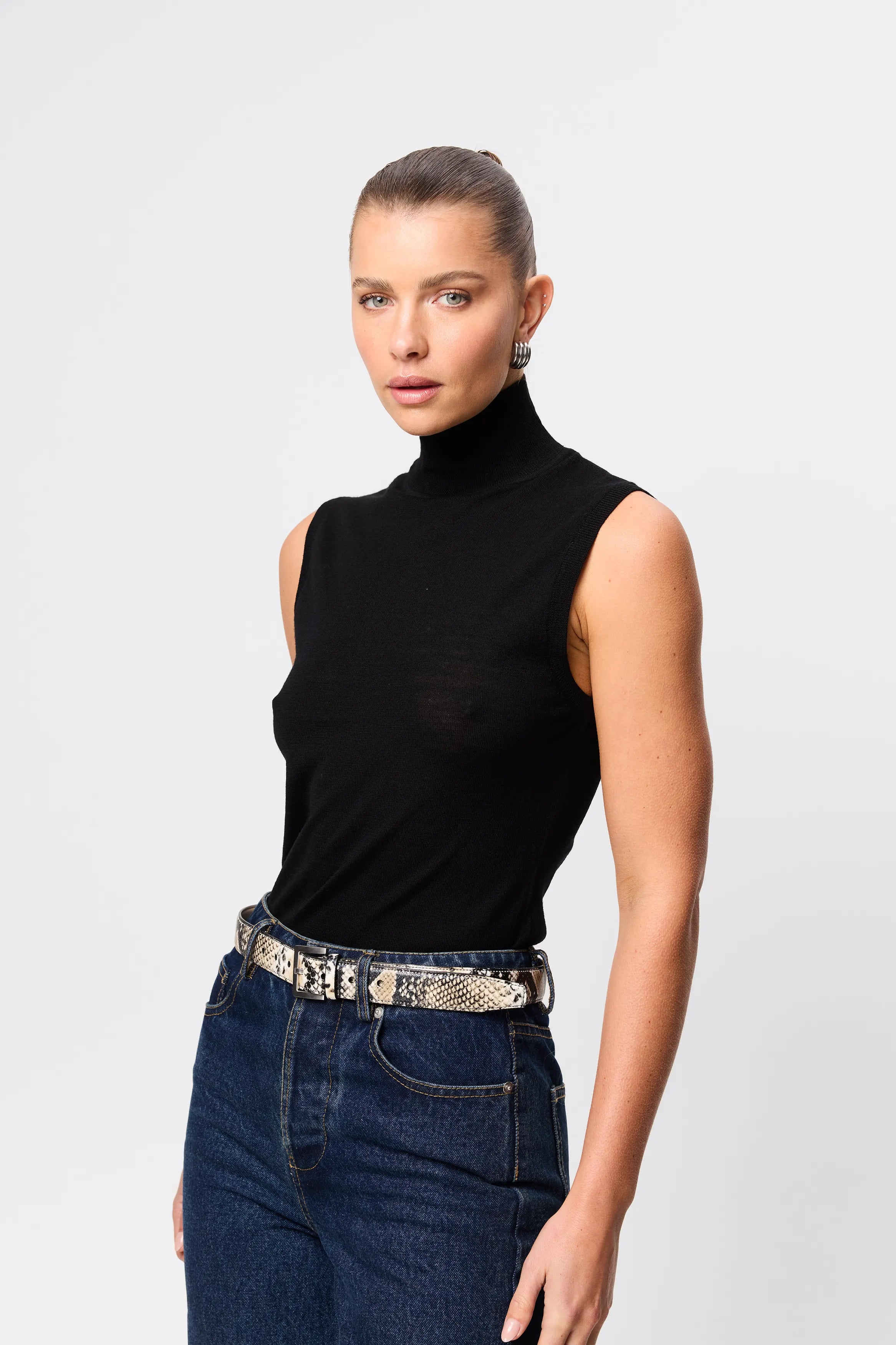 A refined essential with a modern edge, the Harlow Turtleneck in Black is crafted from 100% merino wool for an ultra-soft, lightweight feel against the skin. Designed with a sleek sleeveless silhouette and a softly structured turtleneck, it layers effortlessly or stands strong on its own. The fine ribbed knit contours the body without clinging, delivering a clean, streamlined look that feels timeless yet current. Perfect for trans-seasonal dressing, the Harlow moves seamlessly from polished daytime looks to understated evening styling — an elevated staple you’ll reach for again and again.
