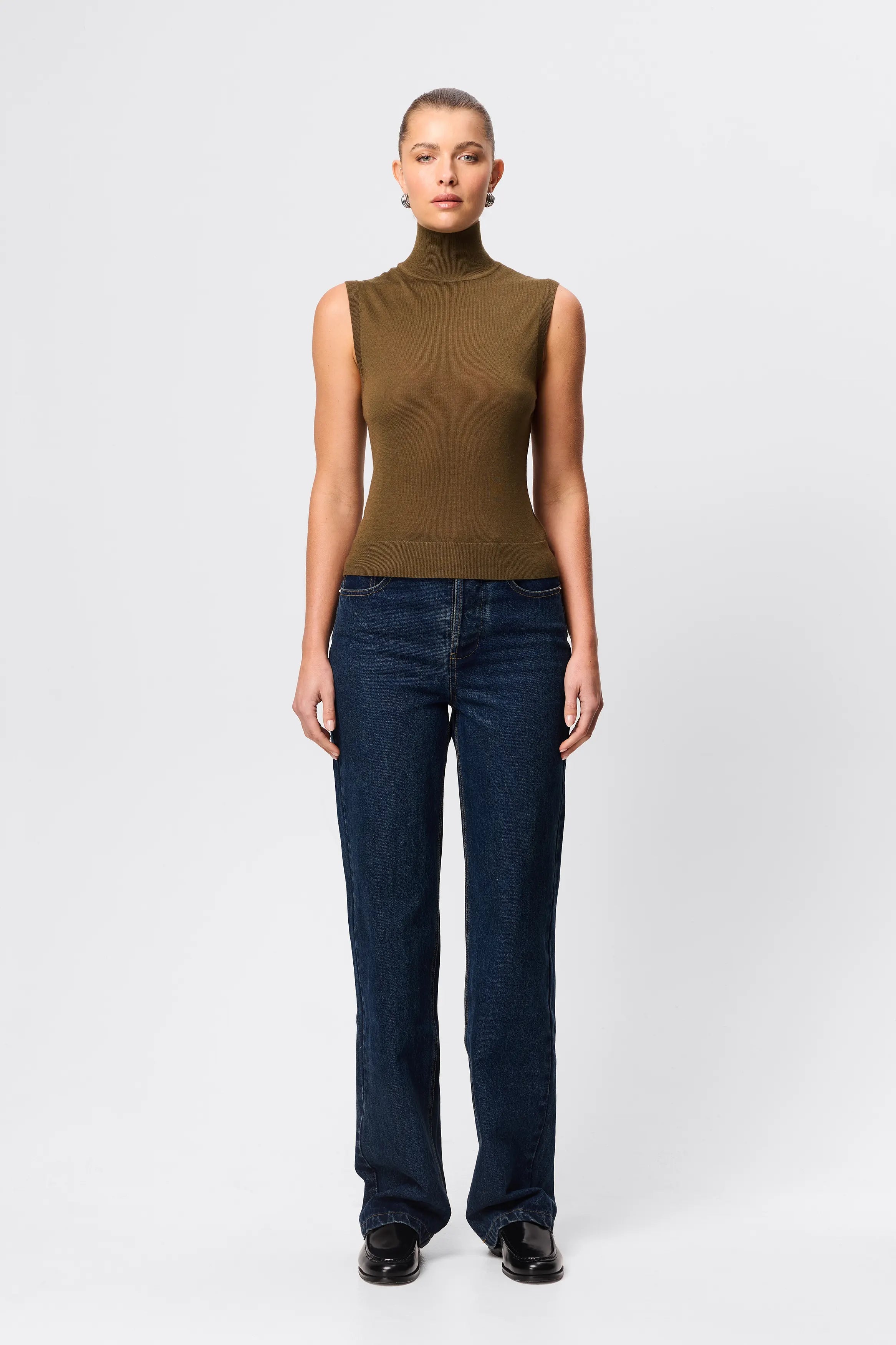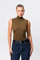 A refined essential with a modern edge, the Harlow Turtleneck in Khaki is crafted from 100% merino wool for an ultra-soft, lightweight feel against the skin. Designed with a sleek sleeveless silhouette and a softly structured turtleneck, it layers effortlessly or stands strong on its own. The fine ribbed knit contours the body without clinging, delivering a clean, streamlined look that feels timeless yet current. Perfect for trans-seasonal dressing, the Harlow moves seamlessly from polished daytime looks to understated evening styling — an elevated staple you’ll reach for again and again.