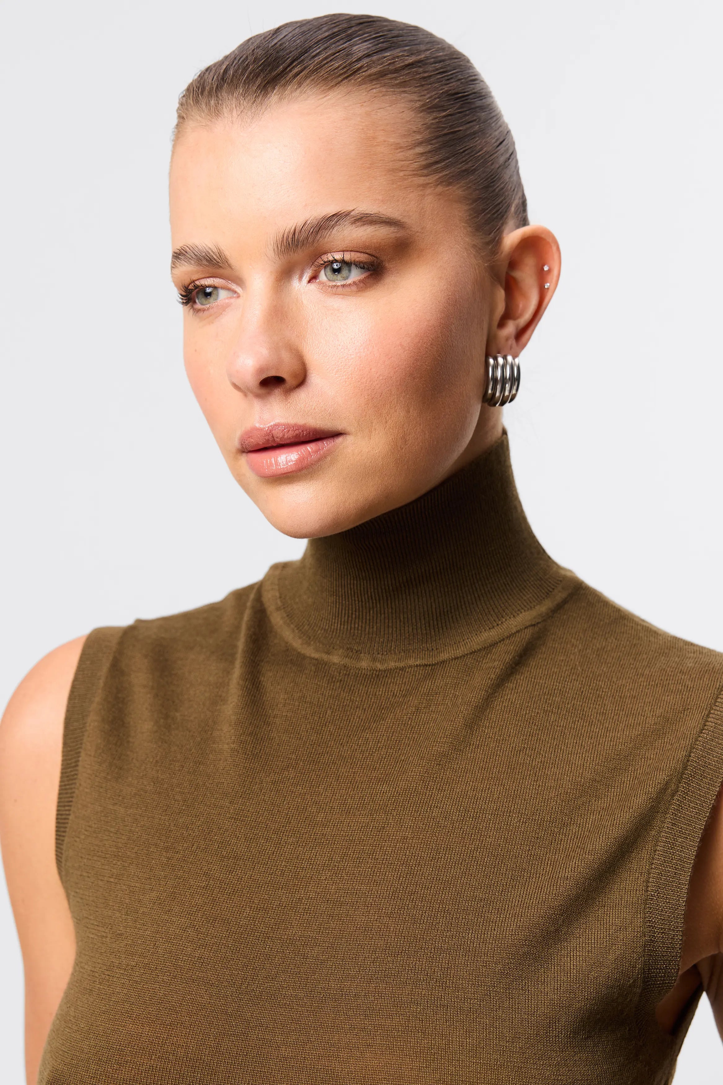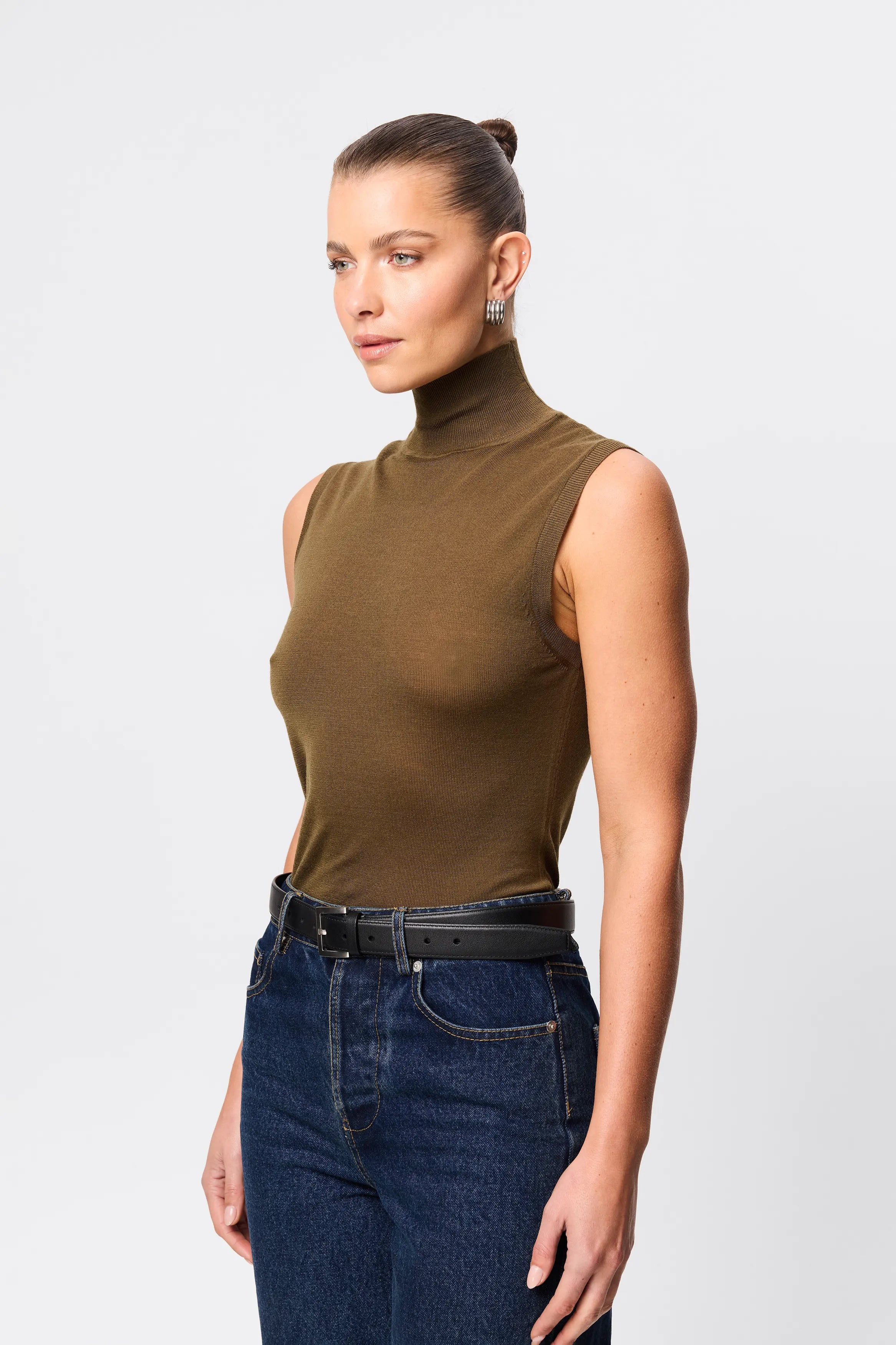 - Sleeveless silhouette with refined turtleneck