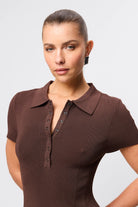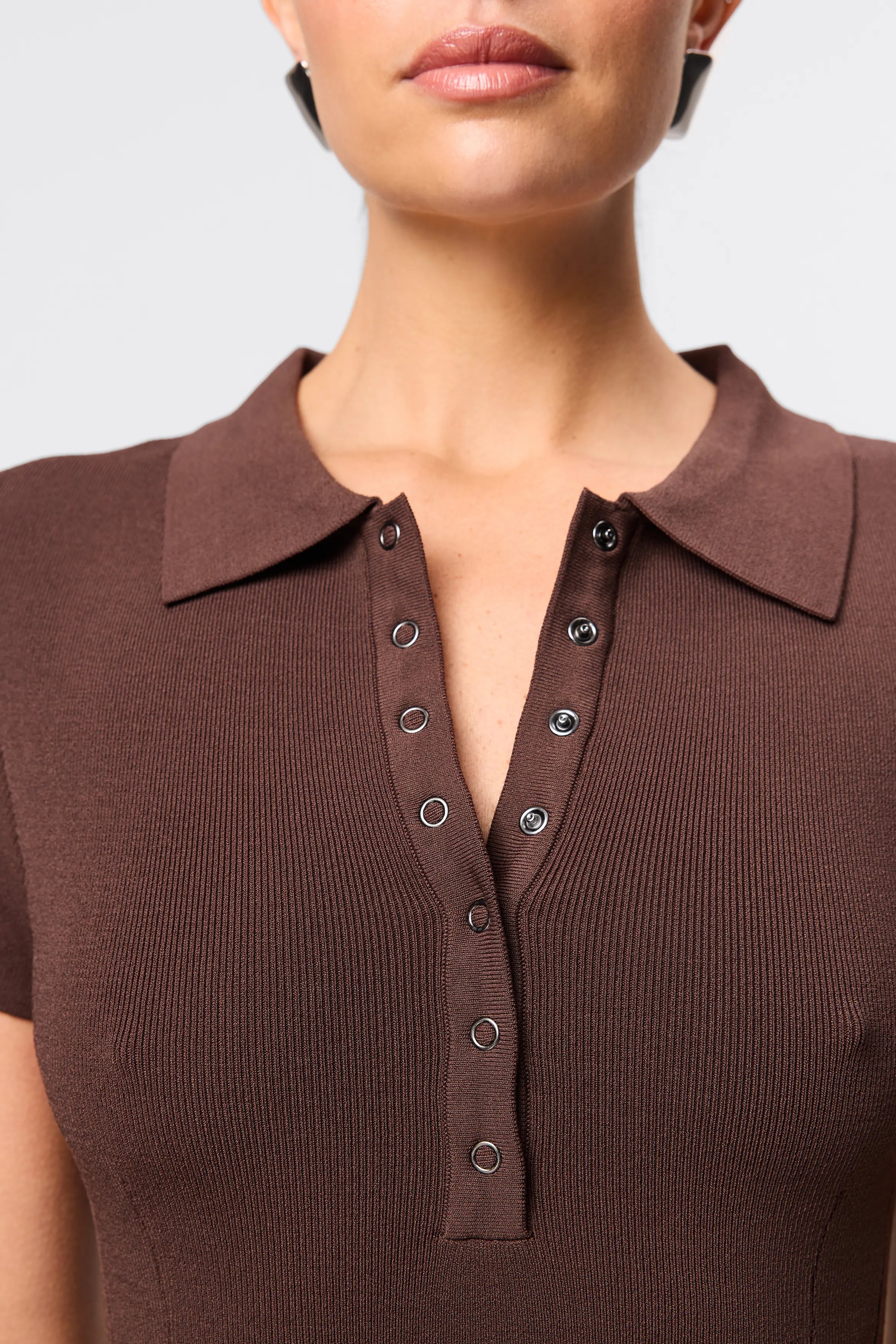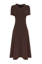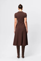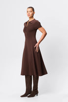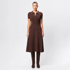Crafted from our signature high-quality micro crepe knit, the Petra Midi Dress in Chocolate blends sophistication with ease. Featuring a collared neckline with snap button detailing and cap sleeves, this design is fitted through the torso before flowing into an A-line midi skirt for a flattering silhouette. Perfect from day to evening, it’s a timeless piece that can be layered with a cardigan for effortless trans-seasonal style.