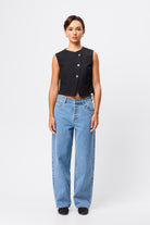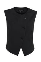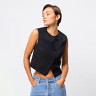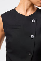 A contemporary take on classic tailoring, the By Your Side Vest in Black is crafted from premium suiting fabrication and features a round neckline, bust darts, faux pockets, and a front-pointed hem for a structured finish. Designed with an off-body silhouette and asymmetric self-coloured button closure, it offers a sleek, modern edge. Pair it with the By Your Side Mini Skirt for a sharp coordinated look, layer under a blazer for the office, or style with denim for effortless weekend wear.