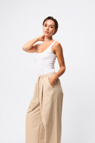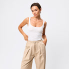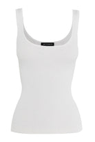 The Fine Line Knit Tank in White blends elegance and ease in a timeless silhouette. Crafted from high-quality ribbed knit fabric, it features thin straps and a scoop neckline at both the front and back for a flattering, minimalist finish. Designed to transition effortlessly from casual to elevated occasions, this singlet is a versatile staple you'll wear on repeat. Style it under tailoring for a refined look or wear it solo for understated, everyday polish.