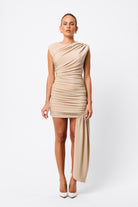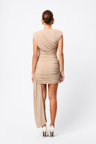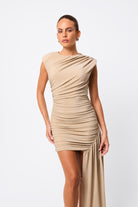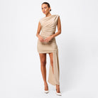 Redefine evening glamour in the Adore You Mini Dress in Gold — a lustrous silhouette designed with a contemporary twist. Crafted from a premium metallic jersey fabrication, this fitted style features structured shoulder pads, a draped bodice, and gathered detailing through the shoulders and waist for a flattering, sculpted finish. An asymmetric side drape adds dramatic movement, while the metallic fabrication ensures you stand out with every step. Bold yet refined, it’s the ultimate piece for statement nights.
