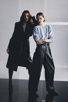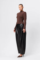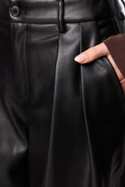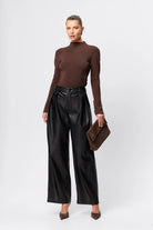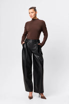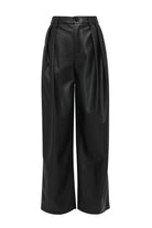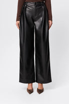 The Fairfax Pleated Wide Leg Trouser in Black is a modern tailoring essential designed to bring structure and sophistication to everyday dressing. Crafted from smooth faux leather with a soft yet substantial hand feel, this high-waisted silhouette features double front pleats that create volume through the leg while maintaining a flattering, elongated line. The wide leg cut falls fluidly to full length, balancing sharp tailoring with effortless movement, while side pockets and a clean waistband finish enhance its refined appeal. Designed to sit neatly at the waist and drape through the hip, this style pairs seamlessly with fitted knitwear or sharp shirting and can be styled back with the matching Fairfax Storm Trench for a cohesive, statement look that transitions effortlessly from day to evening.