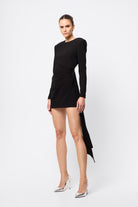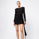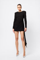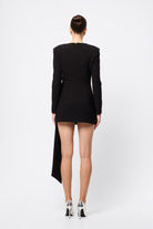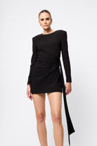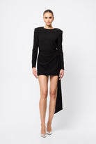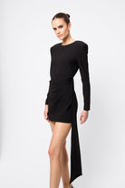 Timeless, commanding and effortlessly sleek. The Sense of Mystery Draped Mini Dress in Black is the ultimate power piece for the modern minimalist. Cut in deep black for maximum impact, this tailored mini dress features bold, architectural shoulders and refined draping that cinches the waist and falls fluidly to one side. Clean lines and sharp tailoring meet elegant asymmetry in a silhouette that’s both contemporary and enduring. Whether it's an evening affair or an elevated night out, this dress delivers quiet drama with undeniable polish.