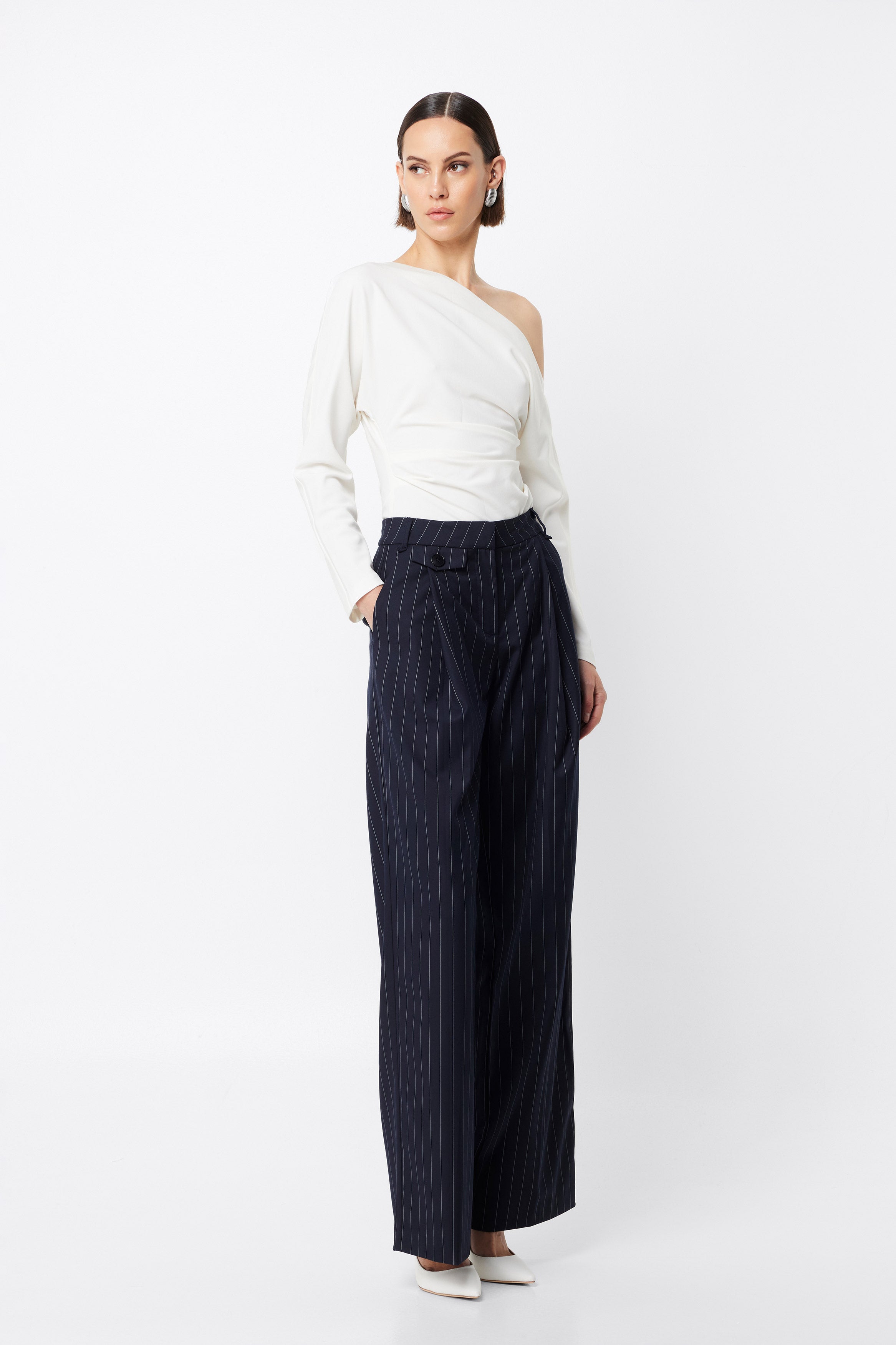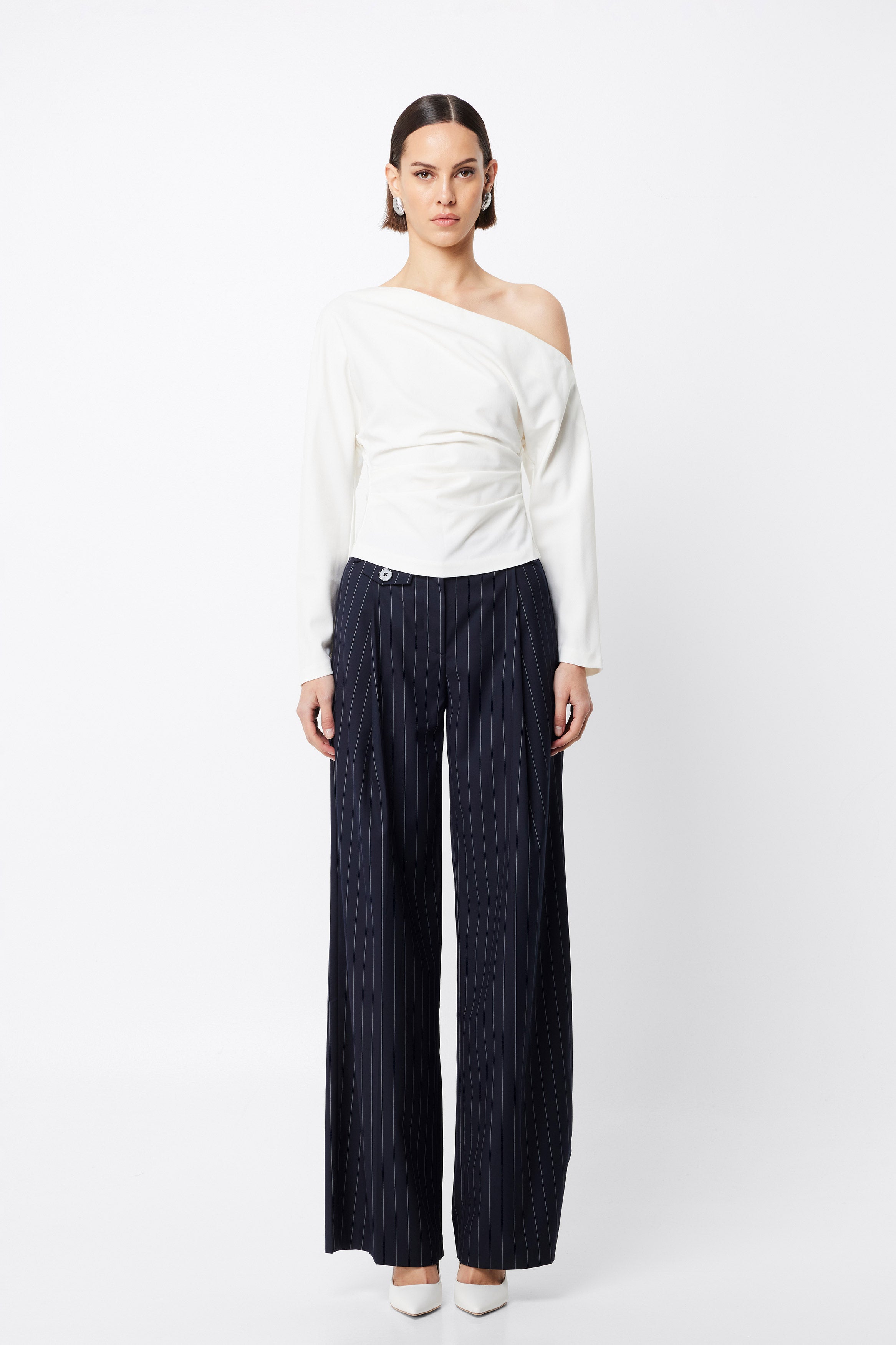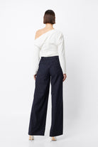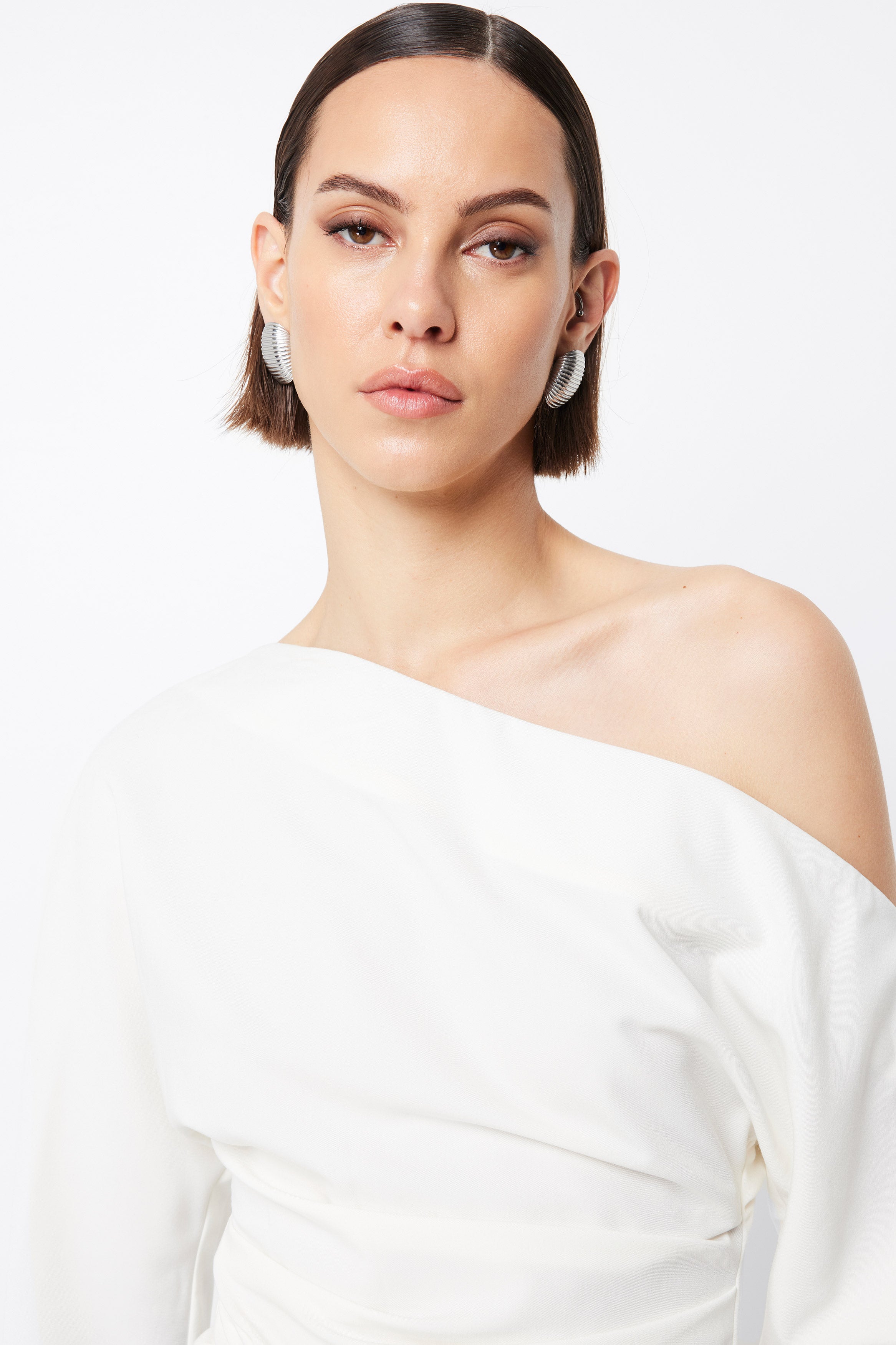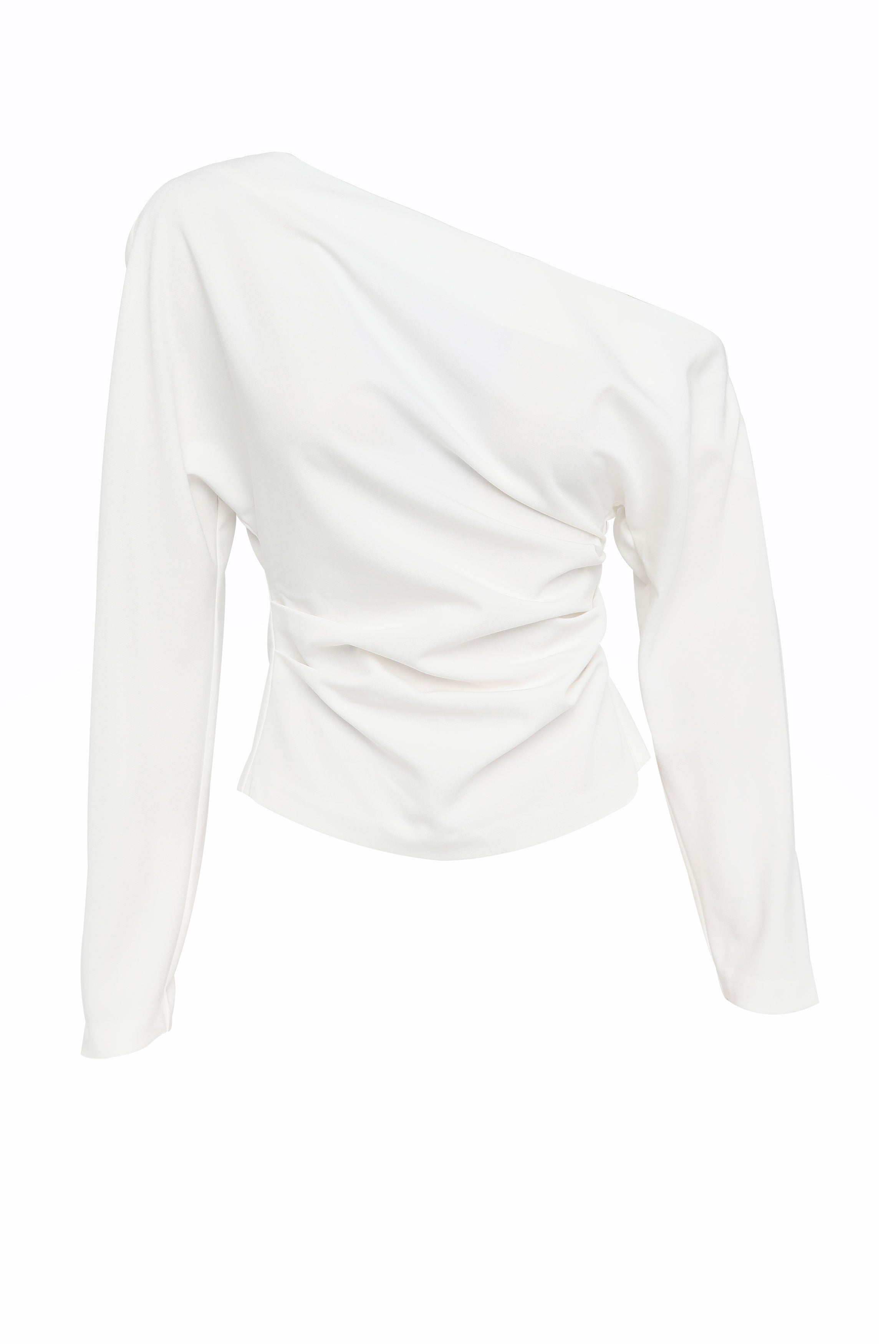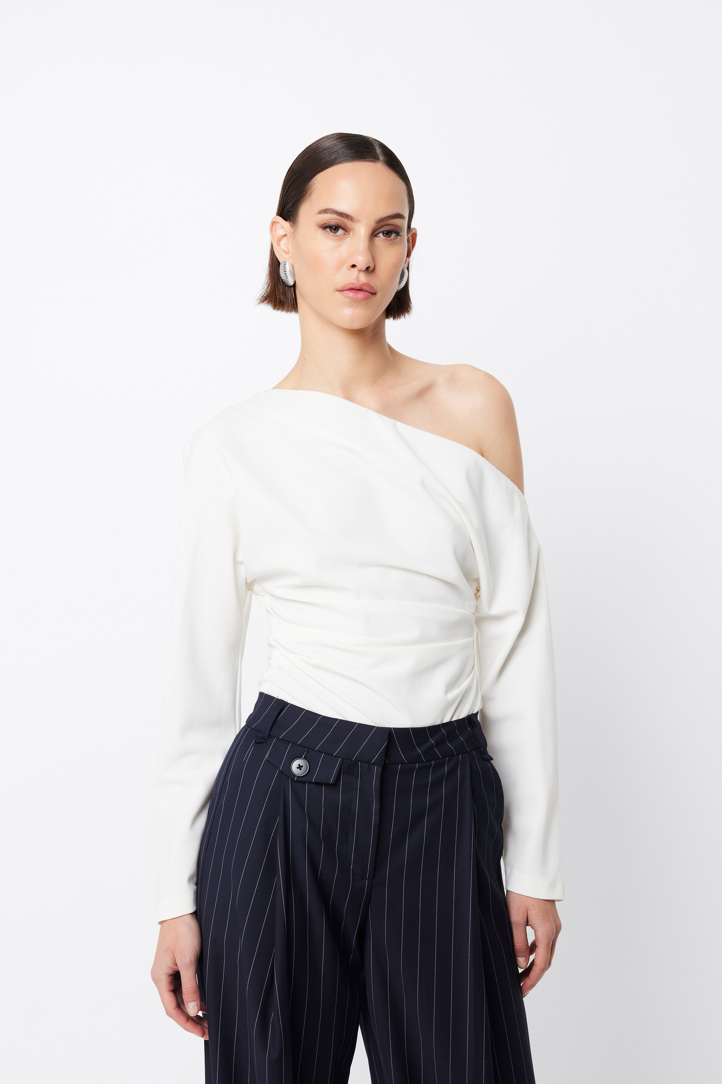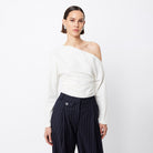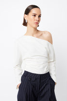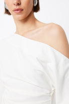 The Disarm Top in soft white features a striking asymmetric one-shoulder neckline and flattering side ruching. A sophisticated choice for any occasion, pair it with tailored pants for a polished desk-to-dinner look or style it with our Bexley Denim for a chic weekend vibe.
