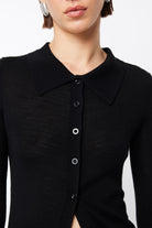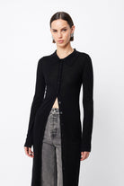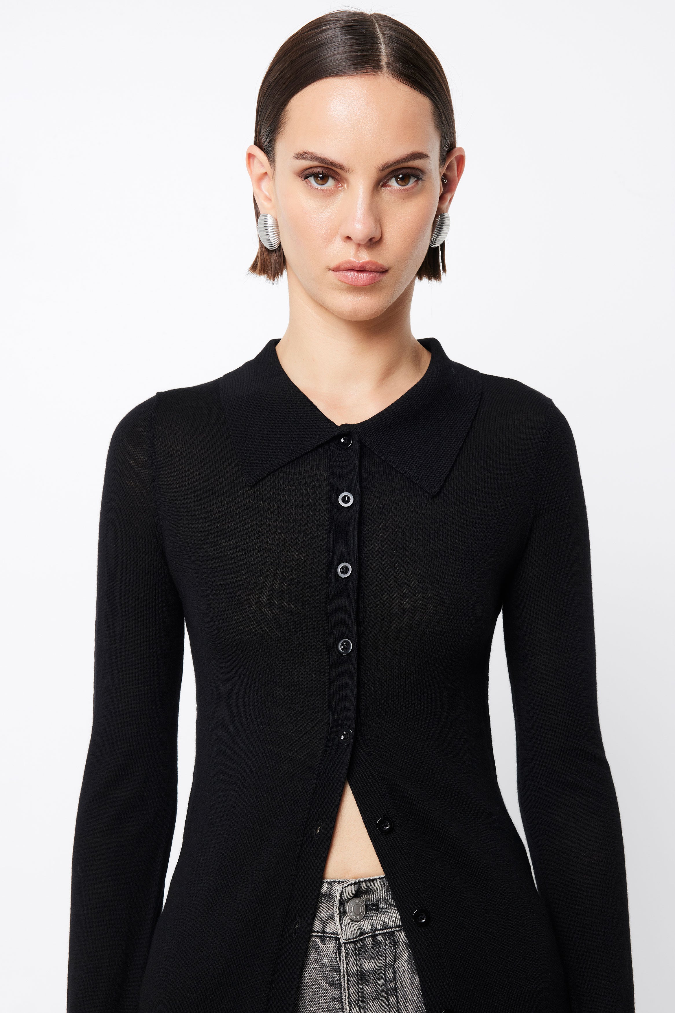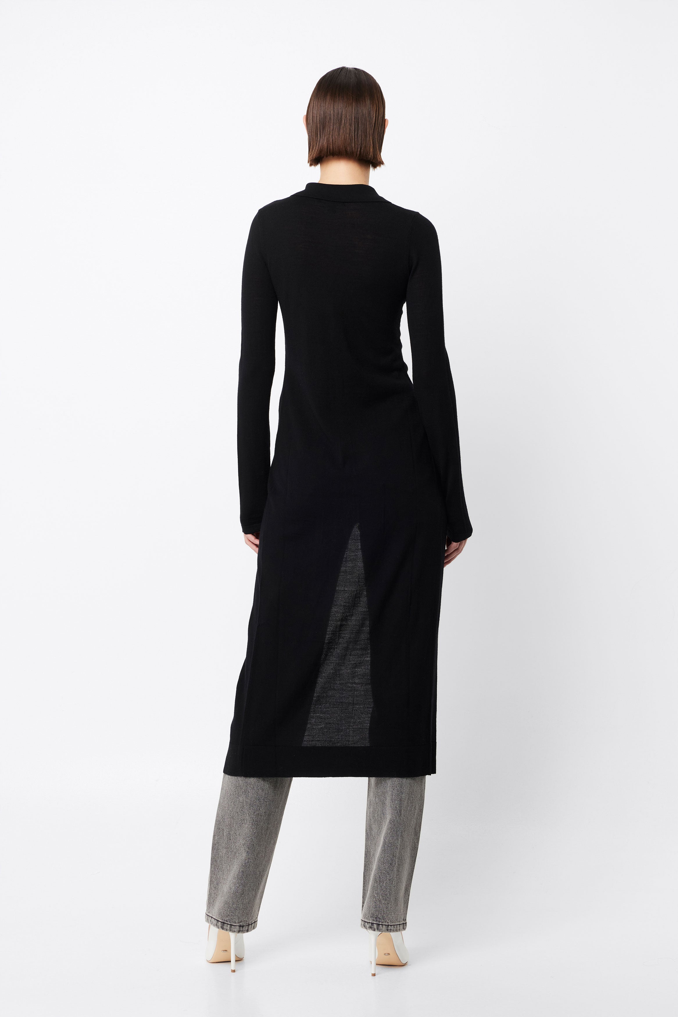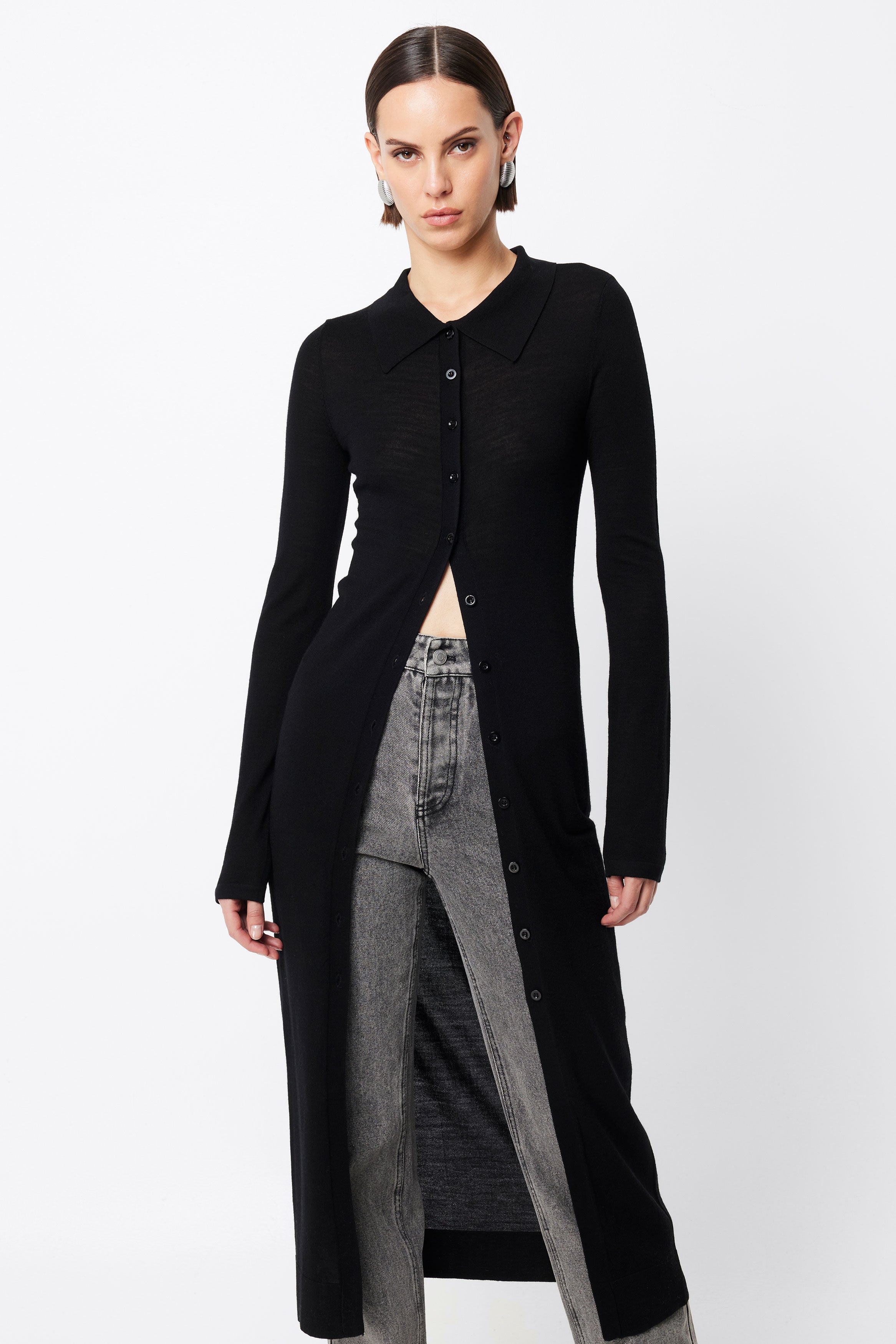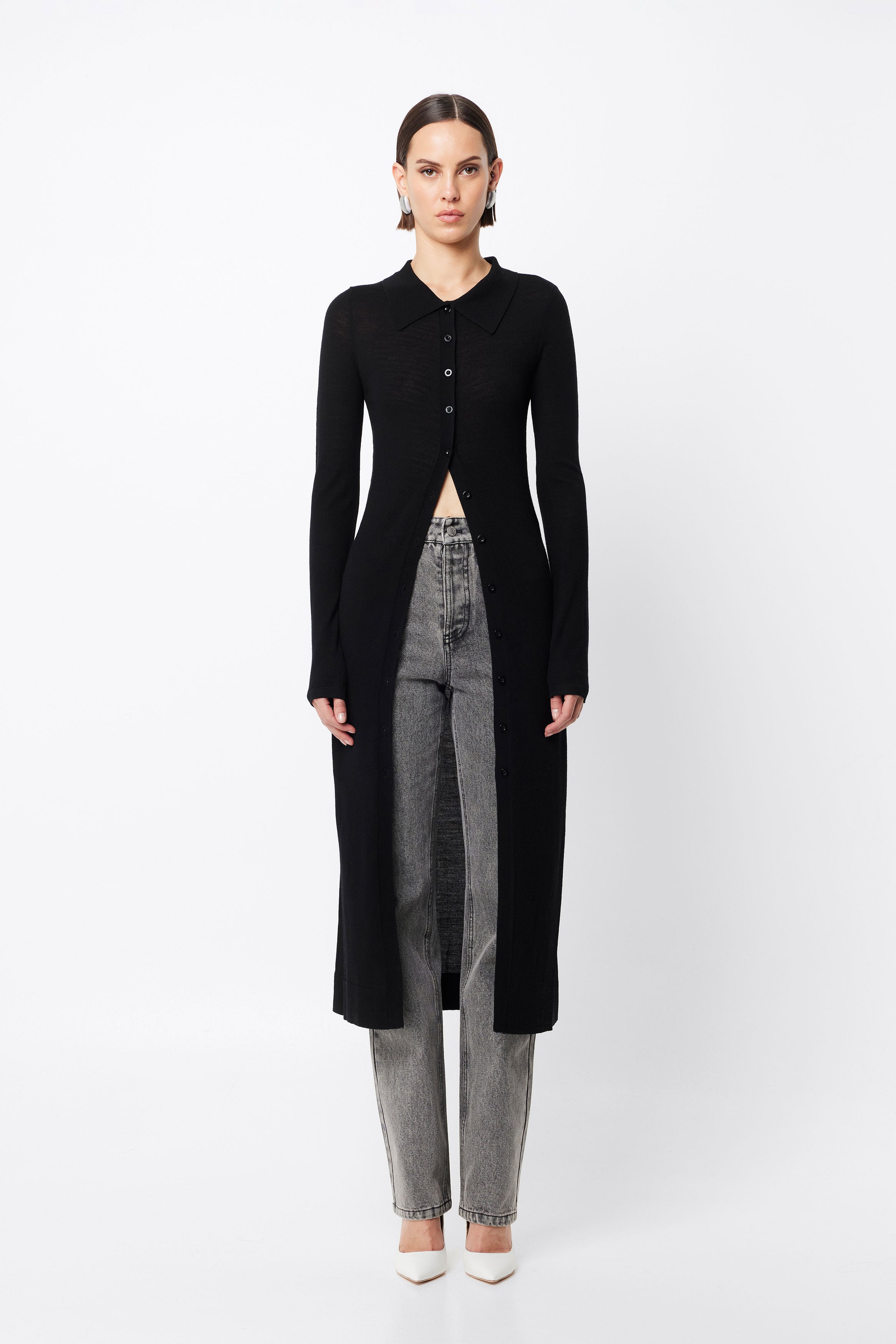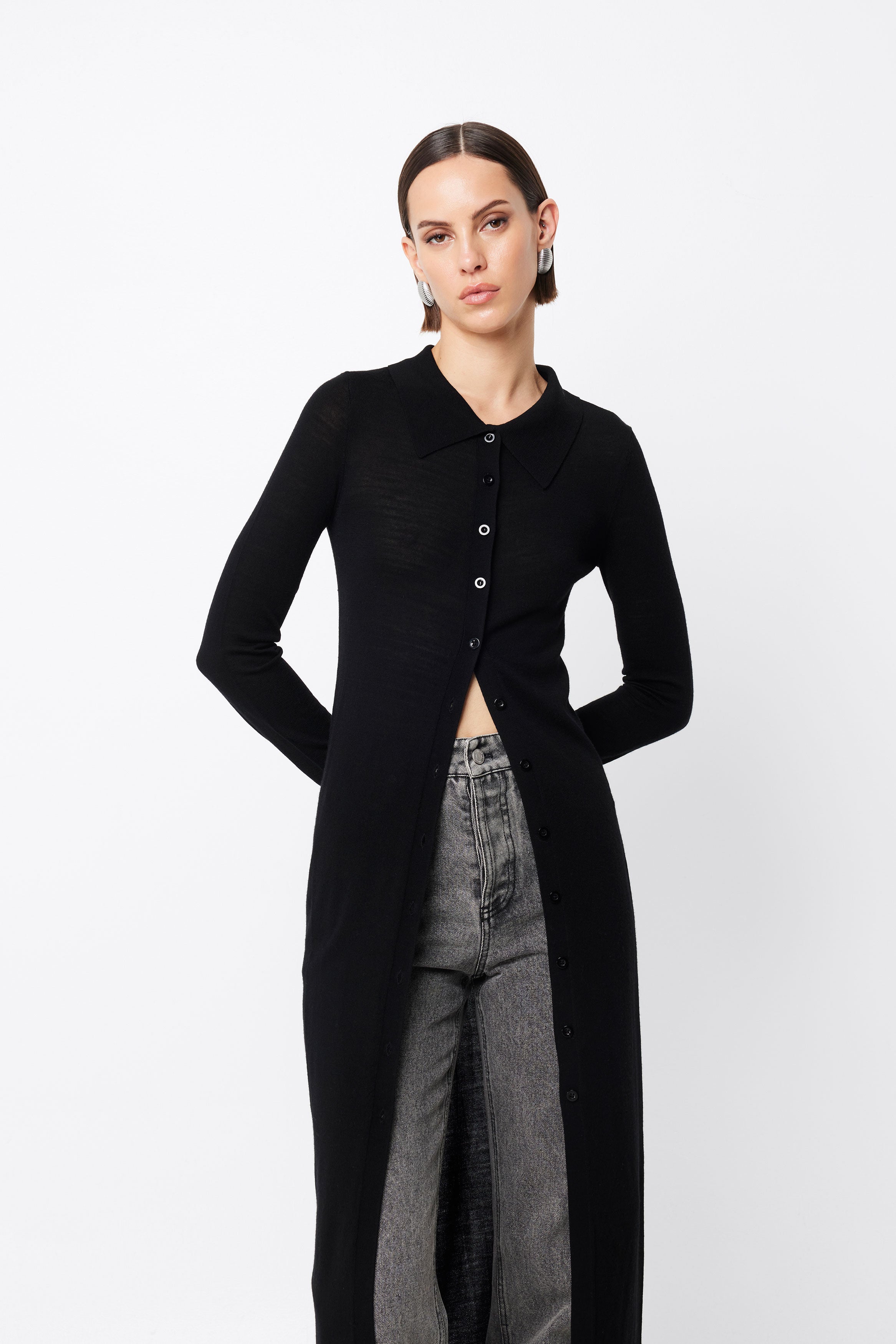 The Maine Longline Cardigan in Black is a versatile layering essential. Crafted from soft 100% merino wool, it features a collared neckline, a self-colored button front, and a fine-stitch texture for subtle movement. With a sleek longline silhouette, it offers breathable warmth and effortless style. Pair it with your wardrobe staples for a polished yet relaxed look.