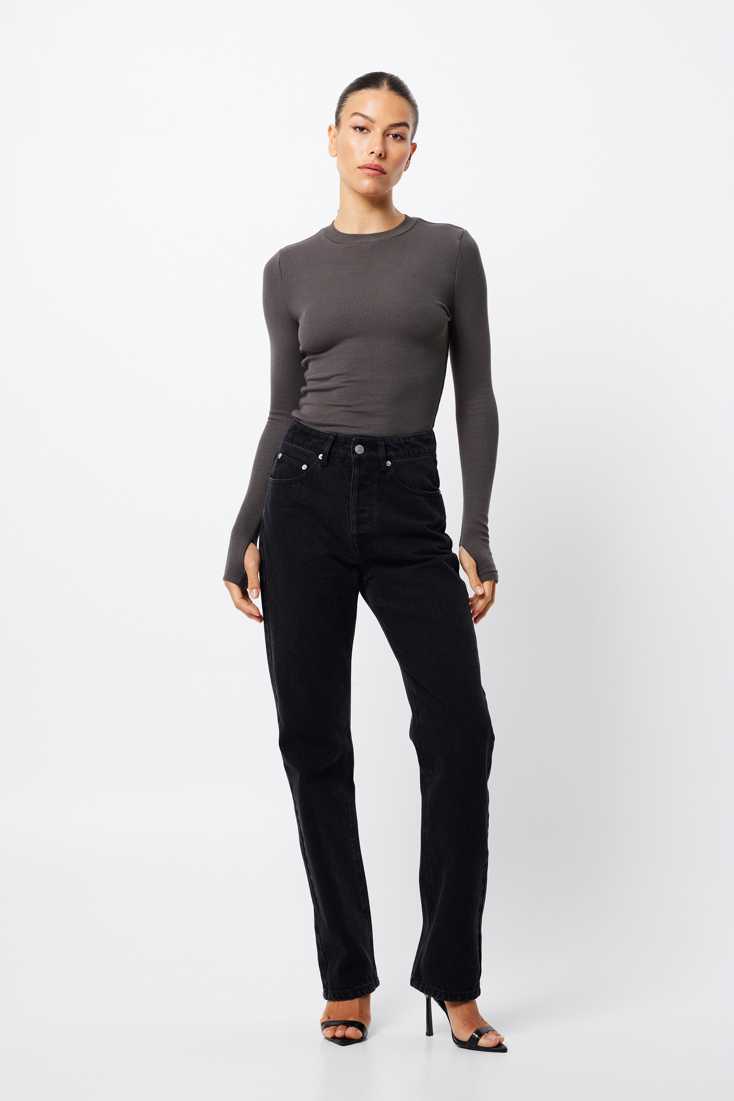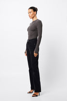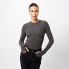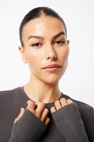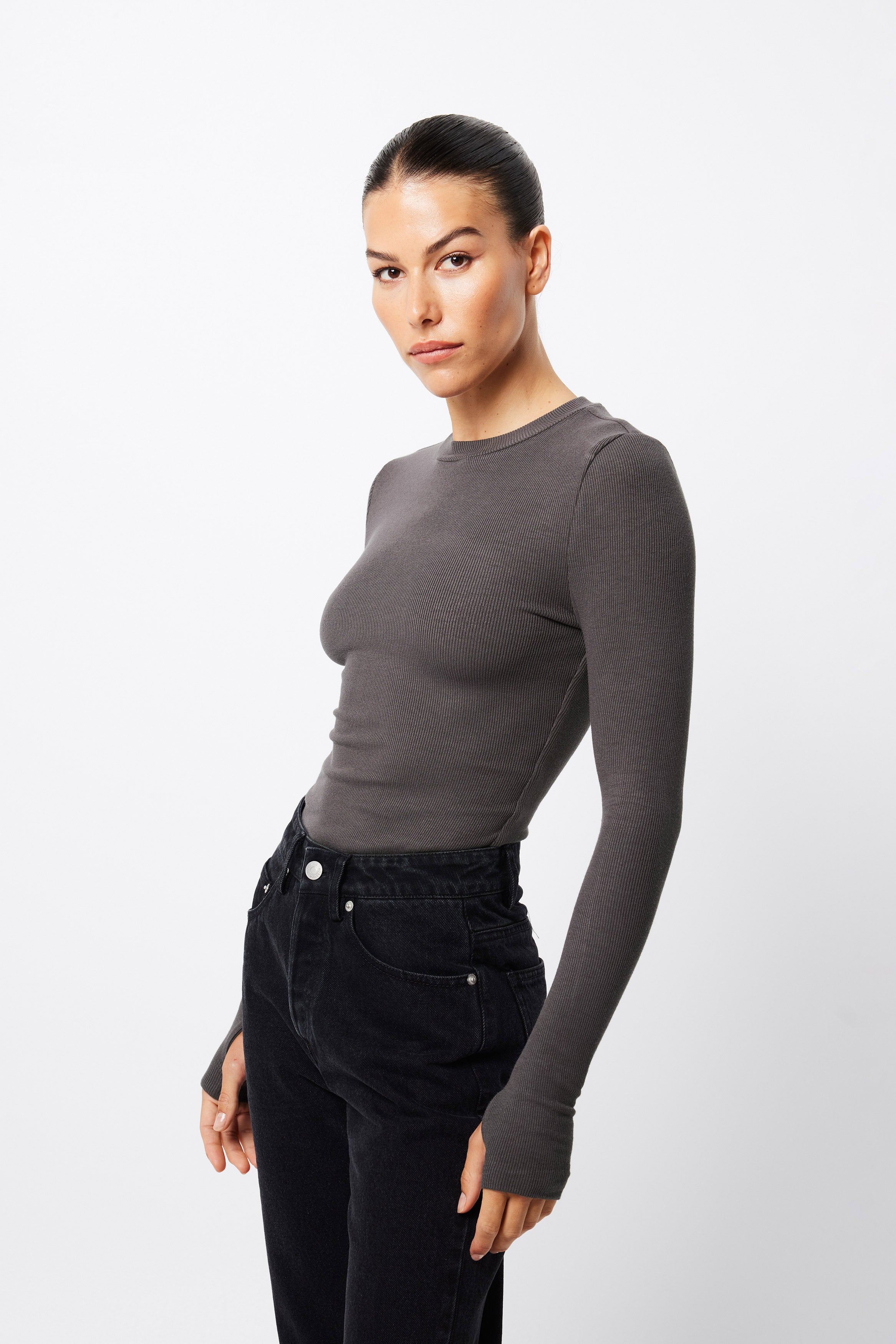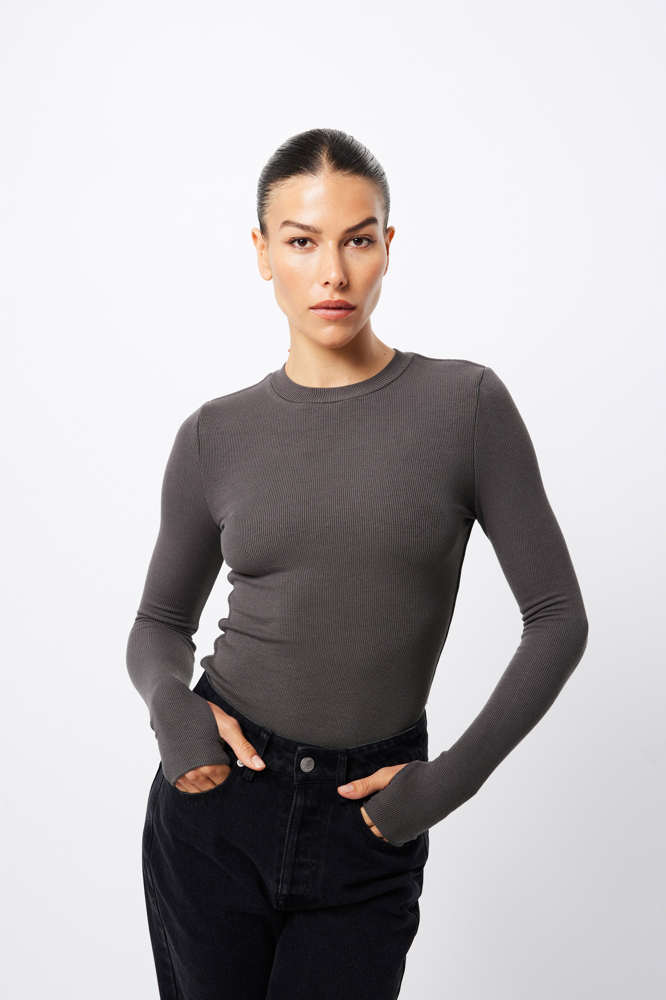 The Brooklyn Top in charcoal is your new go to ribbed jersey piece. This extremely soft double layered, lightweight top features a high round neckline and long sleeves with thumb openings. The top is conveniently designed to be paired with existing pieces in your wardrobe.
