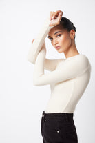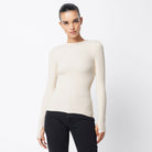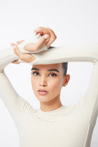 The Brooklyn Top in natural is your new go to ribbed jersey piece. This extremely soft double layered, lightweight top features a high round neckline and long sleeves with thumb openings. The top is conveniently designed to be paired with existing pieces in your wardrobe.