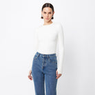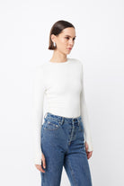 The Brooklyn Top in white is your new go to ribbed jersey piece. This extremely soft double layered, lightweight top features a high round neckline and long sleeves with thumb openings. The top is conveniently designed to be paired with existing pieces in your wardrobe.