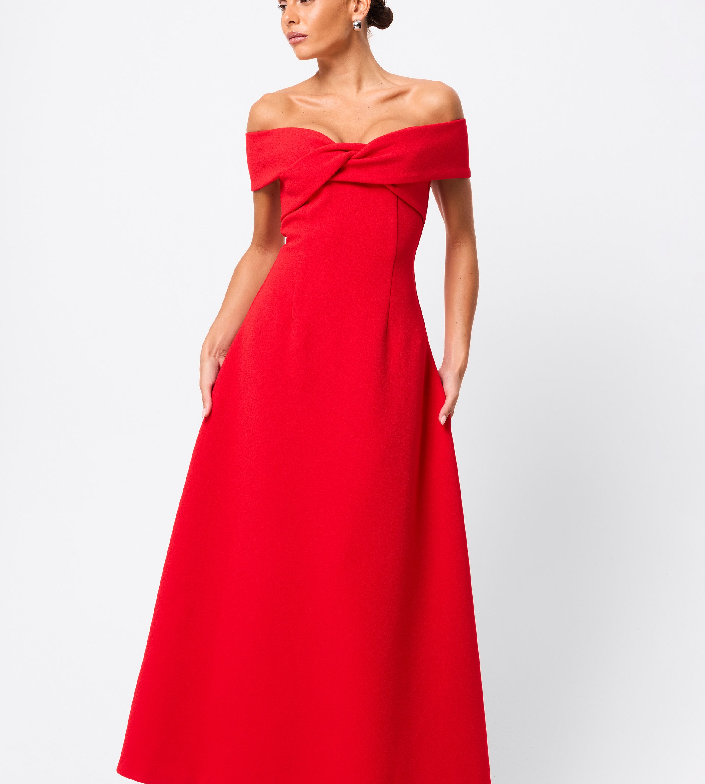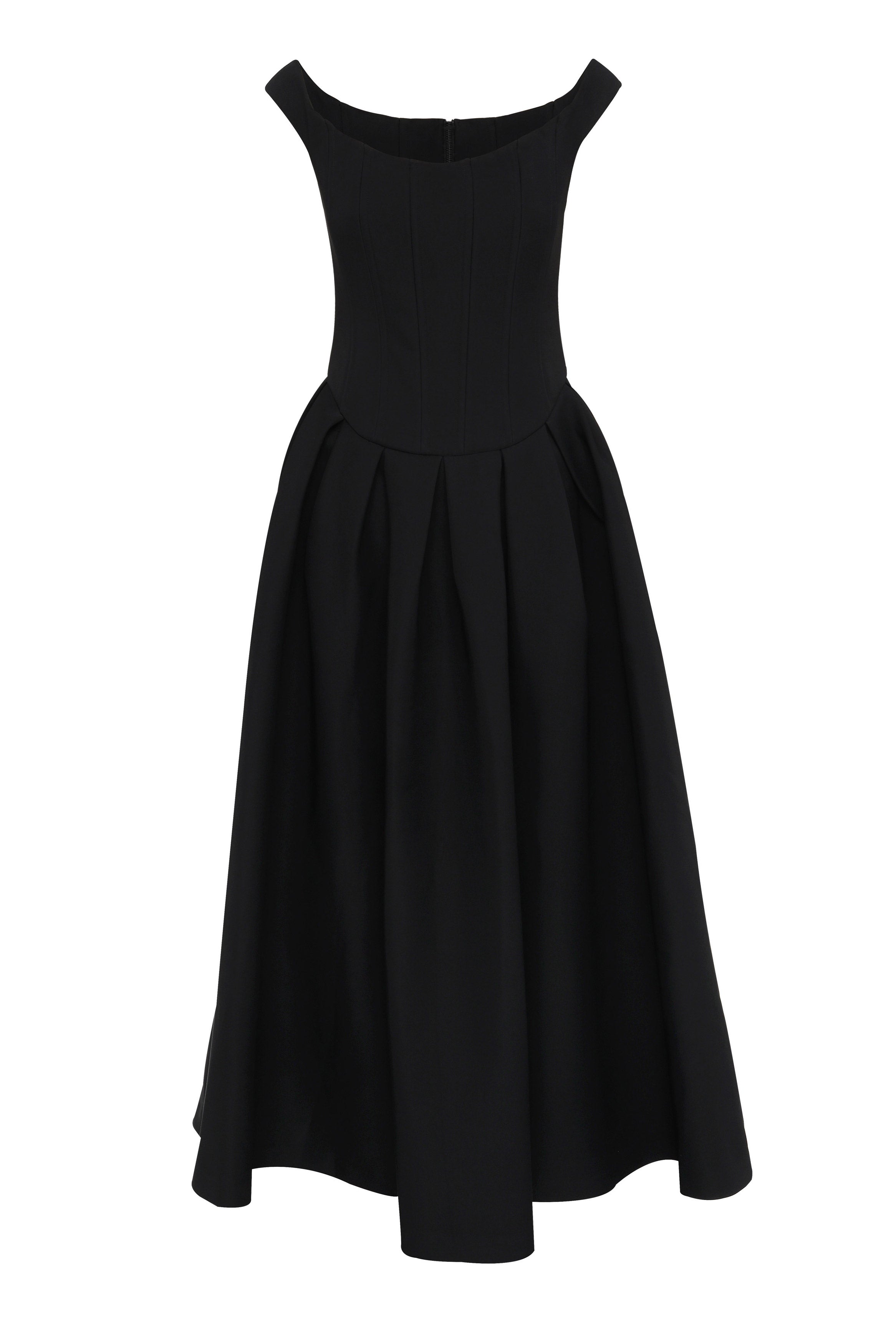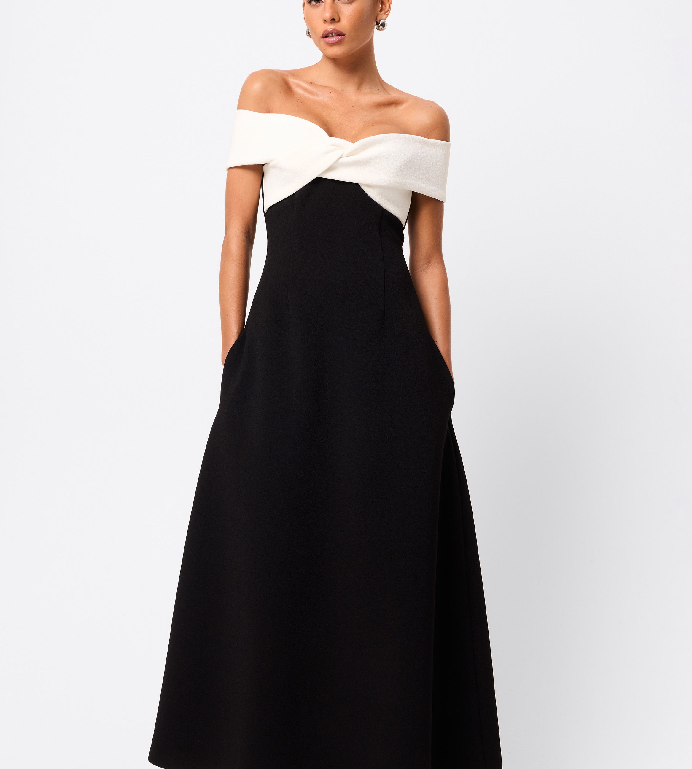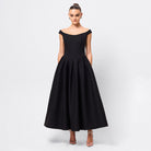 Embrace modern femininity with the Adoration Maxi Dress in Black. Inspired by classic corsetry, this striking silhouette features an off-shoulder neckline and a fitted, boned bodice that flows into a full-length A-line skirt. Designed with a pleated waistline, functional side pockets, and an exposed centre-back zip, it offers both structure and ease. Flattering on all body types, this timeless style is an elegant staple that will remain a wardrobe favourite for seasons to come.