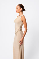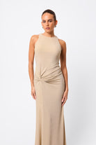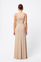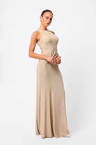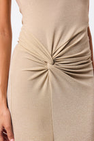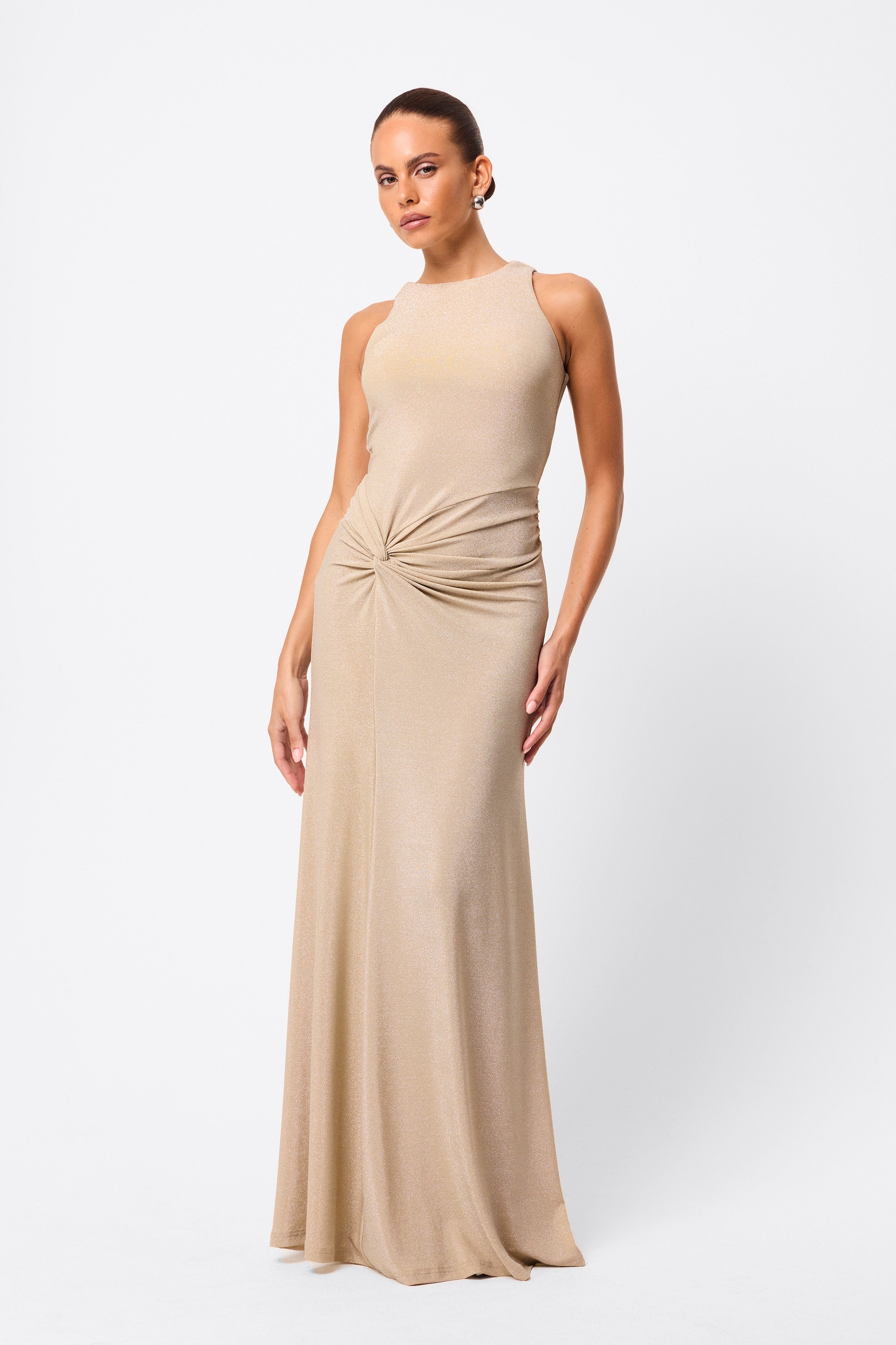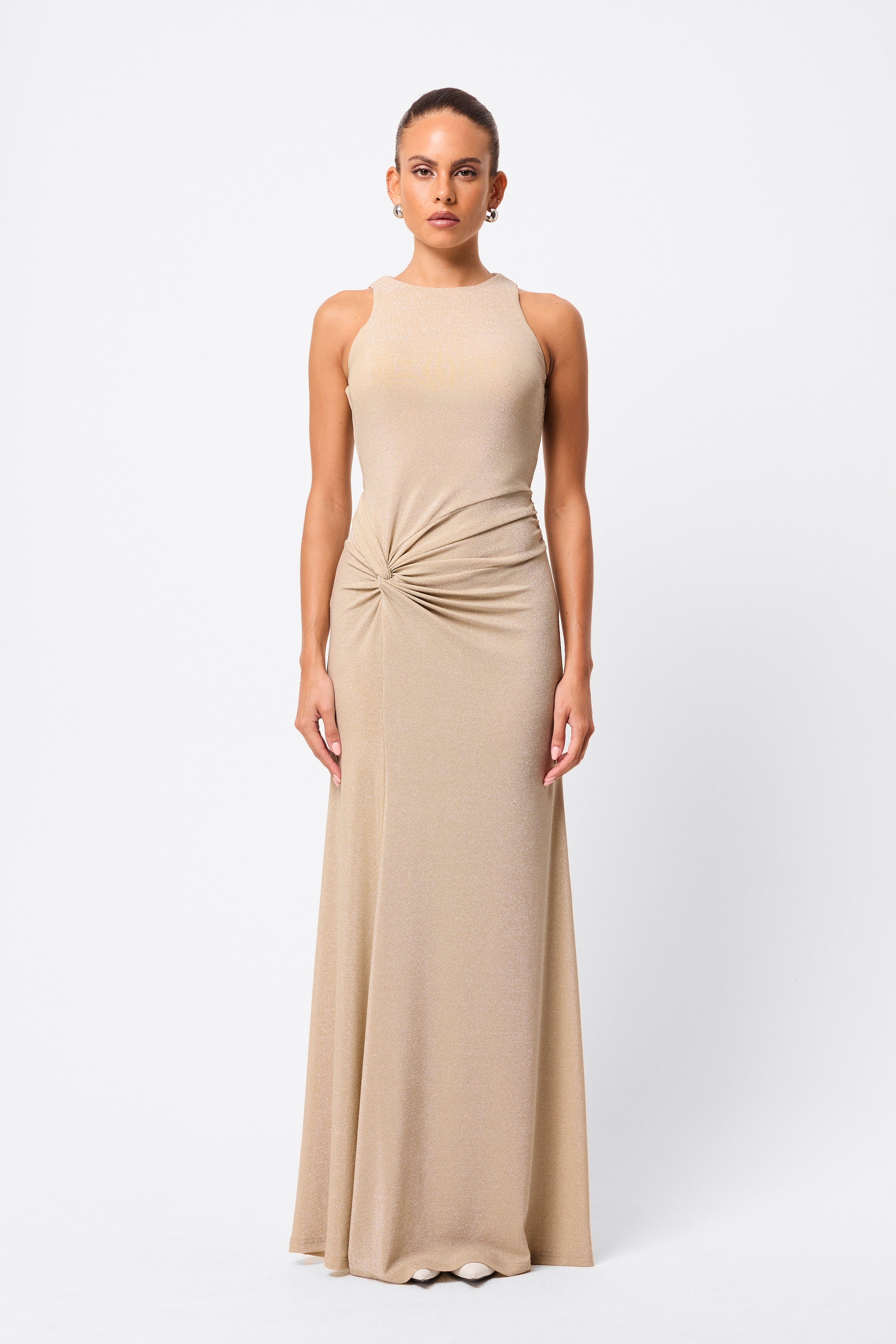 Radiate sophistication in the Adore You Maxi Dress. This sleek silhouette fuses modern elegance with timeless glamour. Crafted from premium metallic jersey, the design moves fluidly with the body while shimmering under the light. A racer neckline and sleeveless cut create clean, contemporary lines, while the twist detail at the waist sculpts the figure before falling into a soft, flared skirt for graceful movement. Perfect for cocktail parties and formal events, this form-fitting style pairs effortlessly with statement jewellery and heels for an unforgettable finish.