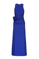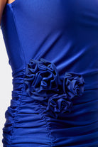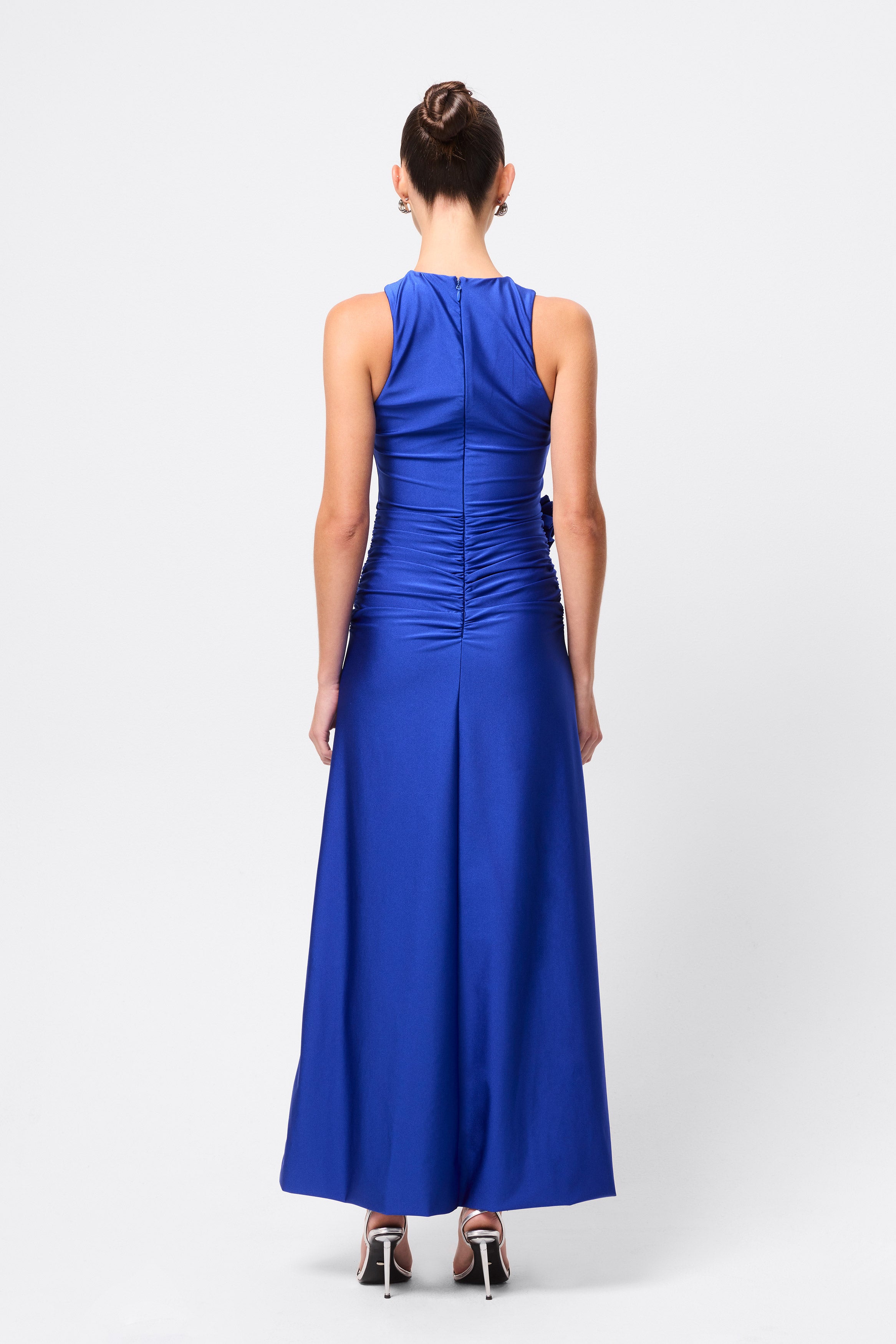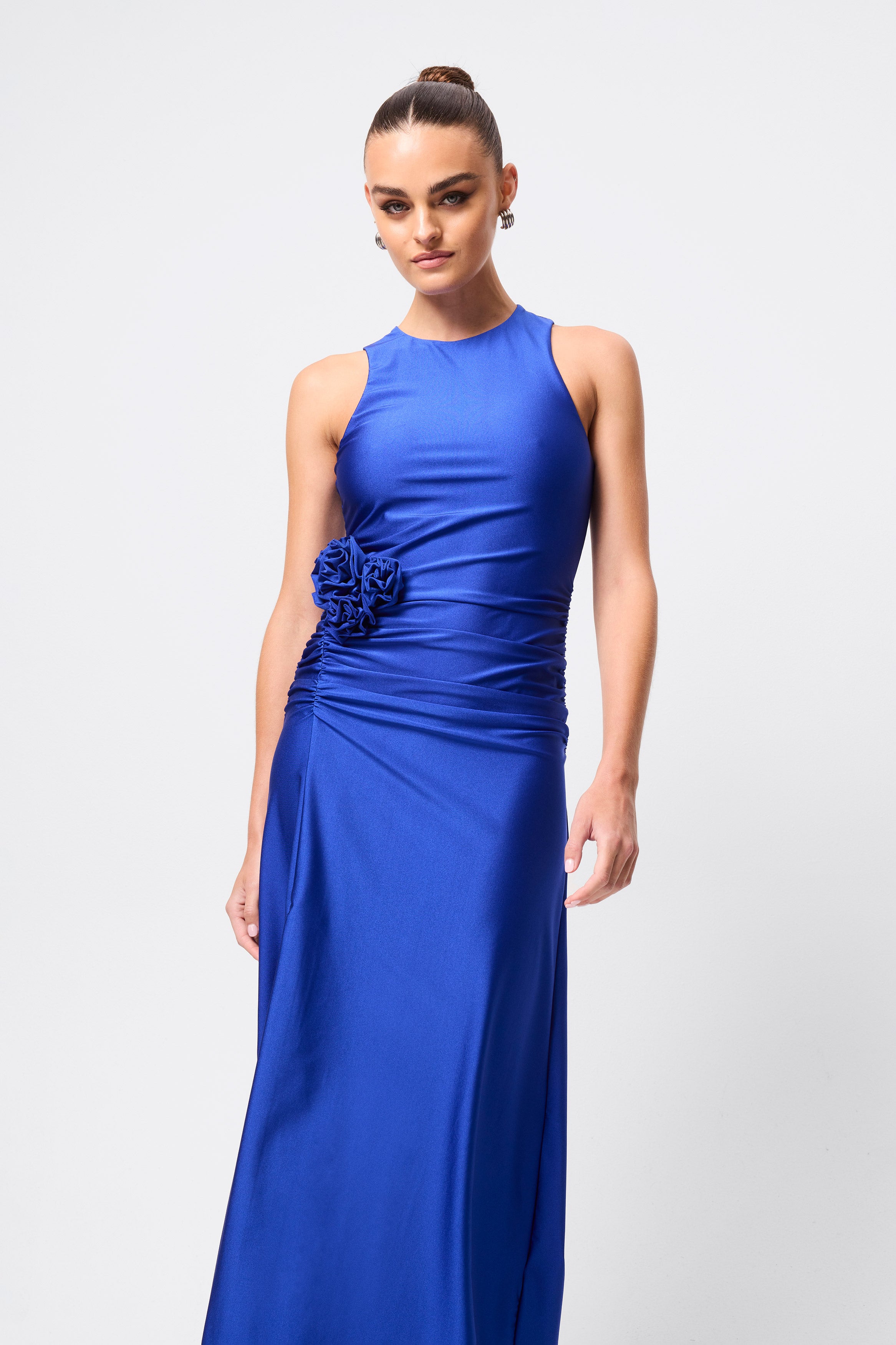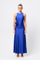 Eye-catching and elegant, the Love Again Maxi Dress in Cobalt is crafted from a premium stretch Lycra blend with a subtle sheen, designed to flatter the body. With a round neckline and racerback, this fitted style has gathered details at the waist to shape and flatter the body. Delicate hand-sewn rosettes adorn the waistline, adding a romantic contrast to the bold side split and A-line skirt. Fitted through the torso and flowing at the hem, this piece brings drama and refinement in equal measure. Just add heels and a clutch for an effortlessly polished evening or event-ready look.
