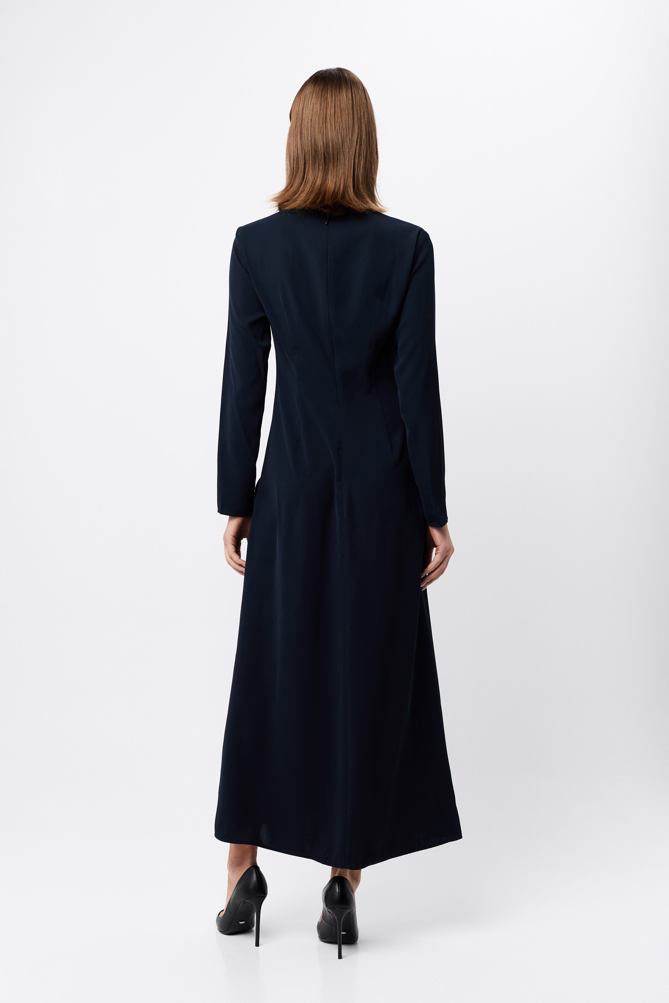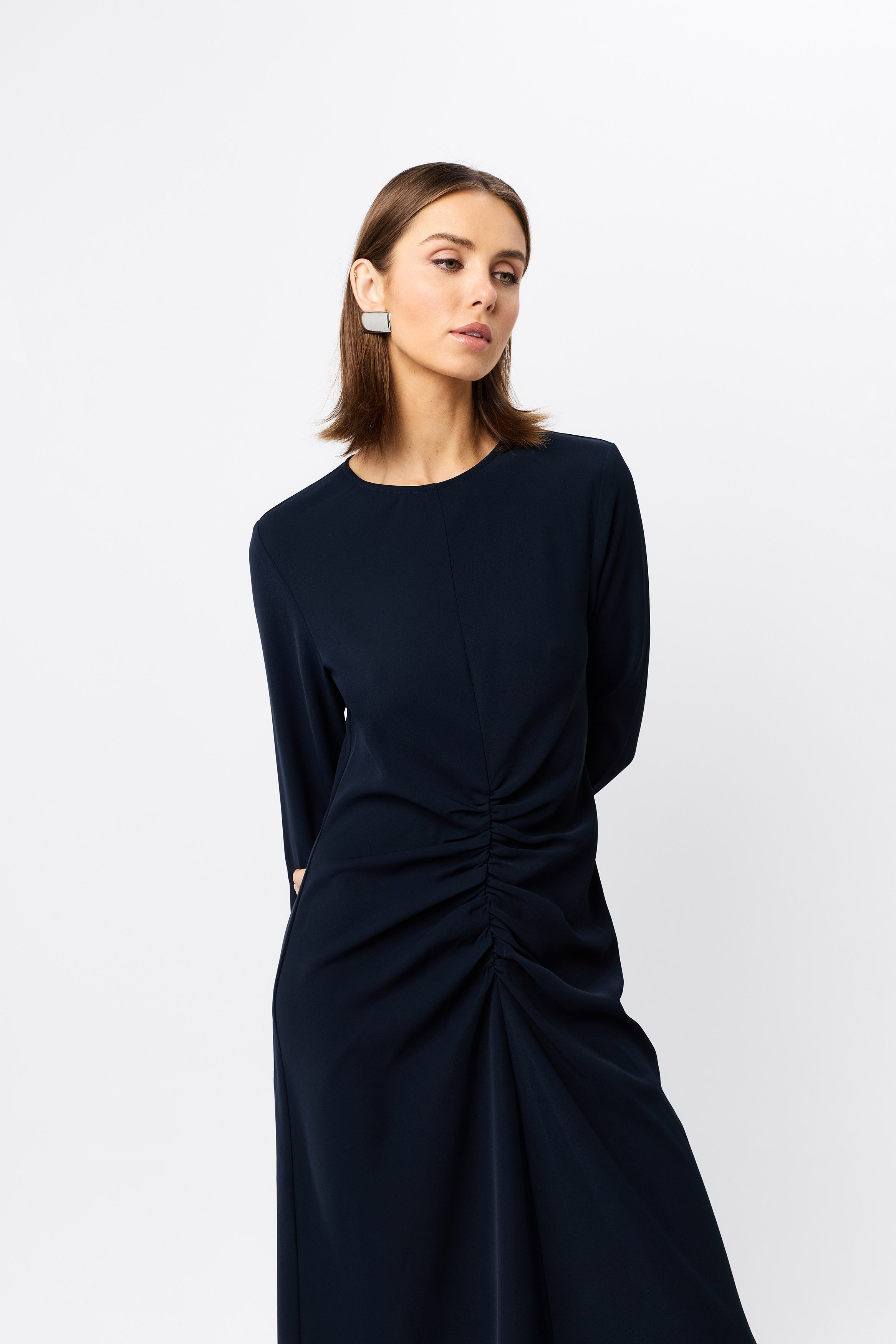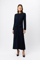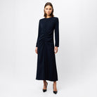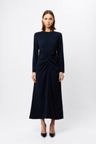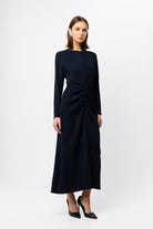 The Never Enough Maxi Dress in timeless navy delivers elegance with a contemporary twist. Featuring a round neckline, long sleeves, and fixed ruching detail through the torso, this dress has a body-skimming silhouette for a flattering fit. This dress can be styled for a range of occasions, ideal for weddings and special celebrations.