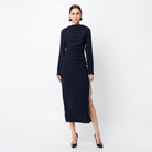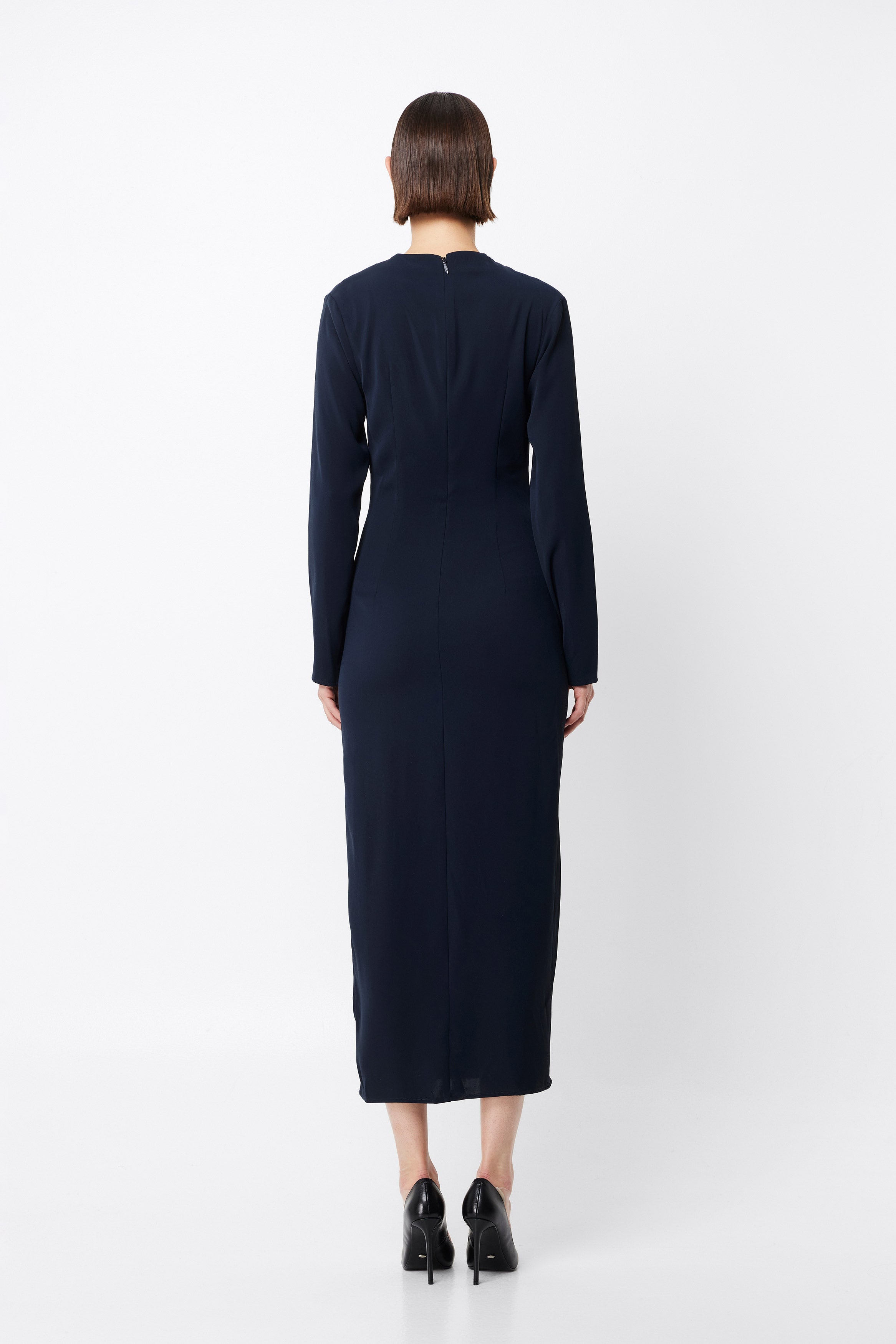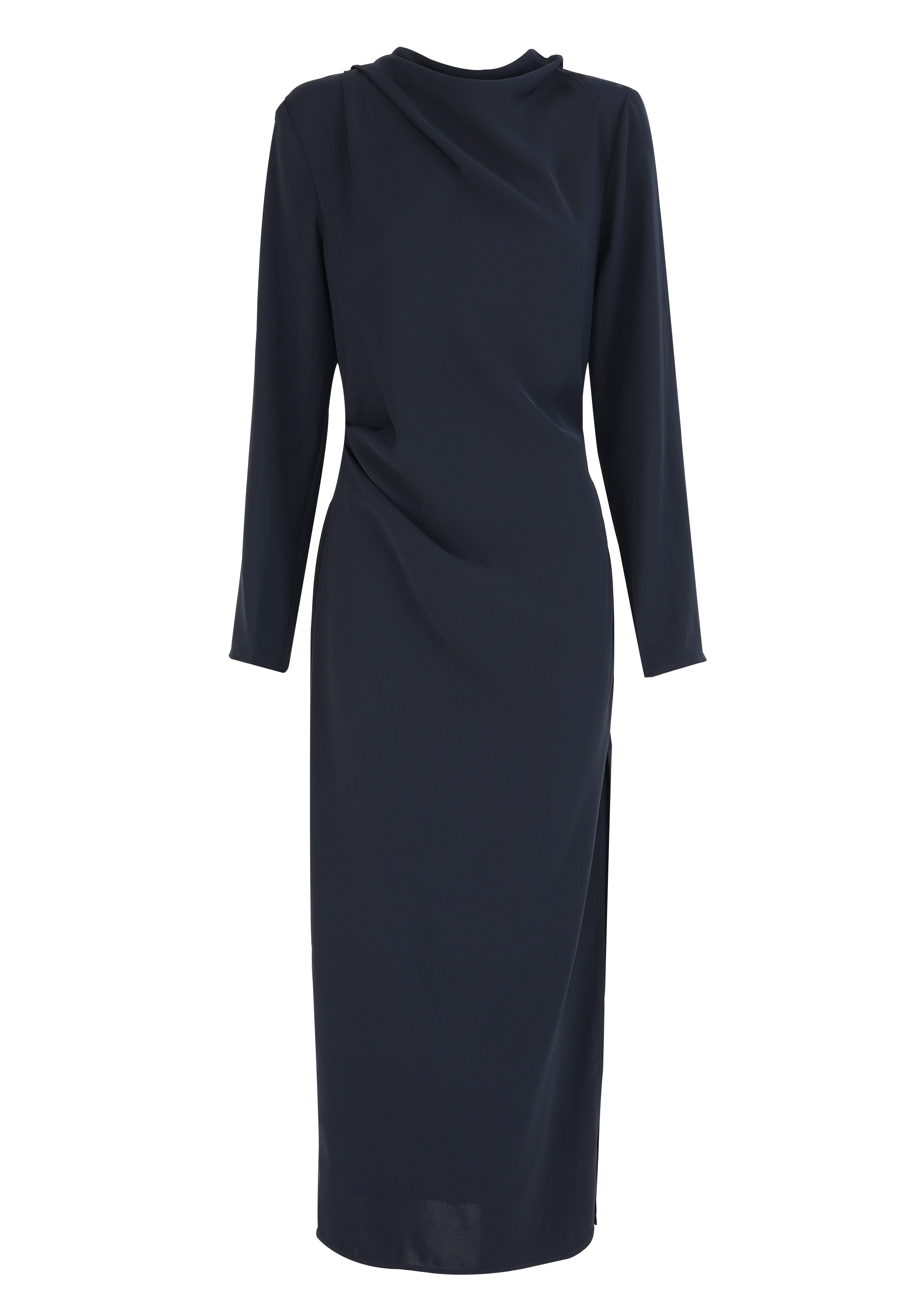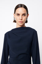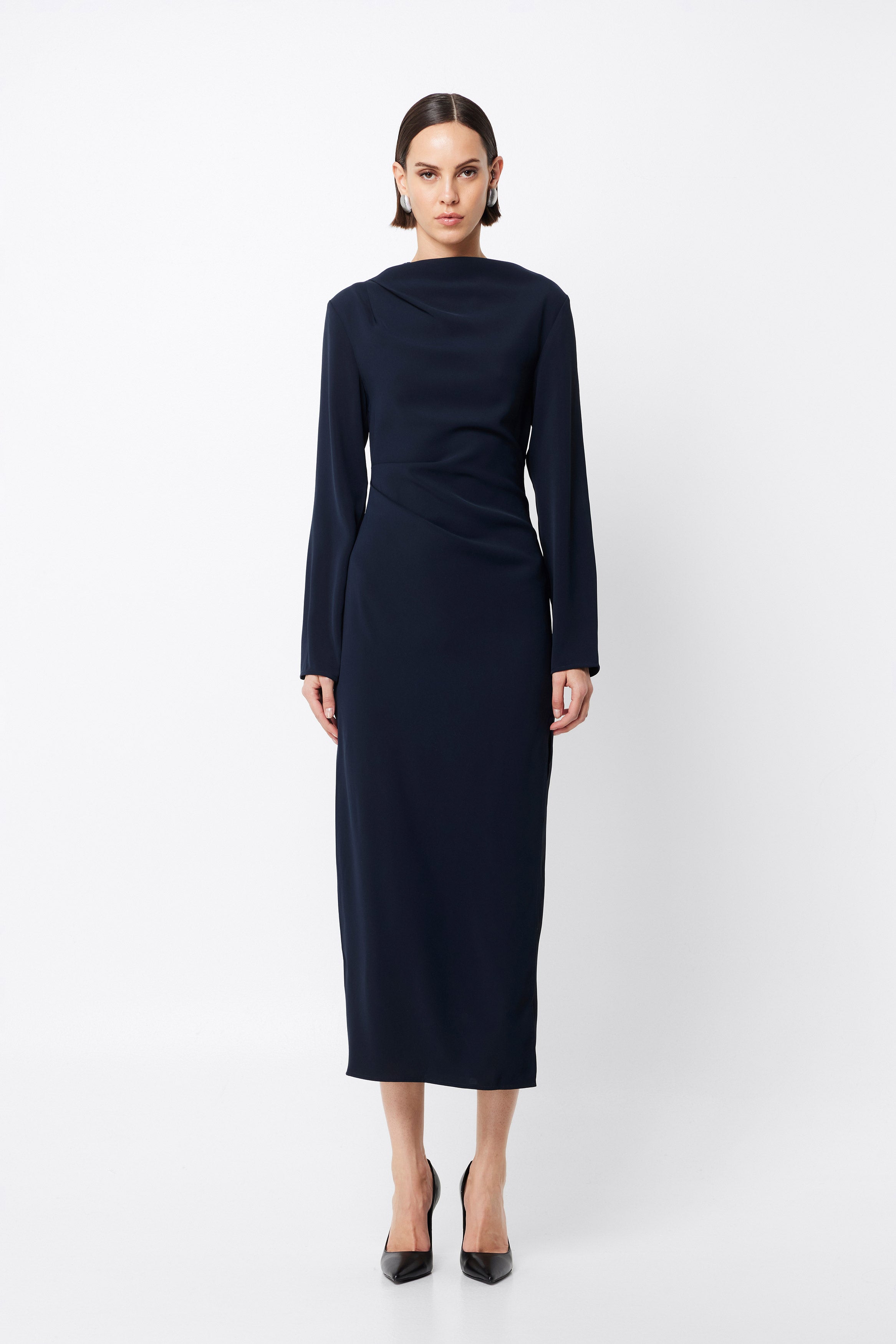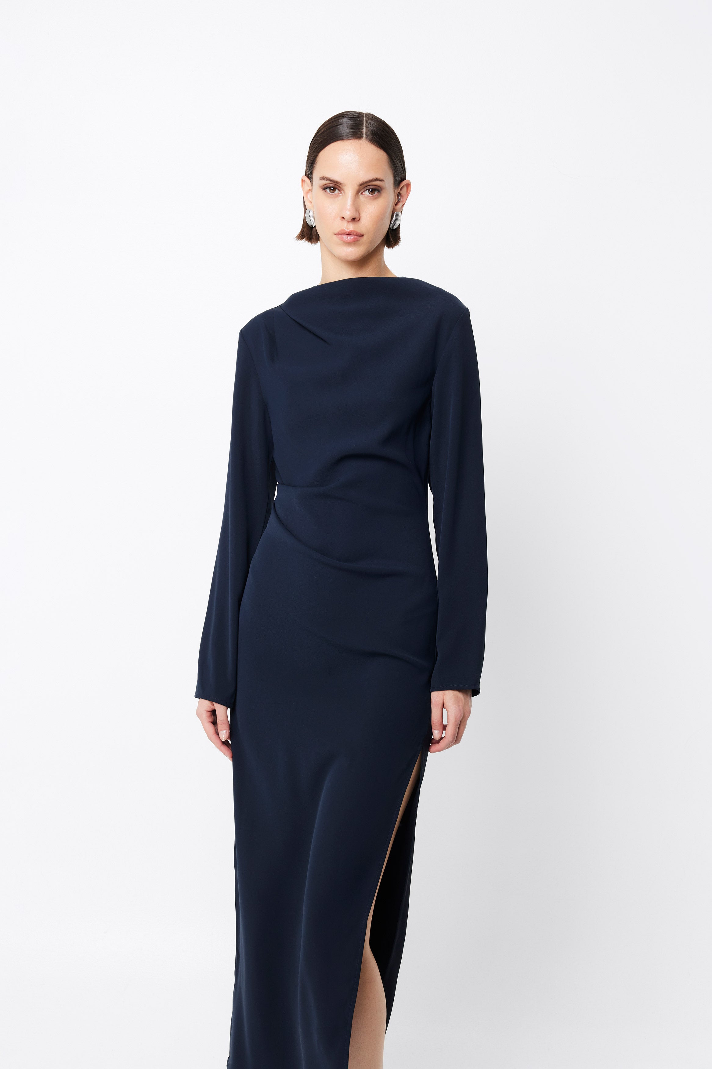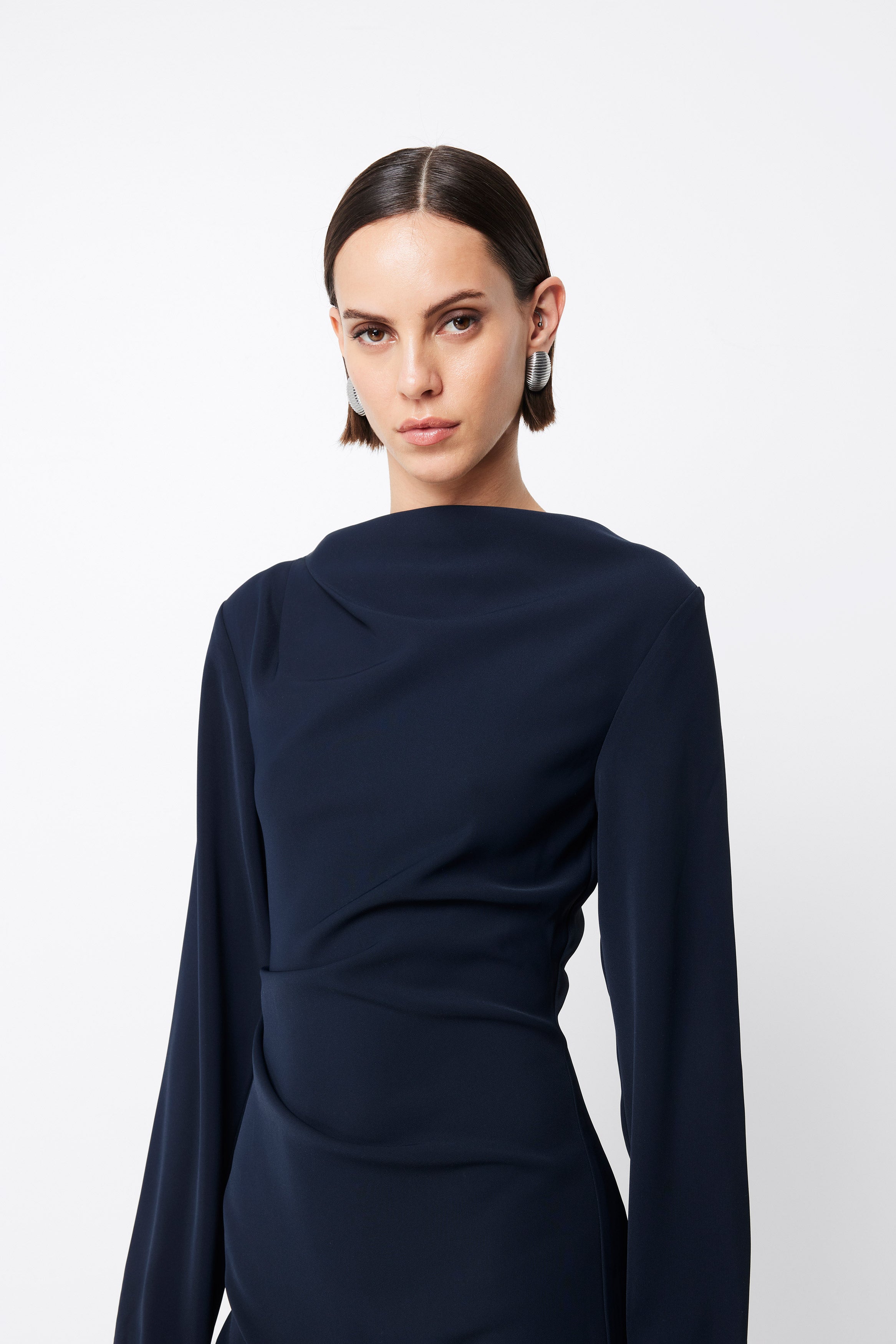 Draped from a lightweight luxe fabric, the Sense Of You Maxi Dress in Navy embodies a simple and sophisticated style. The dress is highlighted by its soft draped detailing across the body, high neckline, and relaxed long sleeves. For a contemporary approach, pair it with a bold platform heel.