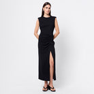 A modern interpretation of effortless sophistication, the Solide Midi Dress in Black brings refined simplicity to everyday dressing. Crafted from a soft, structured fabrication, this sleeveless silhouette features a crew neckline, padded shoulders for definition, and an asymmetric ruched detail that flatters the waist. A front side split adds subtle allure, balancing ease and edge. Designed for versatility, this piece transitions seamlessly from day to night — pair with minimalist accessories for a polished, contemporary finish.