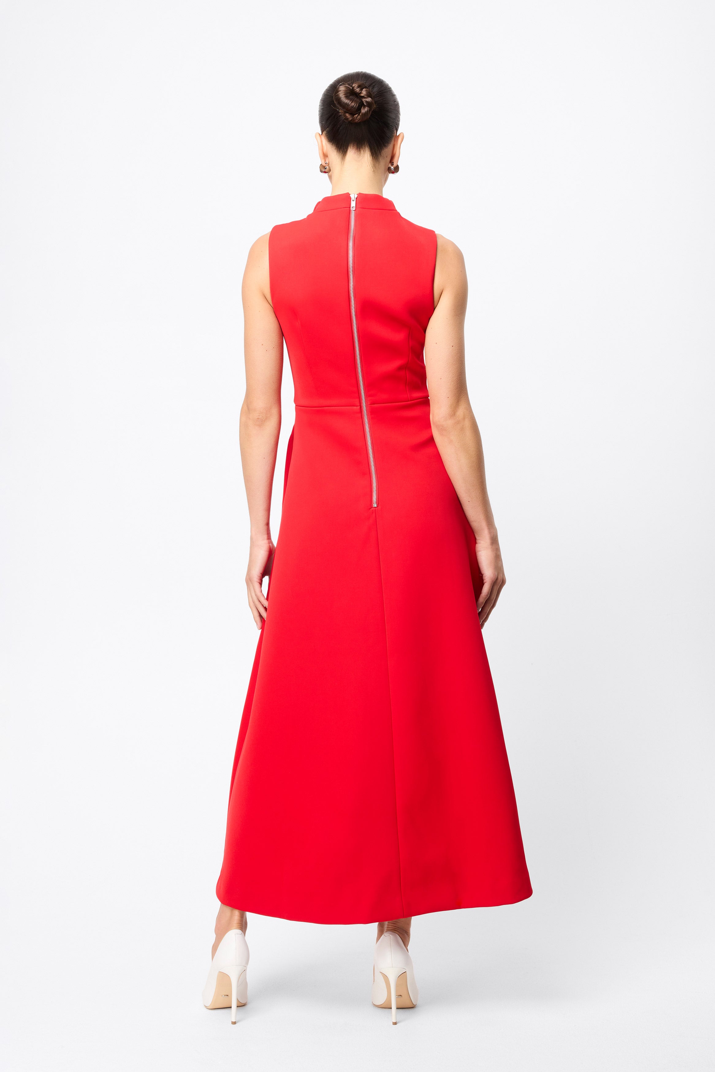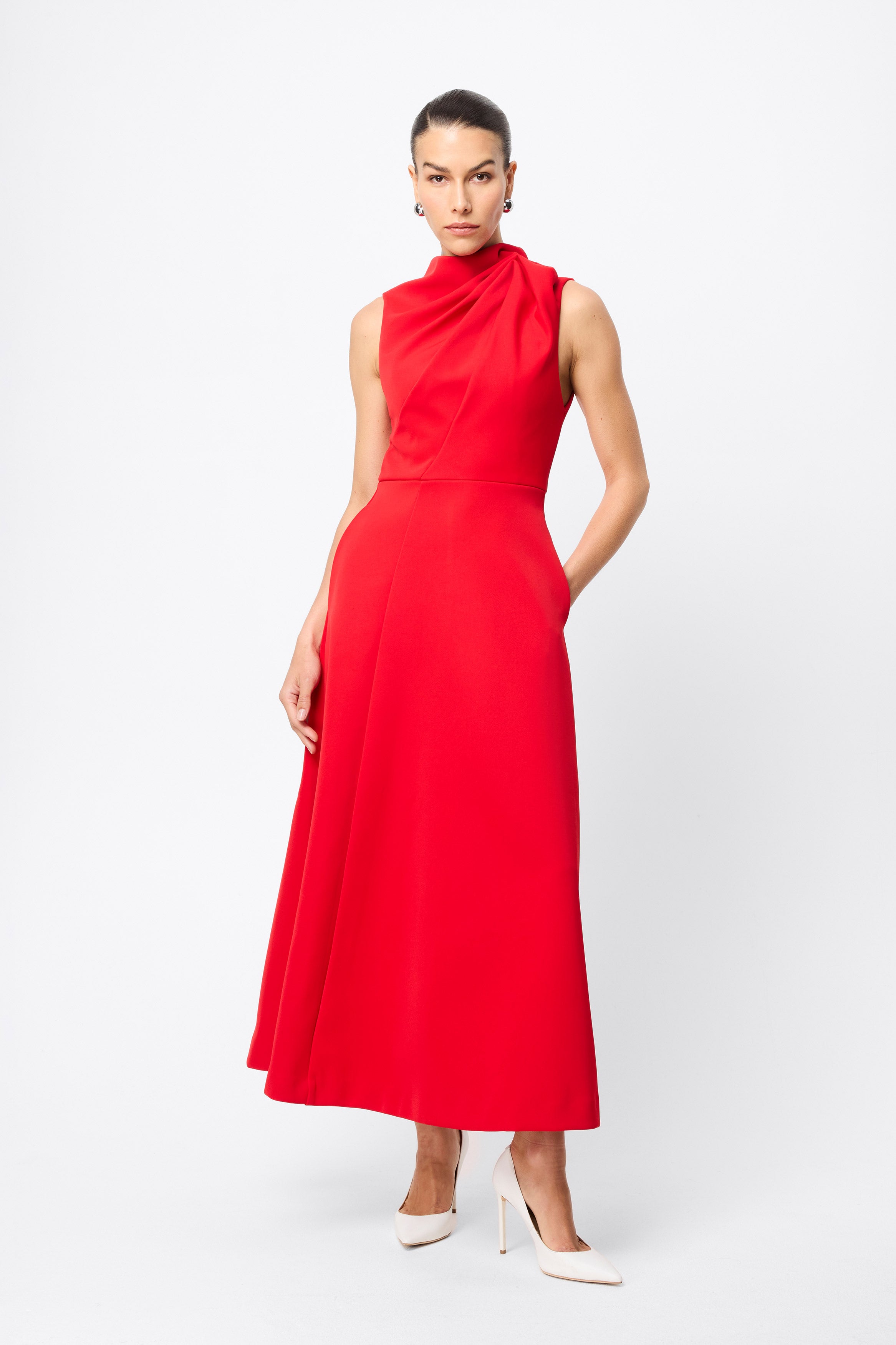 Our Cosmic Maxi Dress in red is the epitome of timeless elegance. Featuring a flattering A-line design, this dress includes a draped bodice, shoulder tucks and a defined waistline to accentuate the silhouette. Complete the look with minimalist heels for an effortlessly elegant style for your next formal event.