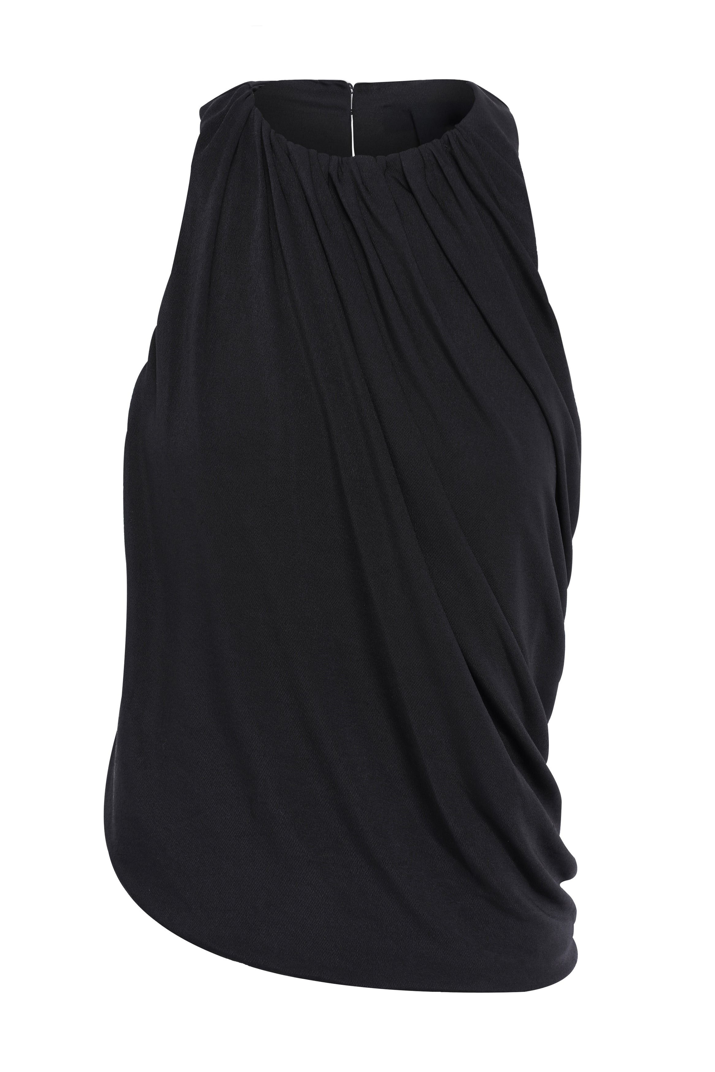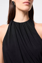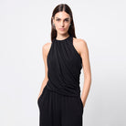 The Free Falling Top in Black embodies effortless sophistication and modern versatility. Crafted from a premium draped jersey fabrication, this sleeveless silhouette features a racer neckline and an asymmetric waist with soft draping that flatters the form. A delicate button closure at the neck adds refined detail, while the fluid shape ensures graceful movement. Perfect for both day and evening, pair it with the Free Falling Pant for a monochromatic look or style it with denim for a relaxed weekend edit.