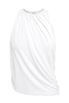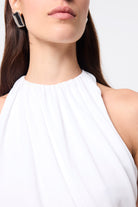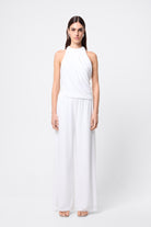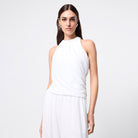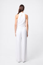 The Free Falling Top in White embodies effortless sophistication and modern versatility. Crafted from a premium draped jersey fabrication, this sleeveless silhouette features a racer neckline and an asymmetric waist with soft draping that flatters the form. A delicate button closure at the neck adds refined detail, while the fluid shape ensures graceful movement. Perfect for both day and evening, pair it with the Free Falling Pant for a monochromatic look or style it with denim for a relaxed weekend edit.
