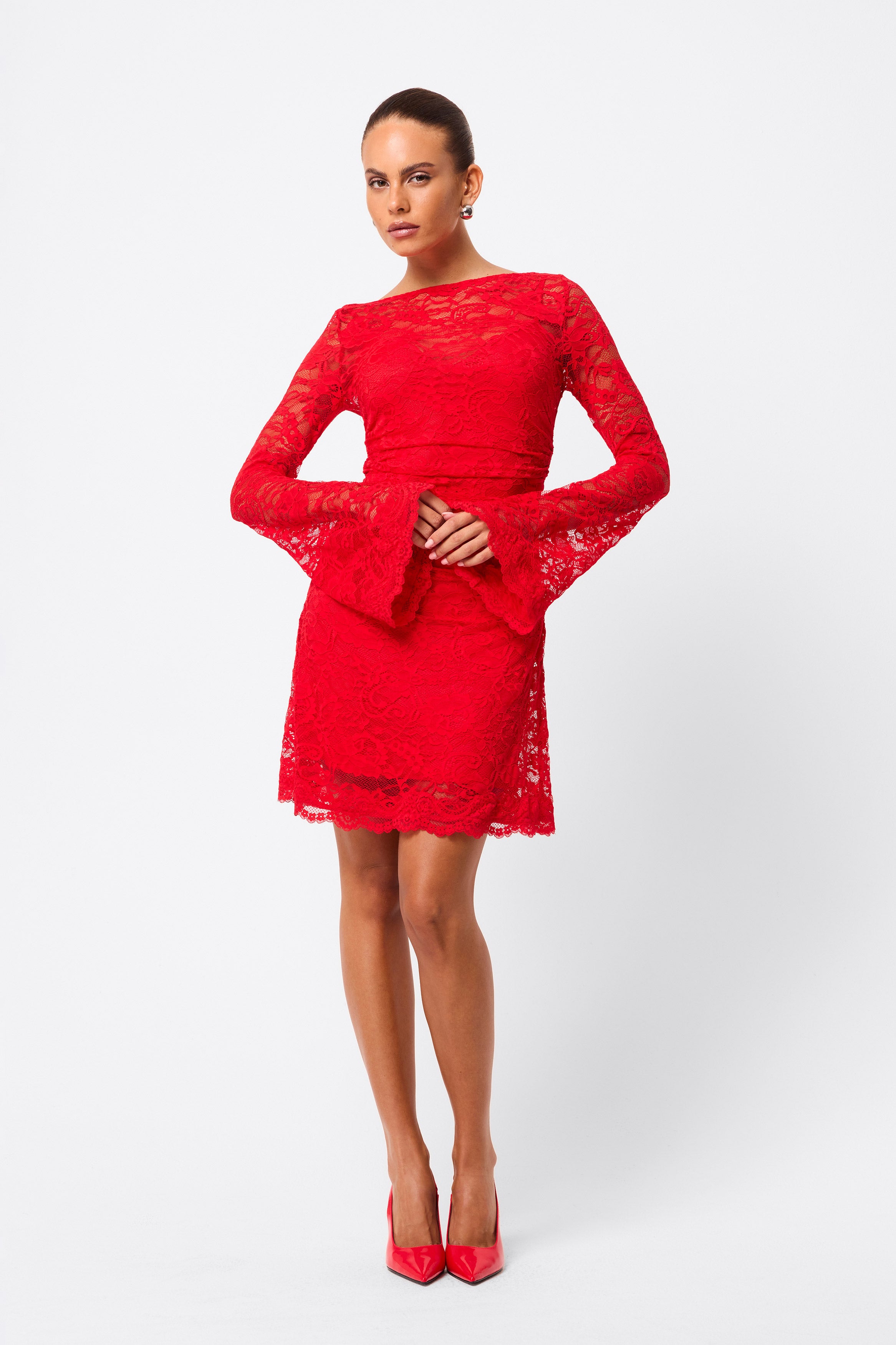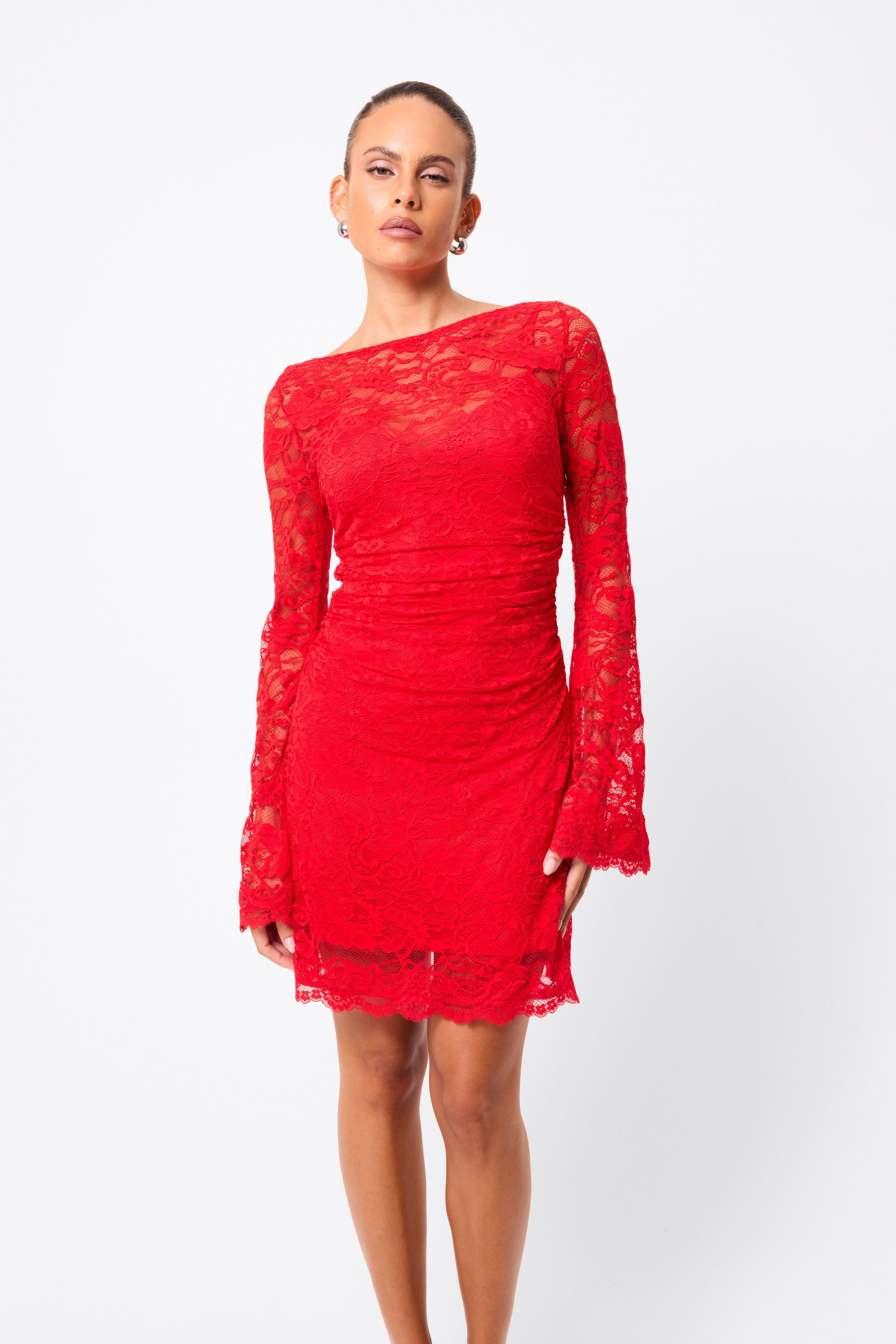 Elevate every occasion in the Laced In Love Mini Dress in Red — the perfect balance of elegance, edge, and allure. Crafted from premium lace, it features a refined boat neckline and soft, flared long sleeves for a romantic yet modern feel. Waist gathers flatter the silhouette, while a scalloped hemline lends delicate detail. Finished with a removable slip lining for comfort and versatility, it transitions effortlessly from evening events to after-dark moments.