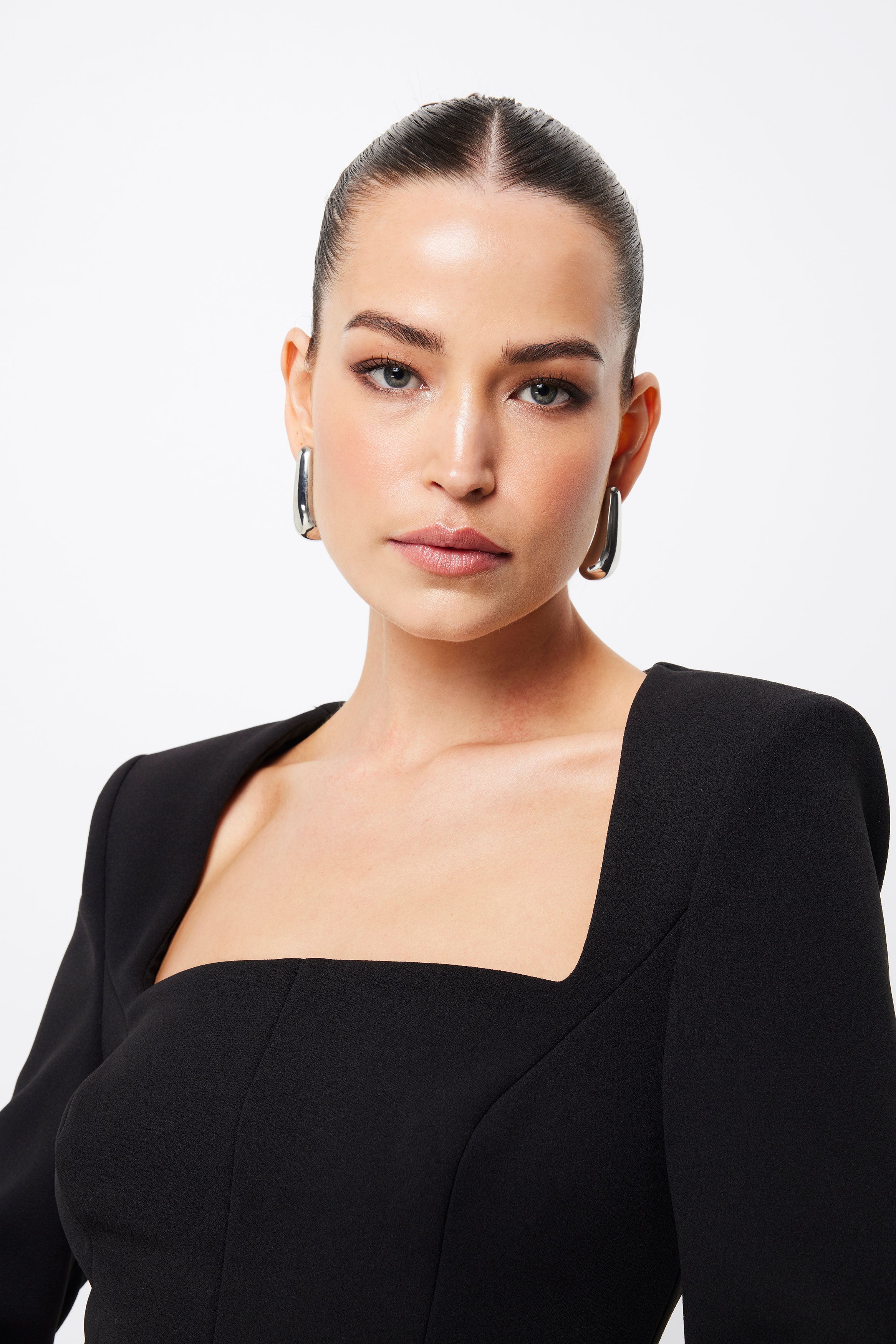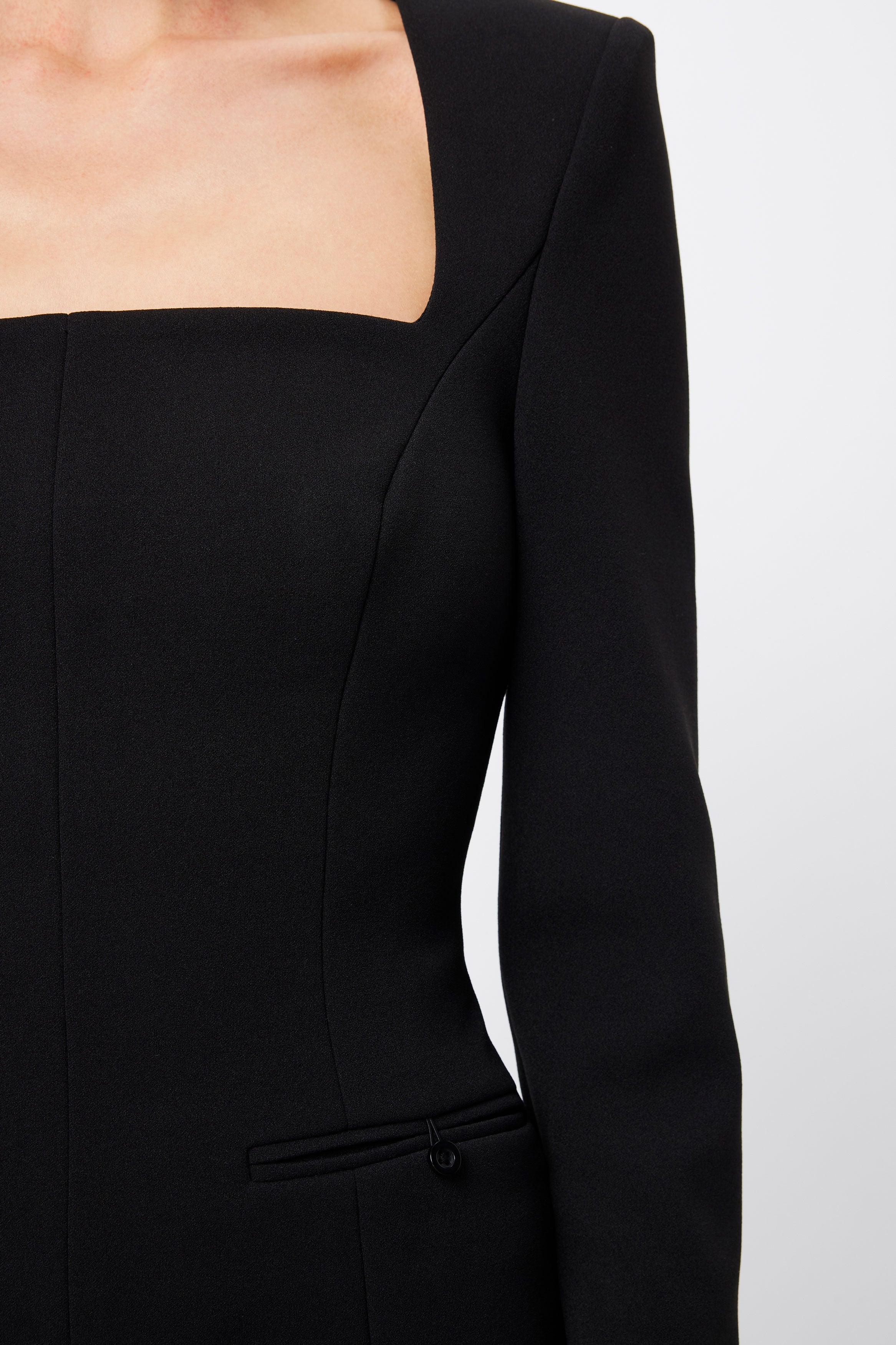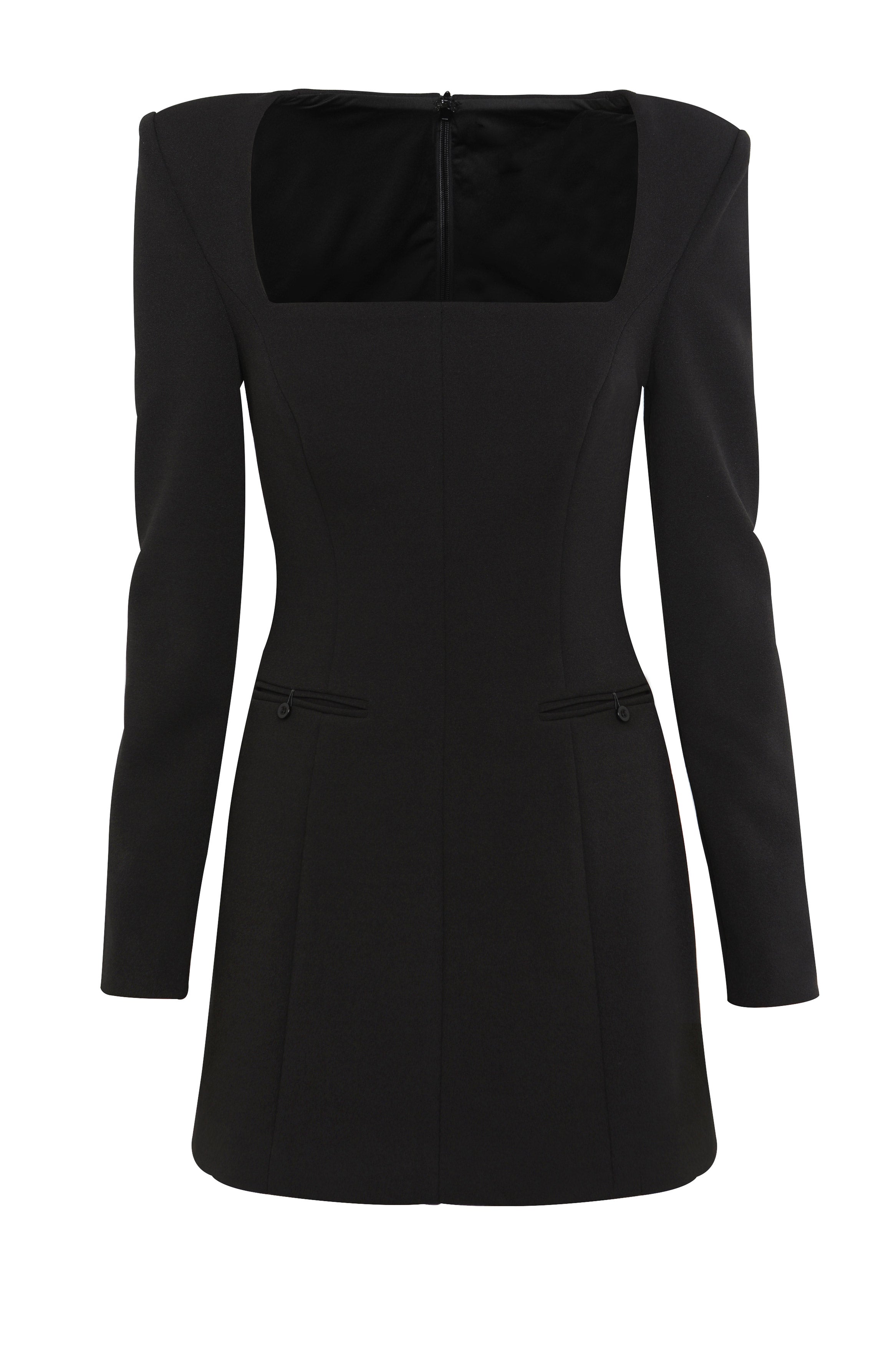 Modern yet timeless, the Origin Mini Dress in Black is designed with a defined shoulder line and form-fitting silhouette. Fully lined for a polished finish, it features a square neckline and faux pocket detailing. Ideal for desk-to-dinner styling, complete the look with a handbag and heels.