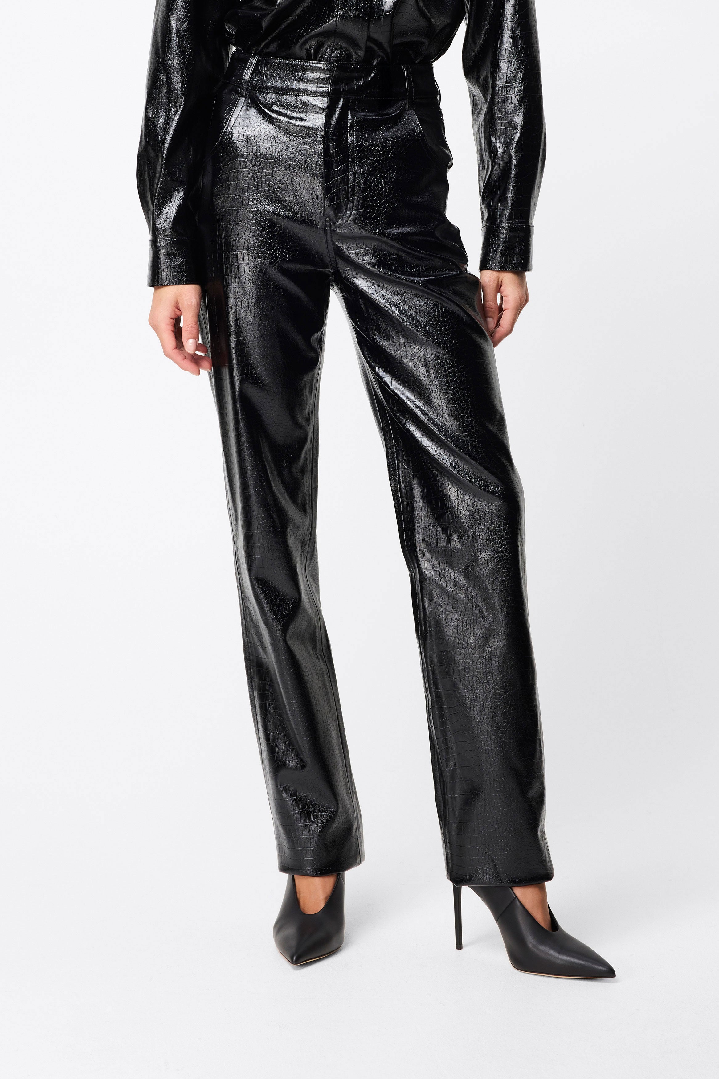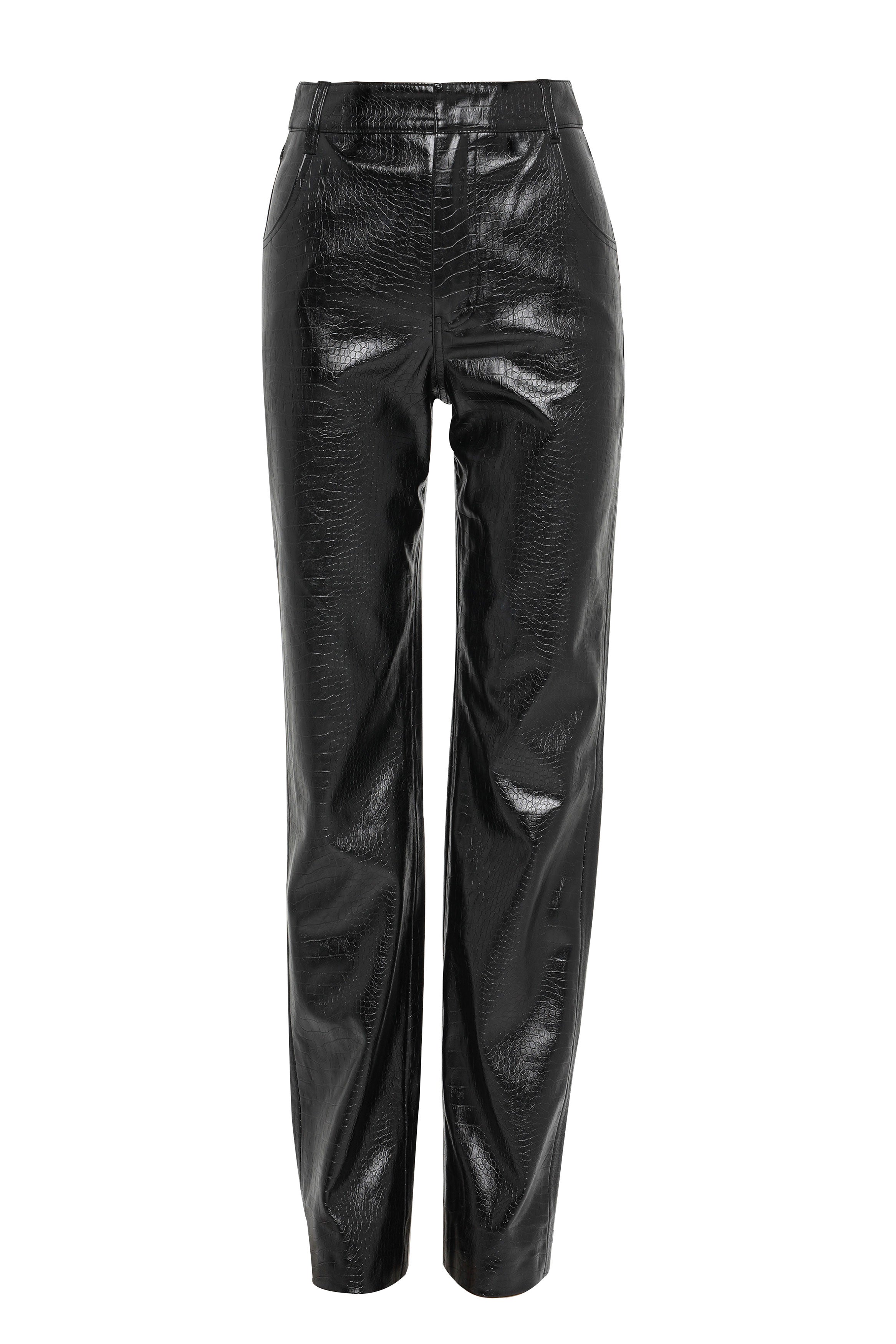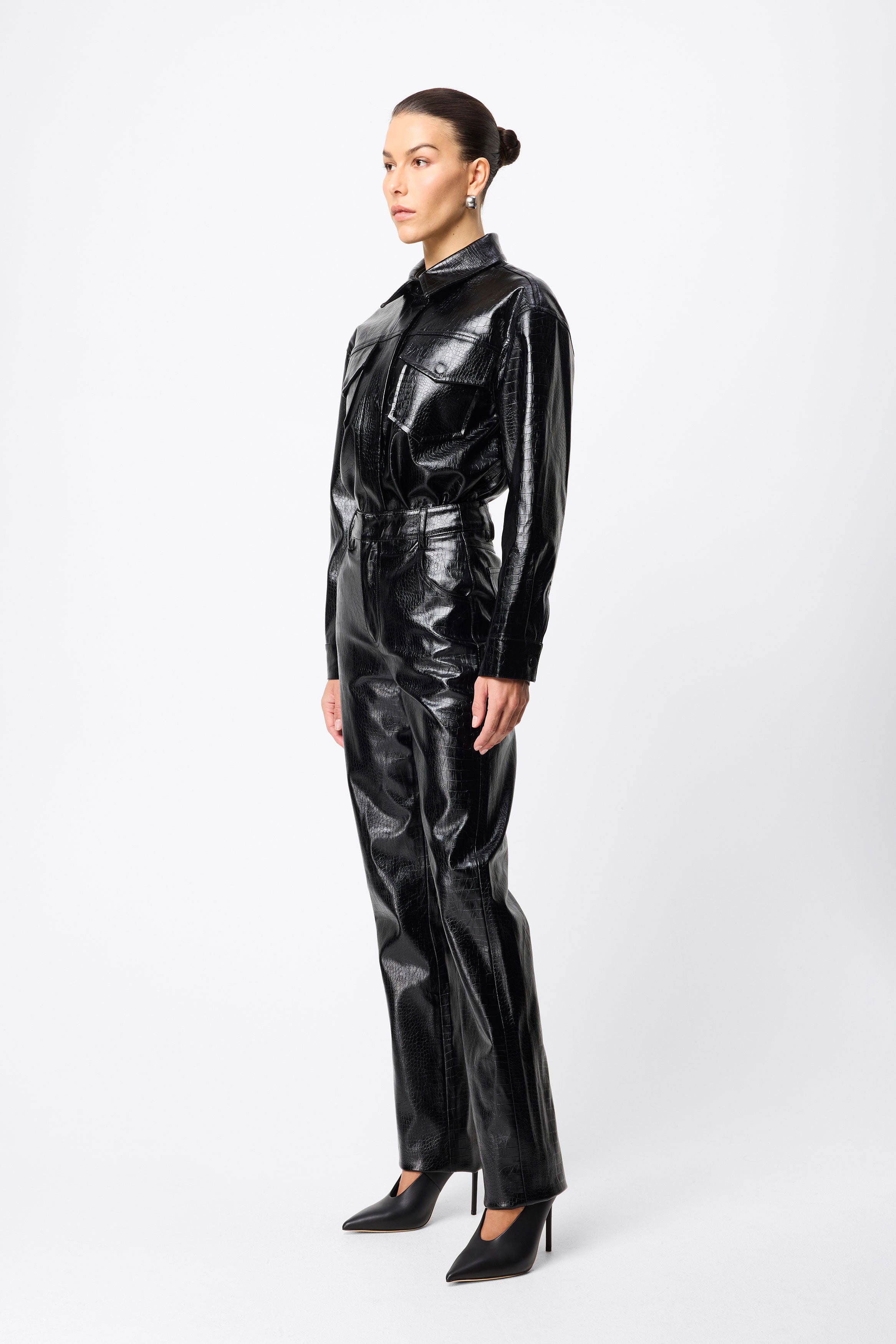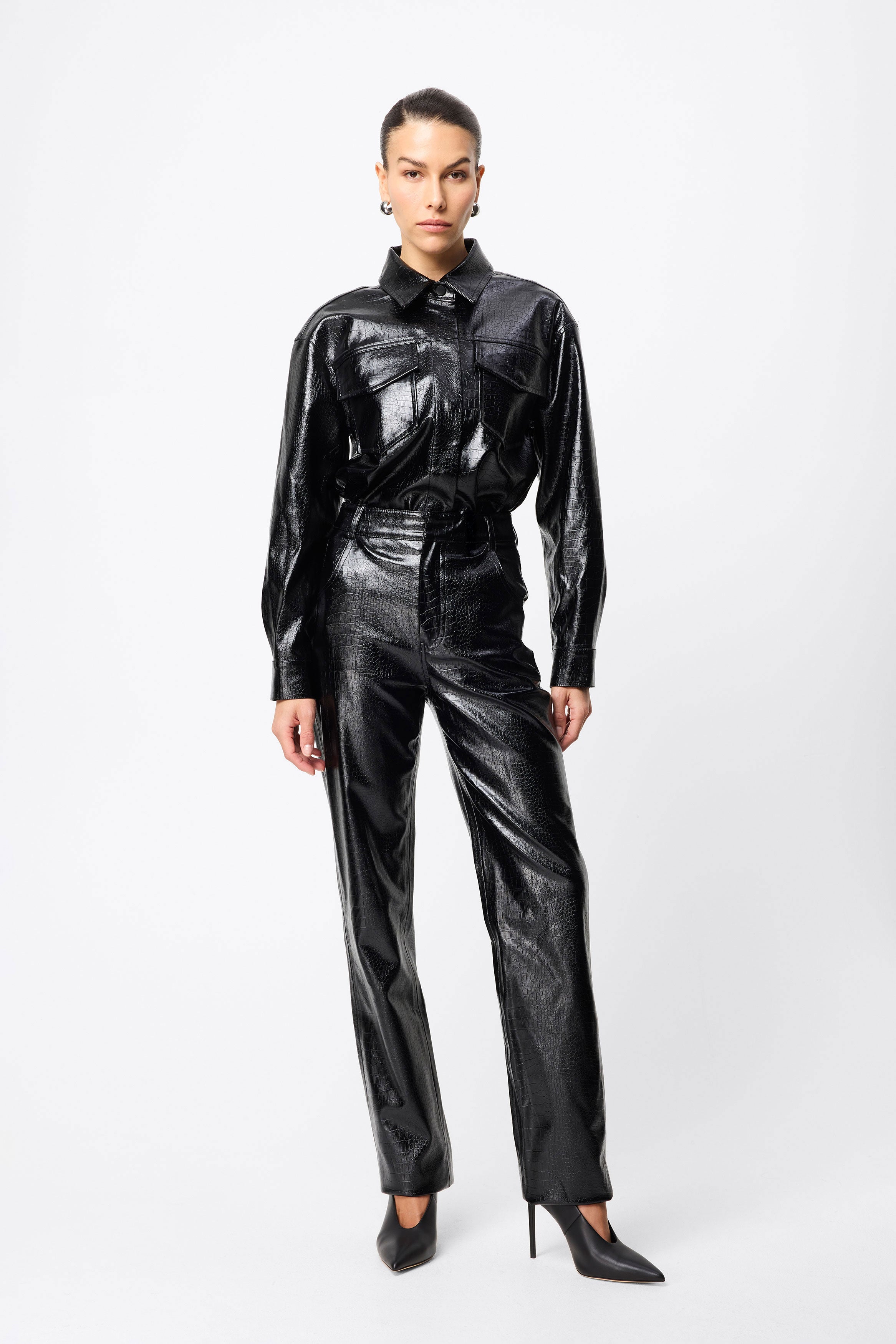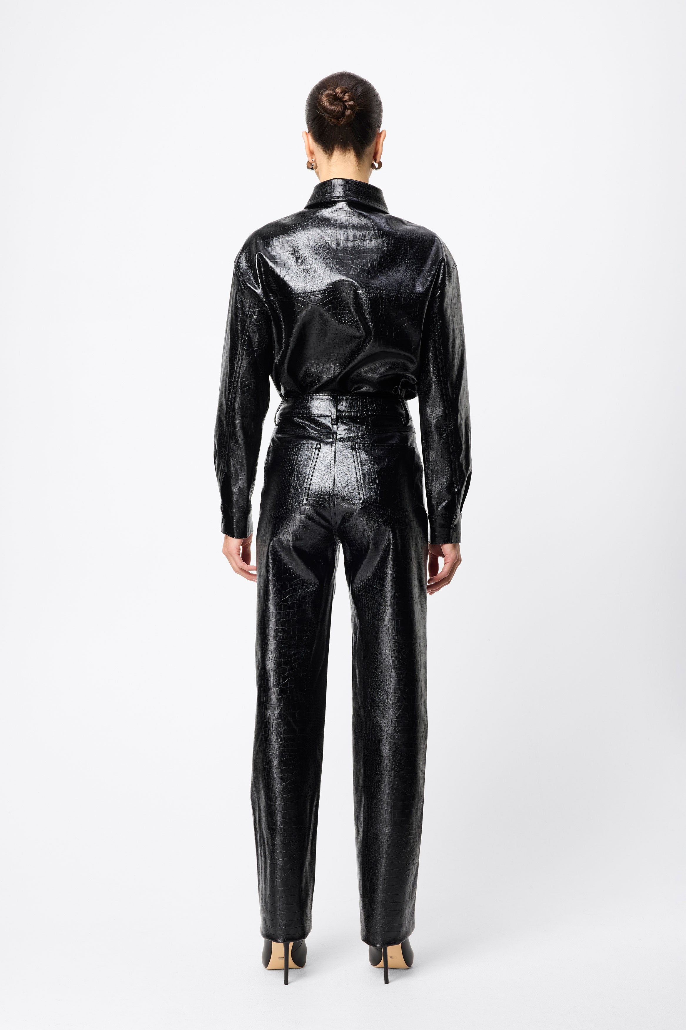 Make an impact with The Salt Water Pant in black Faux Croc Leather. These jean-style trousers have front slanted pockets and rear patch pockets with a high-rise waist and a sleek straight leg silhouette, these high-rise pants balance practicality with fierce style. Team them with a fitted top for casual chic or pair with the matching Salt Water Shirt for an eye-catching outfit.