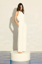 The Free Falling Top in White embodies effortless sophistication and modern versatility. Crafted from a premium draped jersey fabrication, this sleeveless silhouette features a racer neckline and an asymmetric waist with soft draping that flatters the form. A delicate button closure at the neck adds refined detail, while the fluid shape ensures graceful movement. Perfect for both day and evening, pair it with the Free Falling Pant for a monochromatic look or style it with denim for a relaxed weekend edit.