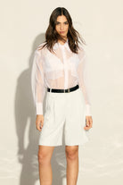 A classic silhouette, refreshed with contemporary sophistication, the Oasis Shirt in White is crafted from a lightweight sheer organza fabrication. Designed with a collared neckline, front button closure, and long sleeves with structured cuffs, this piece balances classic tailoring with modern femininity. Front patch pockets and an inverted box pleat at the back yoke lend subtle detail, while the waved hemline enhances its relaxed silhouette. Perfect for layering — wear it over a cami for understated sophistication or a bralette for an elevated, directional look.