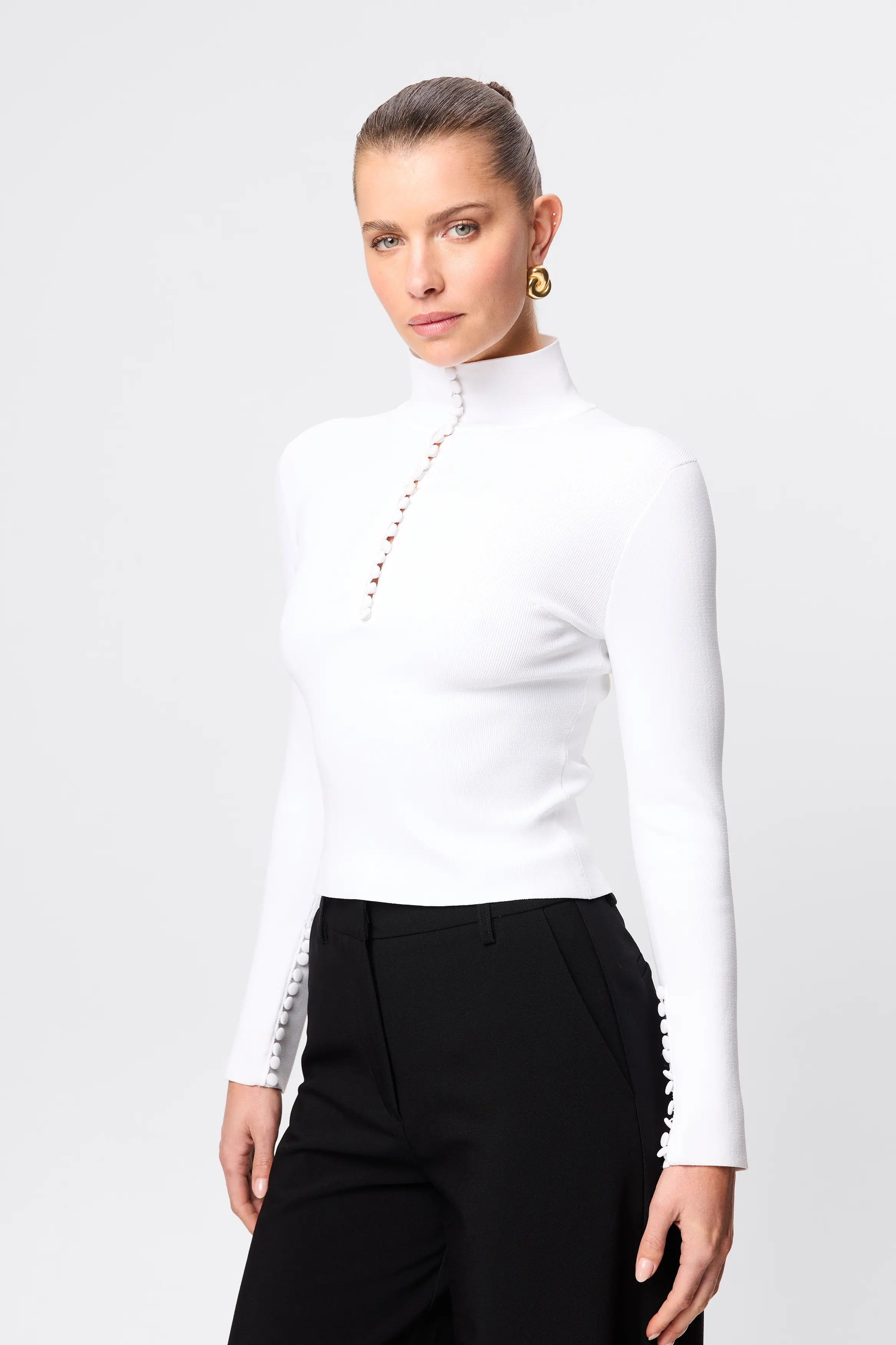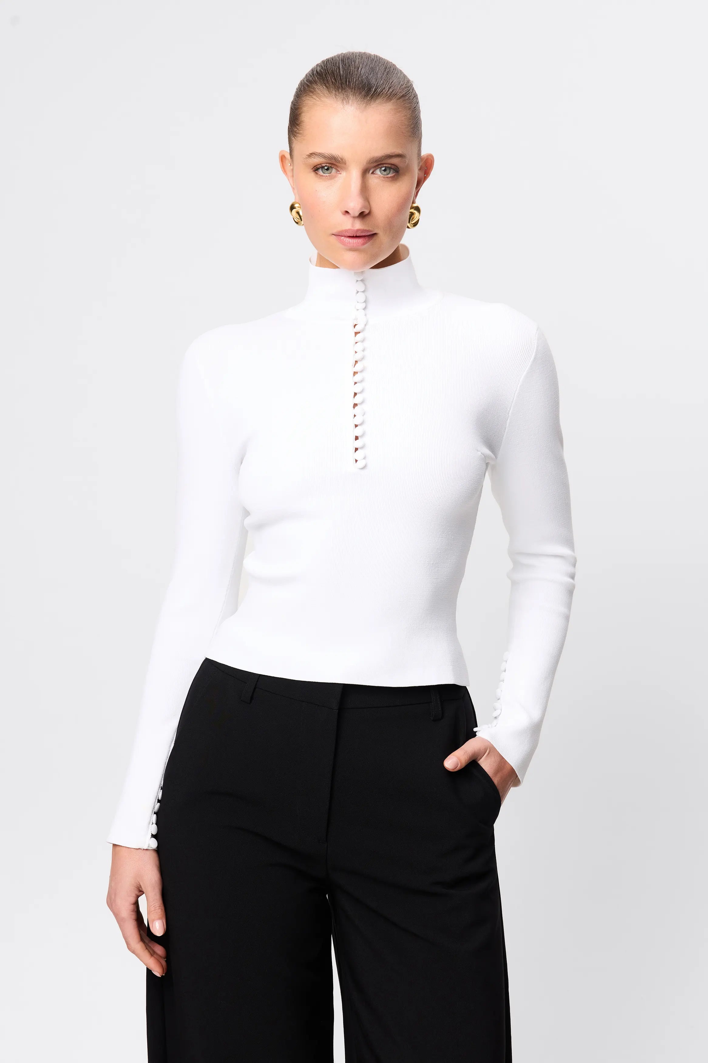 A perfect blend of comfort and style. The Mayfair Long Sleeve Top in White features a unique detail with buttons running along the V-neckline, adding a touch of sophistication. The same button detail is mirrored on the sleeve cuffs, creating a cohesive and chic look.
