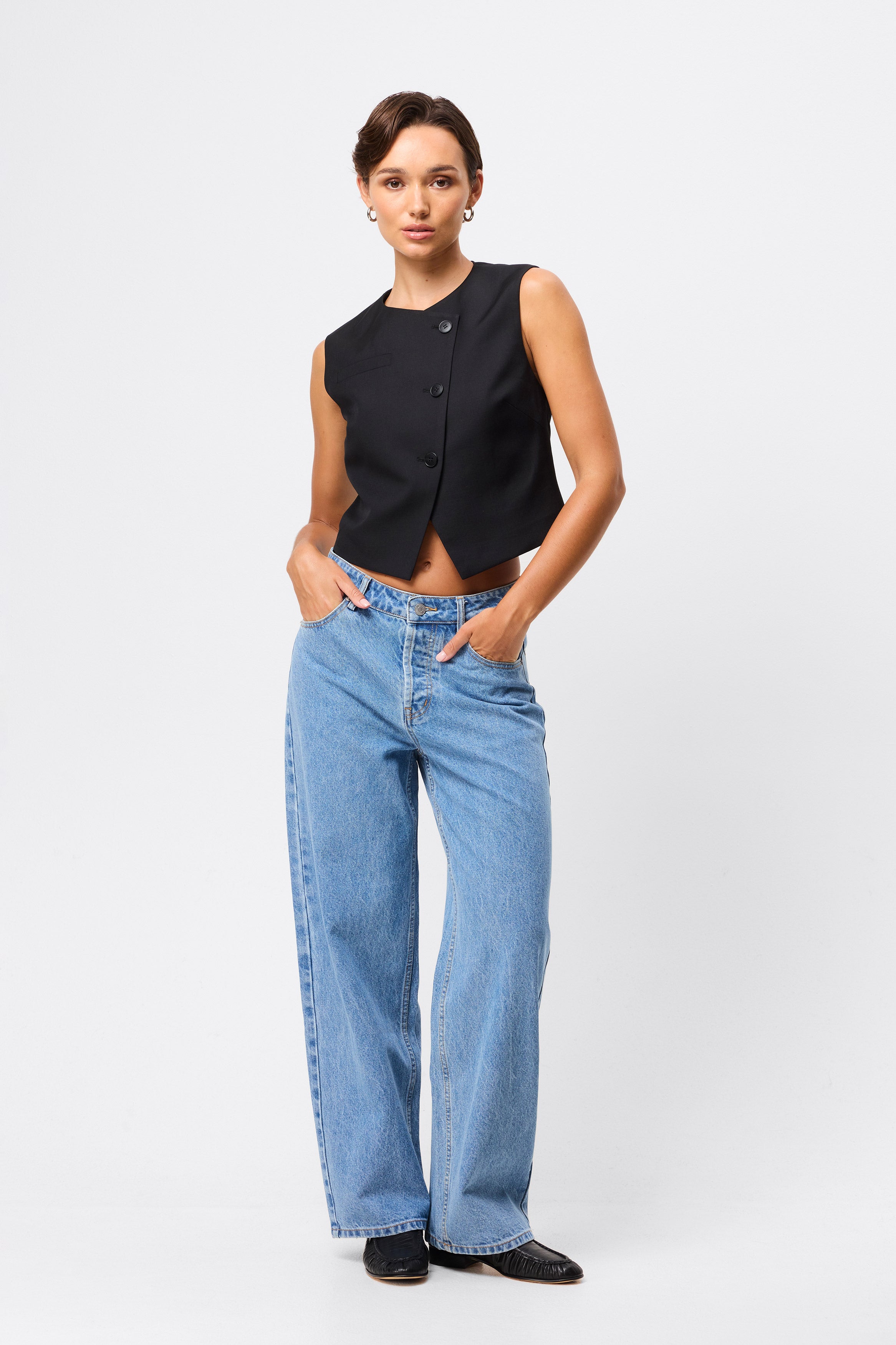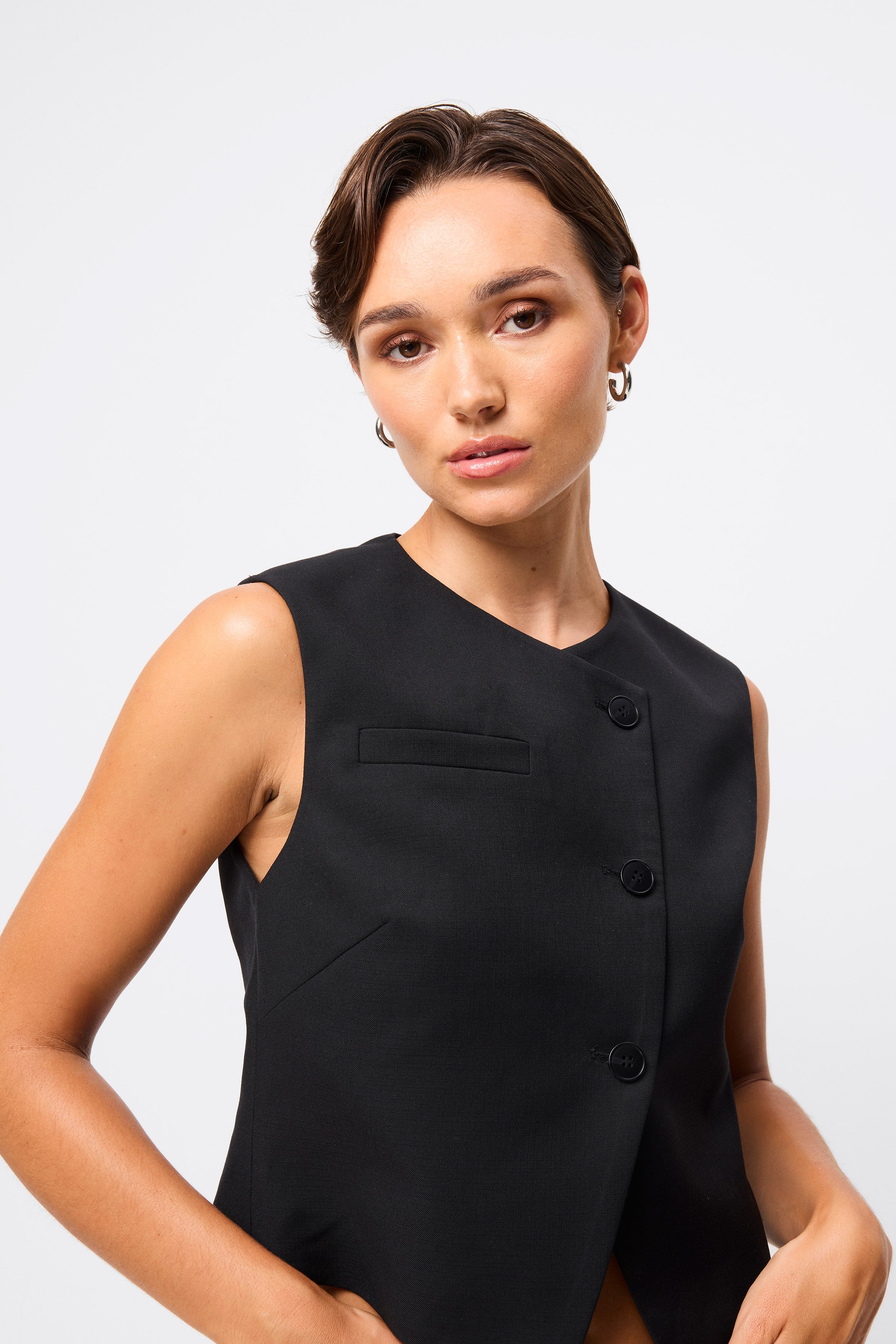 A contemporary take on classic tailoring, the By Your Side Vest in Black is crafted from premium suiting fabrication and features a round neckline, bust darts, faux pockets, and a front-pointed hem for a structured finish. Designed with an off-body silhouette and asymmetric self-coloured button closure, it offers a sleek, modern edge. Pair it with the By Your Side Mini Skirt for a sharp coordinated look, layer under a blazer for the office, or style with denim for effortless weekend wear.