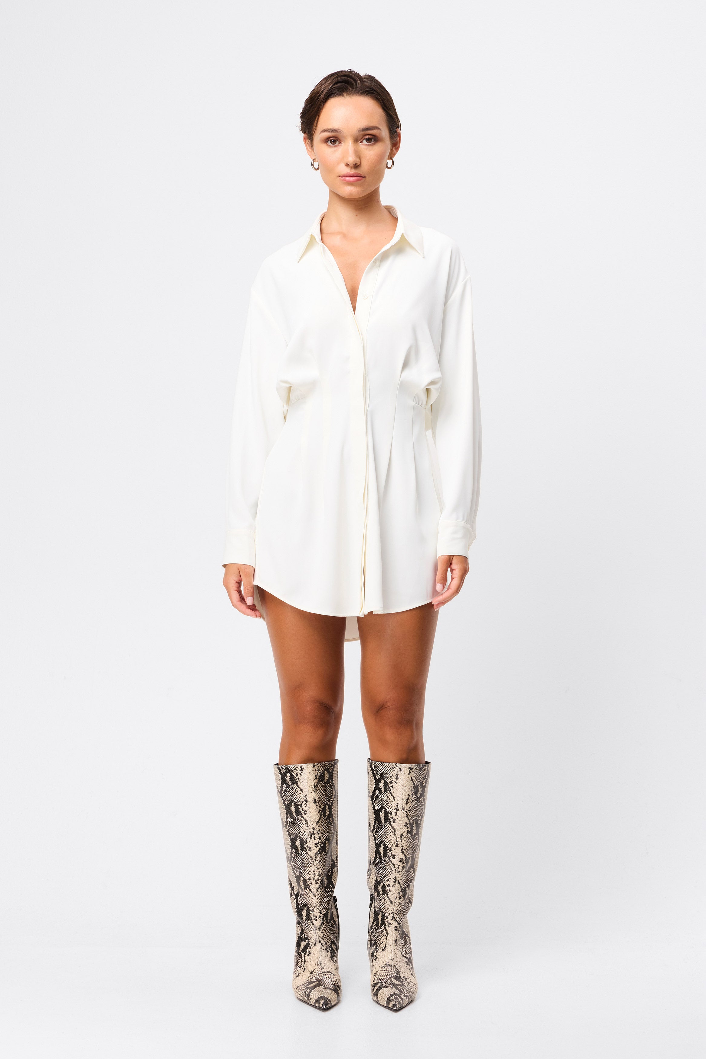 A modern essential reimagined, the Good Intentions Mini Dress in fresh white offers elevated ease. With a soft blouson silhouette, gently gathered waist, and fluid drape, this piece is refined by a shirt collar and concealed buttons through the front. The understated shape and clean finish make it a versatile go-to, whether styled with heels or paired back with flats.