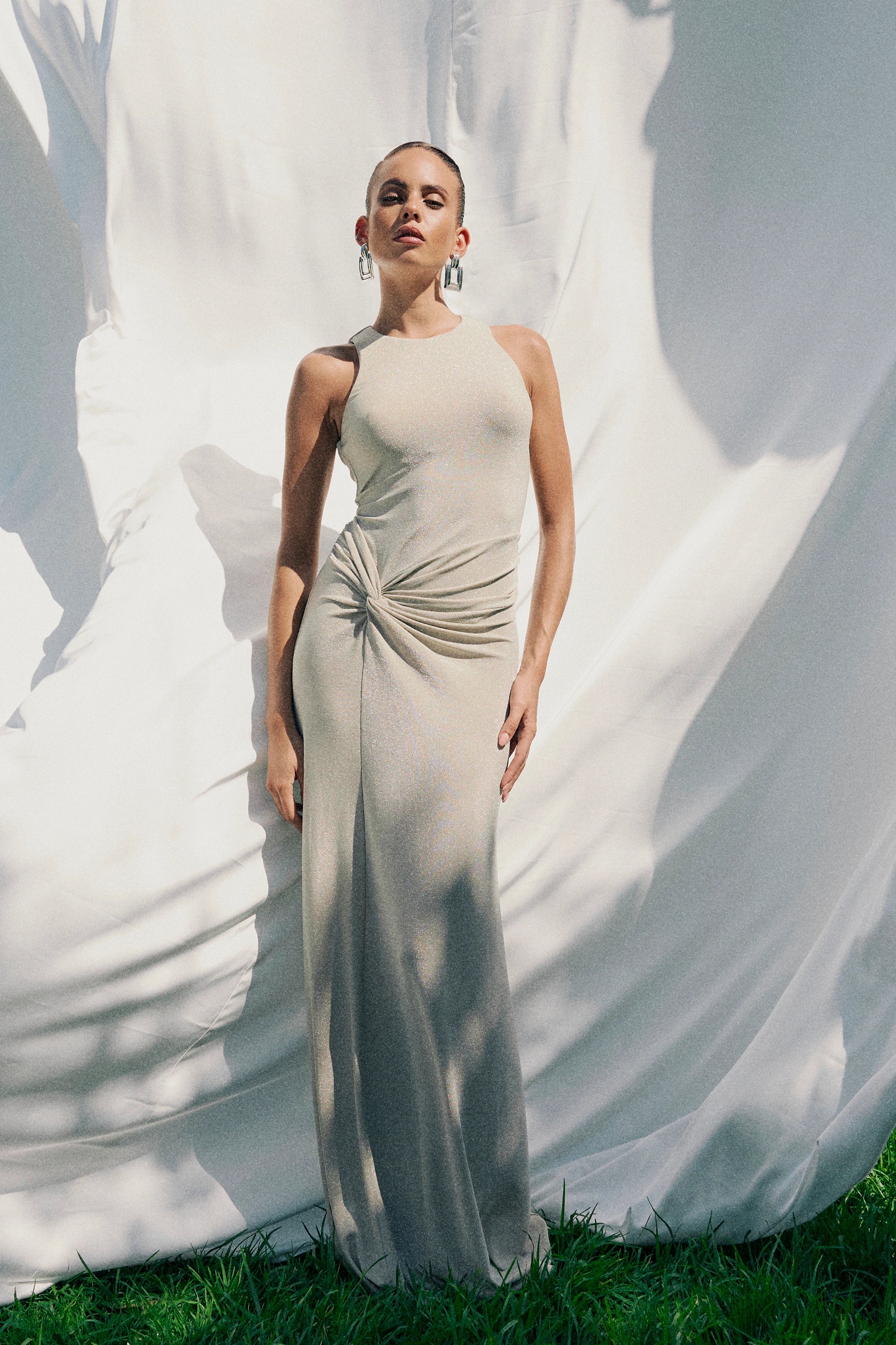 Radiate sophistication in the Adore You Maxi Dress. This sleek silhouette fuses modern elegance with timeless glamour. Crafted from premium metallic jersey, the design moves fluidly with the body while shimmering under the light. A racer neckline and sleeveless cut create clean, contemporary lines, while the twist detail at the waist sculpts the figure before falling into a soft, flared skirt for graceful movement. Perfect for cocktail parties and formal events, this form-fitting style pairs effortlessly with statement jewellery and heels for an unforgettable finish.