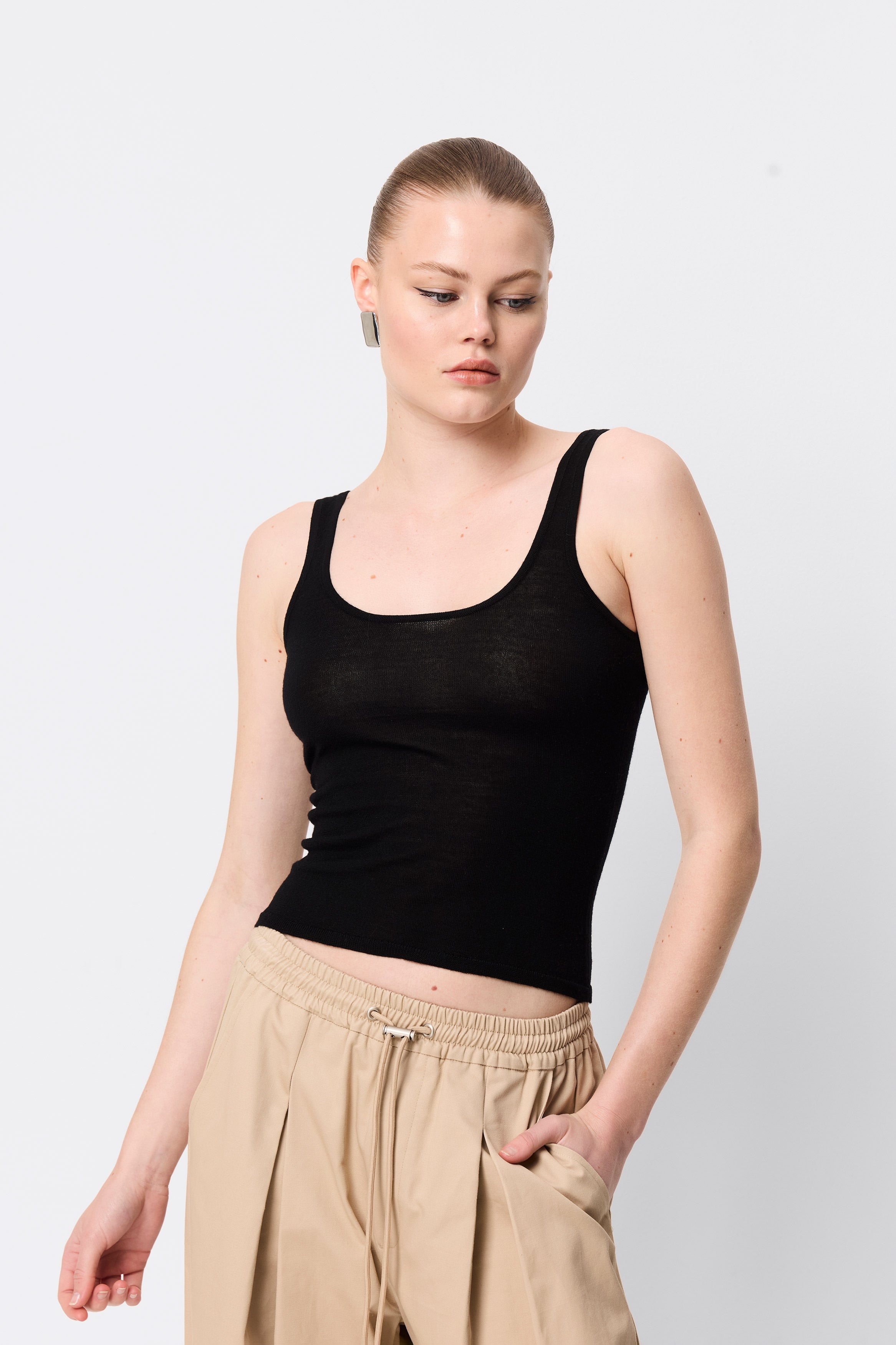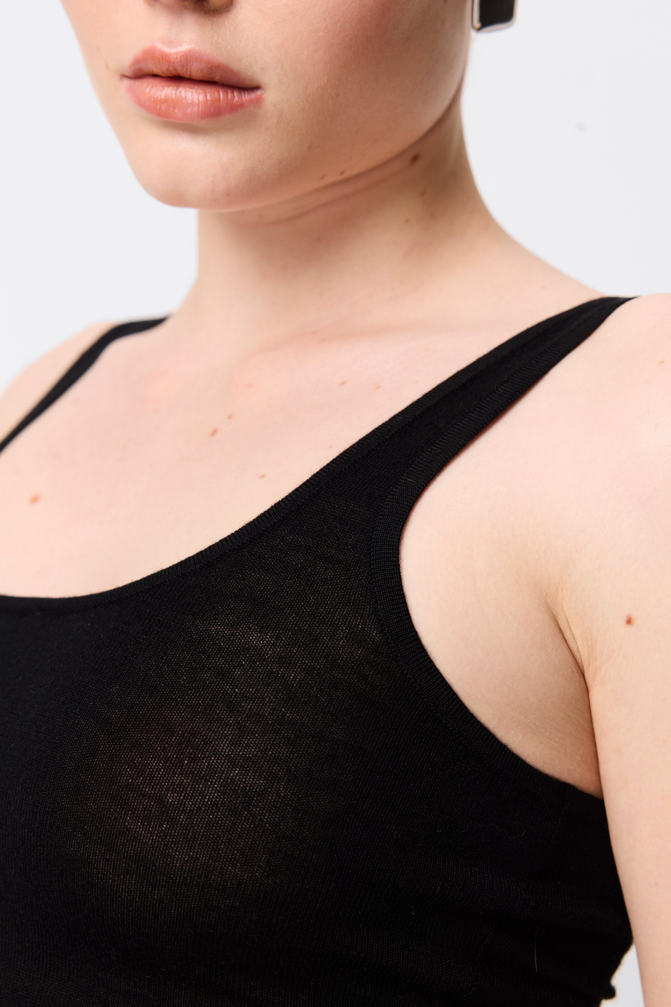 The Arden Tank in Black is a refined essential, designed for everyday wear. Crafted from premium 100% Merino wool, this piece features a body-skimming fit with a flattering scoop neckline and wide straps for effortless versatility. Its minimalist silhouette makes it the perfect base for layering or a chic standalone option. Transition seamlessly from casual looks to elevated ensembles with this timeless wardrobe staple.