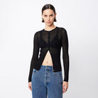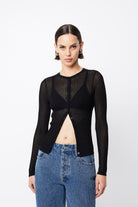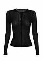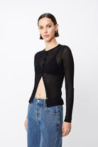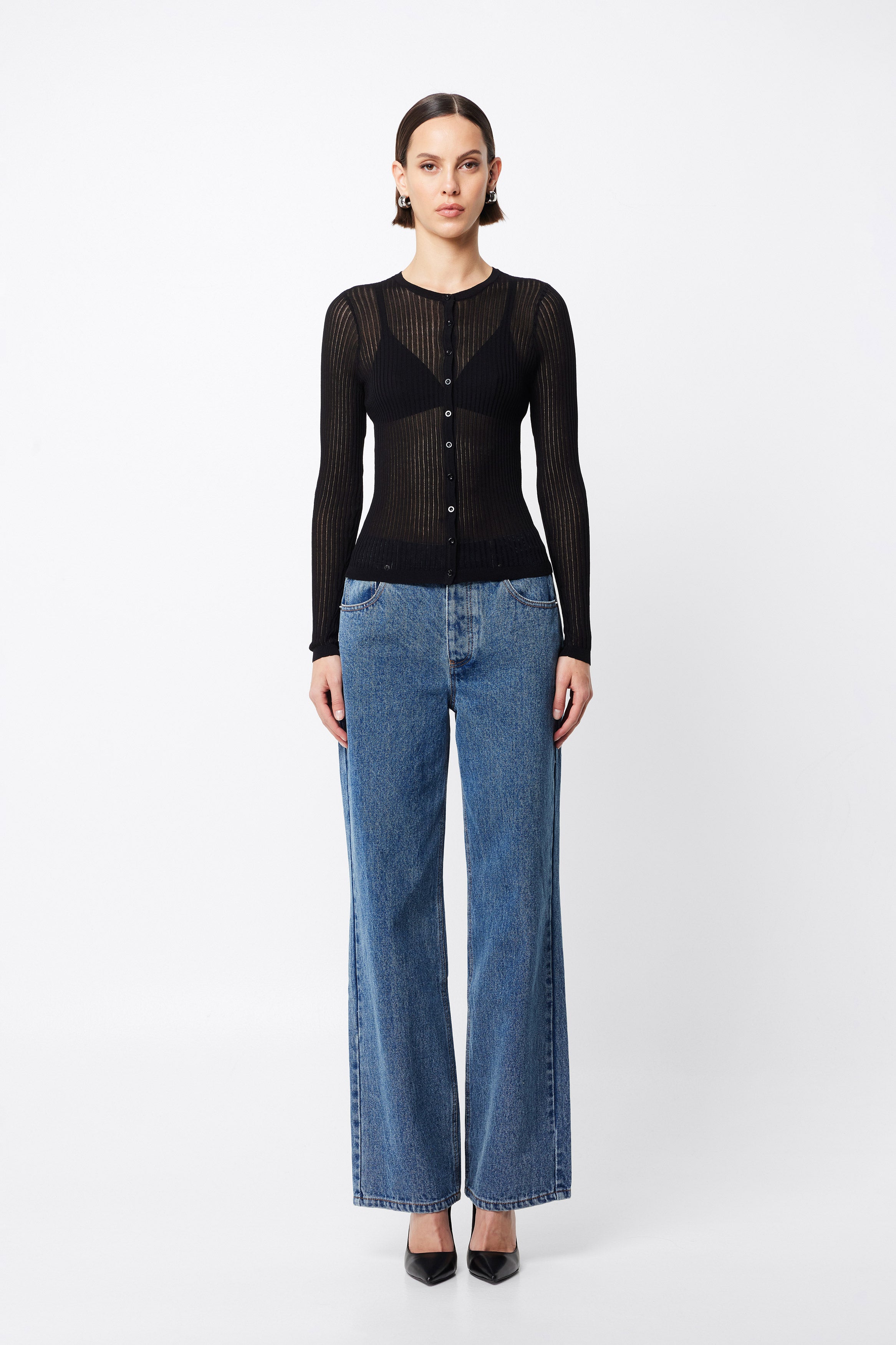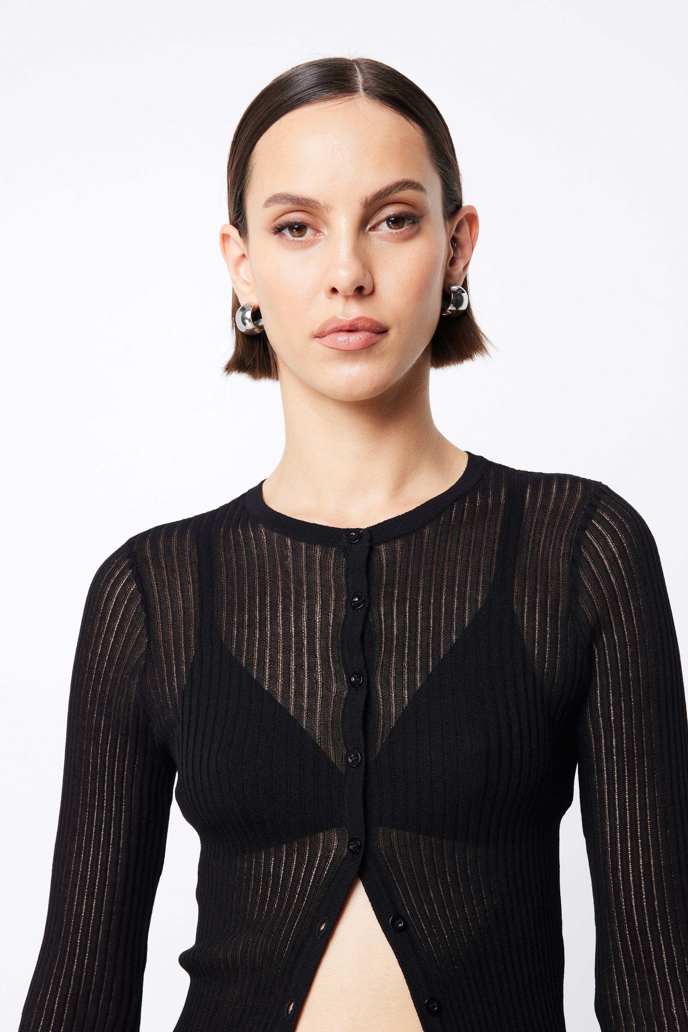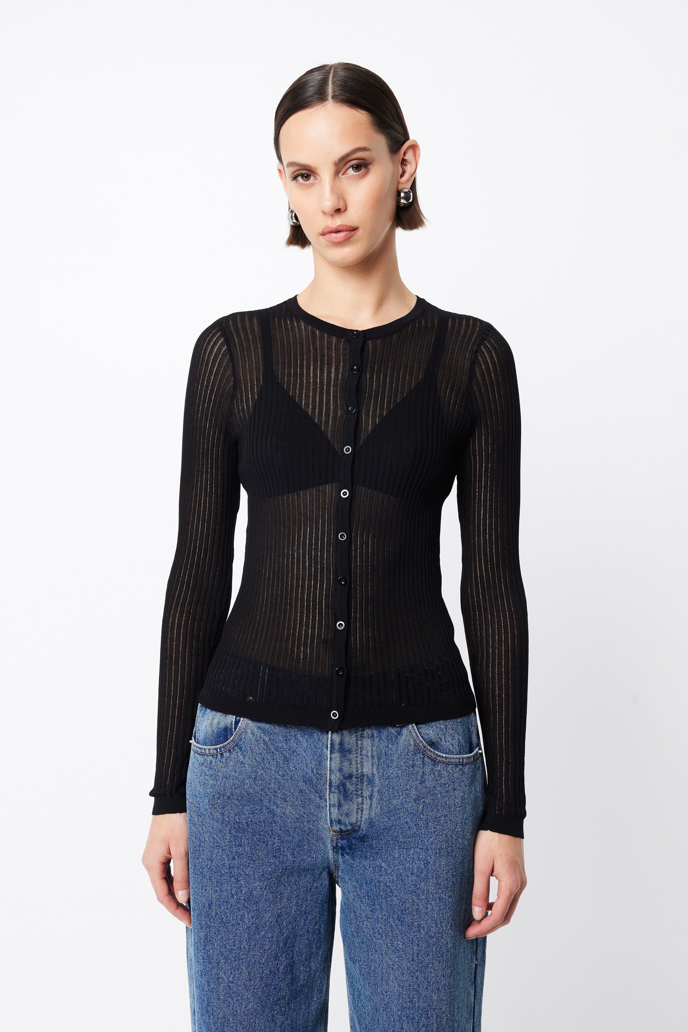 Refined and versatile, the Bristol Cardigan in black is the ultimate layering essential. Crafted from a soft, semi-sheer knit fabrication, it features a classic round neckline, tonal buttons, and long sleeves. Whether worn on its own or layered, this piece transitions effortlessly through the seasons for a sleek, timeless look.