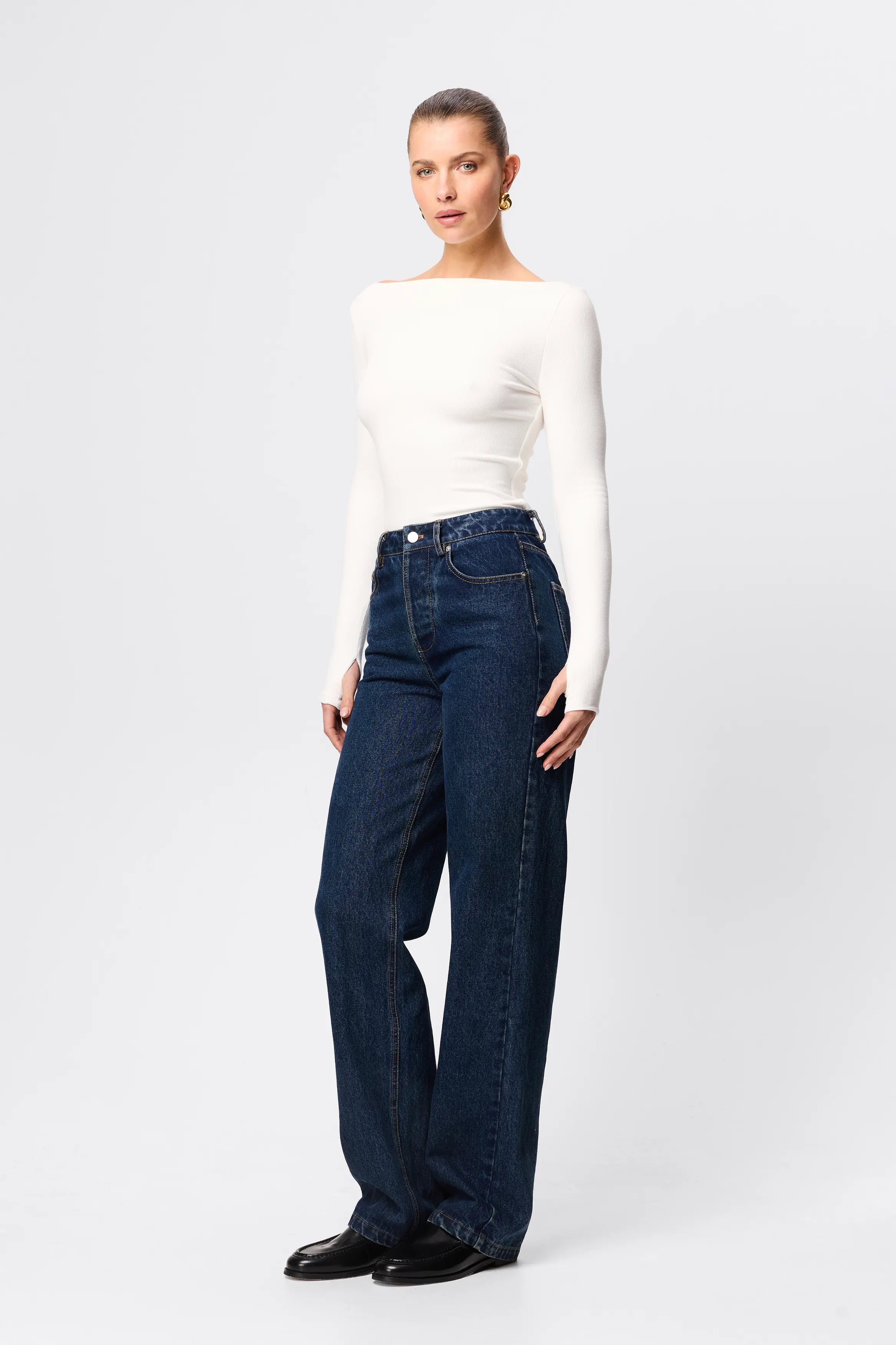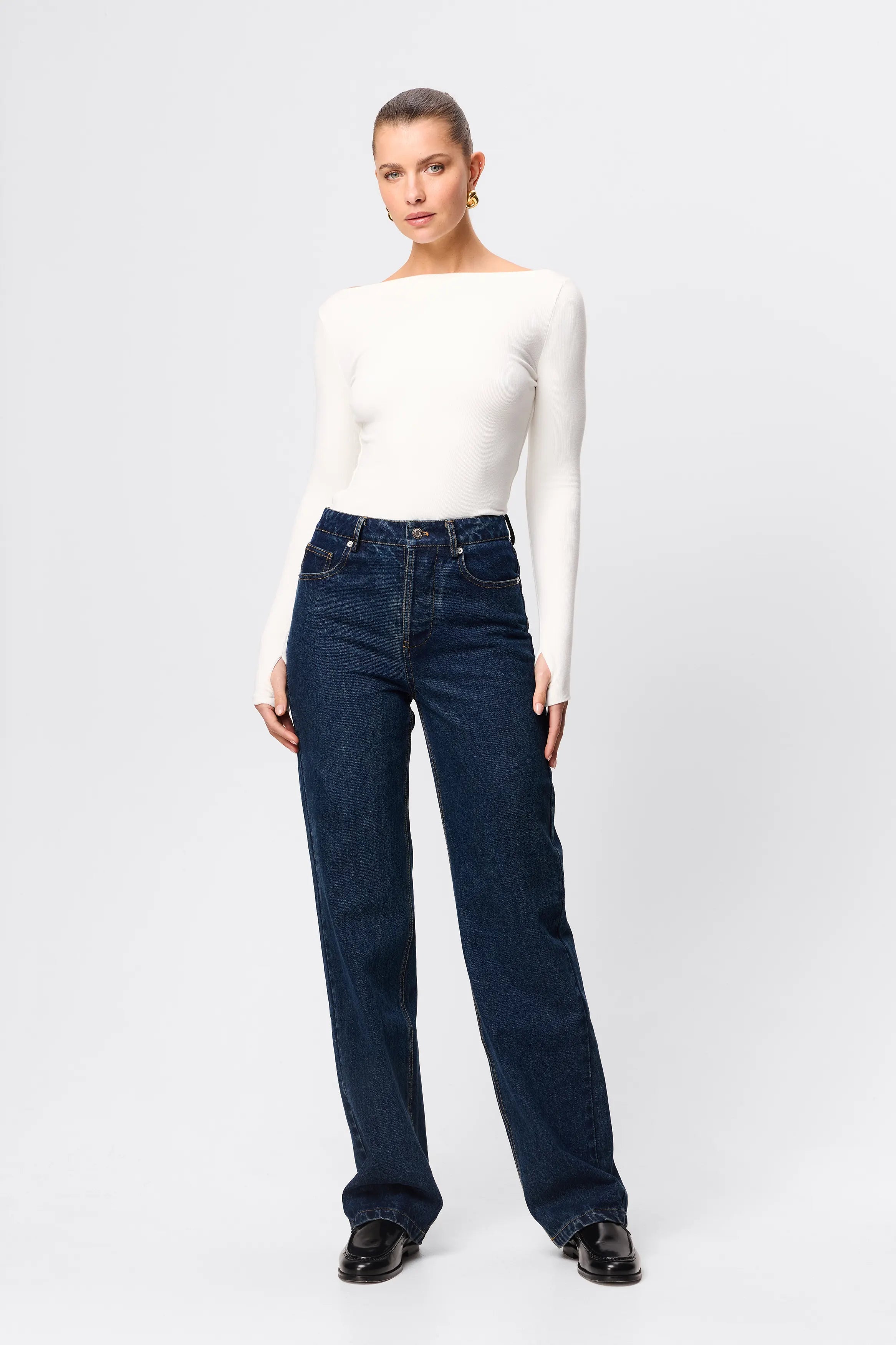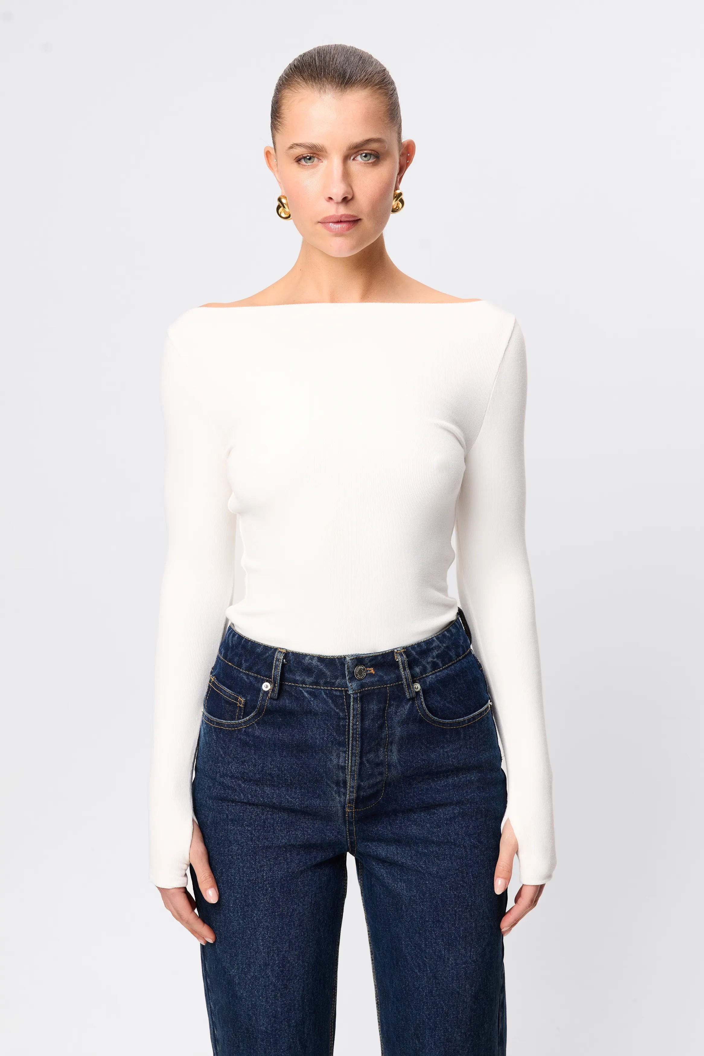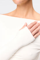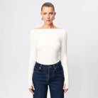 The Camden Top in White, is an evolution of our ever-popular Brooklyn Top. Crafted from a soft, double-layered ribbed jersey fabrication, this top offers a generous amount of stretch featuring a boat neckline and long sleeves with thumb holes. Perfect for keeping you warm during the cooler months, this top can be paired with existing pieces in your wardrobe and seamlessly goes from day to night.