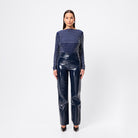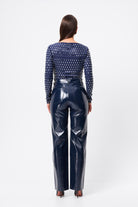 The Dawn On Me Pant delivers a bold, modern silhouette crafted in a high-shine midnight blue vinyl fabrication. Designed to sit high on the waist, this sleek style sculpts the leg with a clean, streamlined finish that feels both powerful and refined. The glossy surface elevates everyday dressing, making these pants equally suited to statement evening looks or directional day styling. Pair with the matching jacket for a striking, head-to-toe moment.