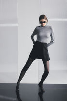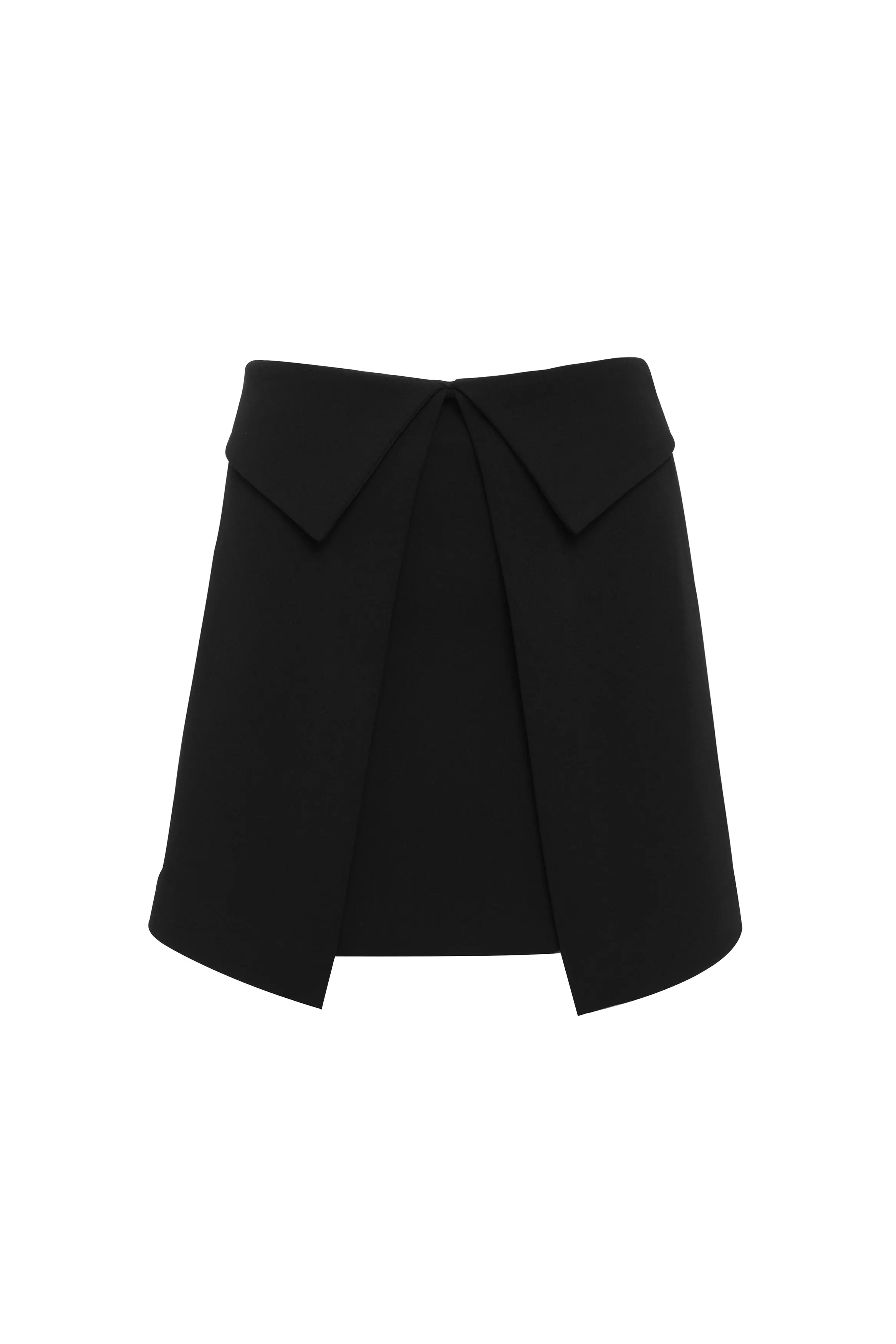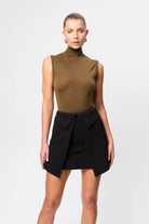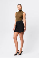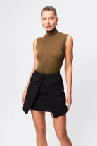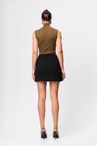 The Even Odds Mini Skirt in Black offers a contemporary take on tailored dressing, crafted from structured suiting fabrication that holds its shape with a refined finish. Sitting on the waist, the design features an architectural wrap-style front with folded waistband detailing that creates depth and dimension through the silhouette. Polished yet directional, it’s a statement mini that transitions effortlessly from day to evening styling.
