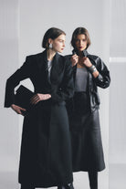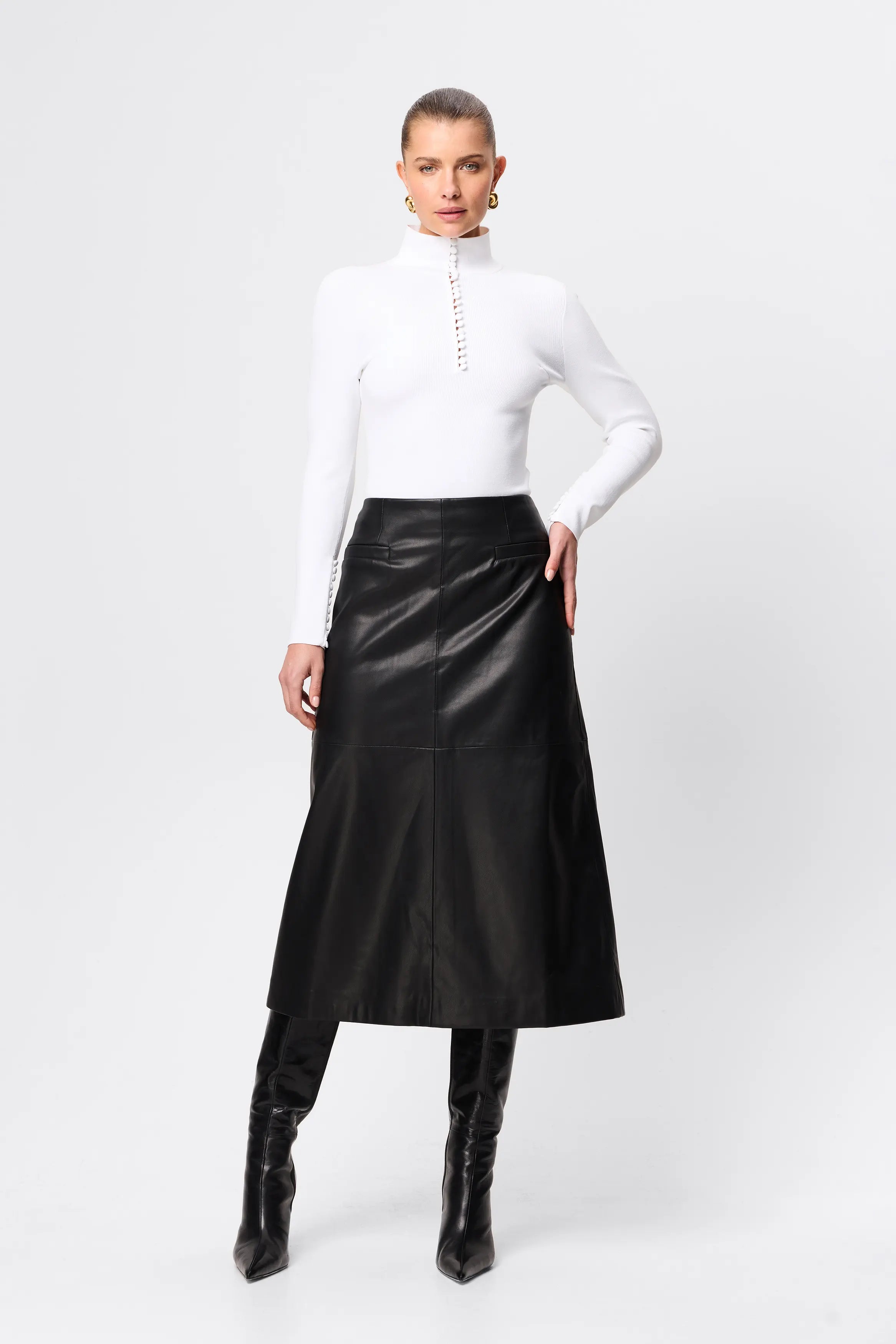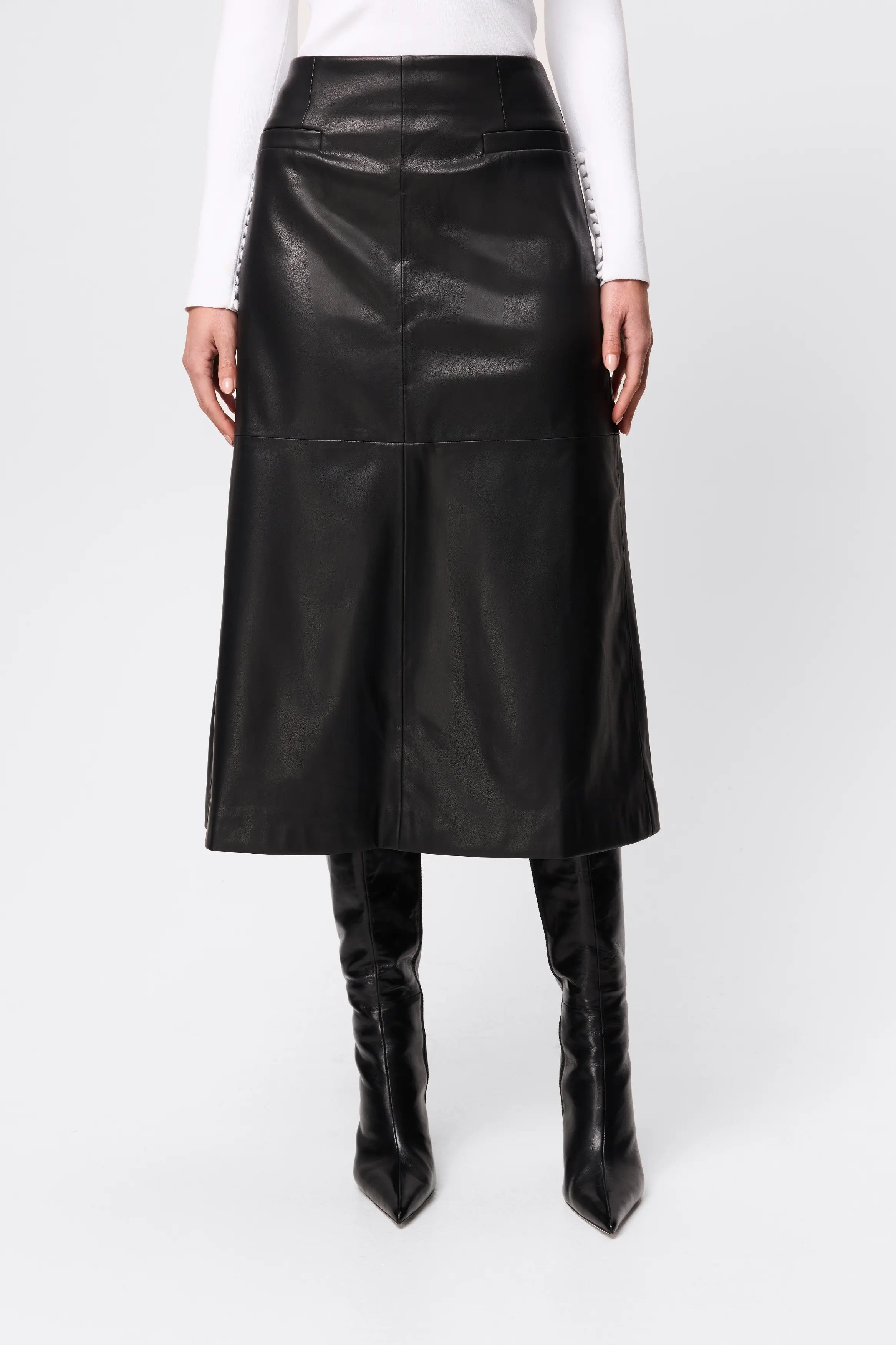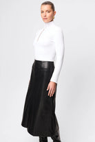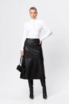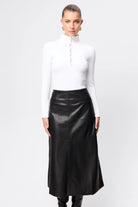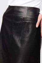 The Fairfax Midi Skirt in Black is a refined statement piece designed to bring modern structure to your wardrobe. Crafted from a smooth faux leather with a soft hand feel, this silhouette skims the hips before falling into a subtle A-line shape that creates movement and balance through the hem. Panel detailing enhances the clean lines, while the midi length offers a polished, versatile finish suited to both day and evening styling. Designed to sit neatly at the waist with a streamlined fit, it pairs effortlessly with fitted knitwear or crisp shirting and can be styled with the matching Fairfax Storm Trench for a cohesive, elevated look.