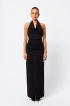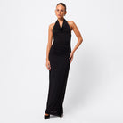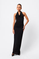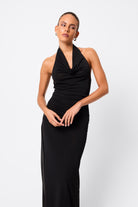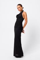 The In Too Deep Maxi Dress in Black is designed to captivate with its sleek and contemporary design. Crafted from a premium double-layered mesh fabrication, this striking style features a draped cowl halter neckline and a column fit that skims the body with effortless elegance. Side ruching and gathered detailing at the waist create soft texture and a flattering shape, while the floor-length finish elongates the figure. Contemporary yet timeless, it’s a statement piece destined for unforgettable moments.