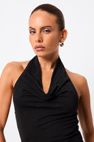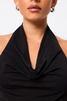 - Draped cowl halter neckline
