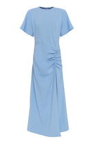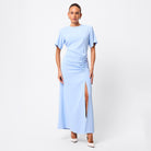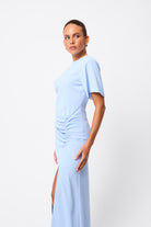 The Infusion Dress in cool blue delivers timeless elegance with a contemporary edge. Designed with a relaxed crew neckline, short sleeves, and asymmetric fixed ruching through the front, this maxi silhouette offers an off-body flattering, feminine fit. Versatile and chic, it’s perfect for a range of occasions — from daytime events and summer lunches to evening gatherings — with styling that can be easily dressed up or down.