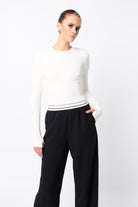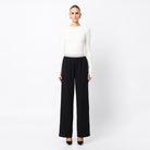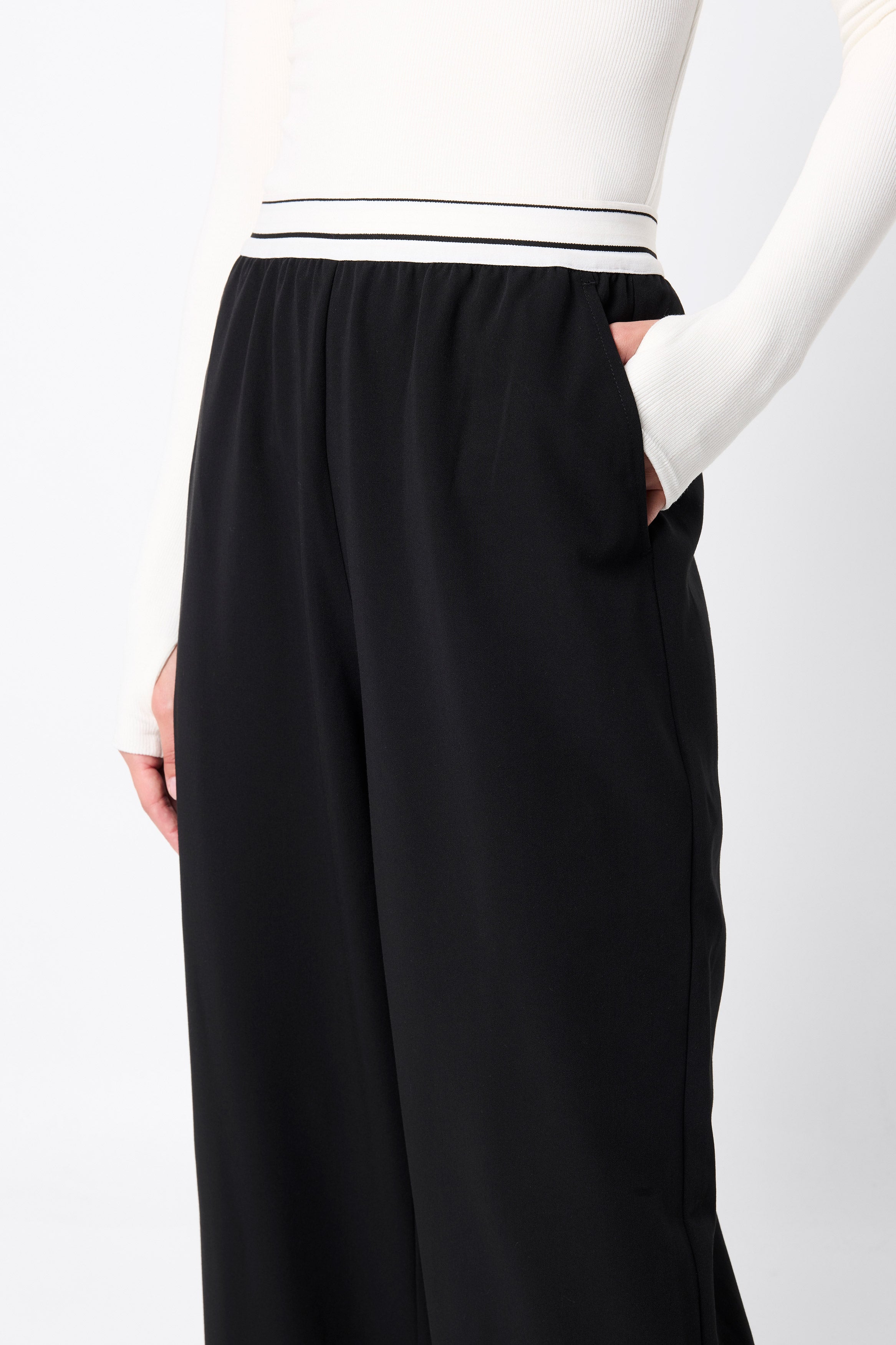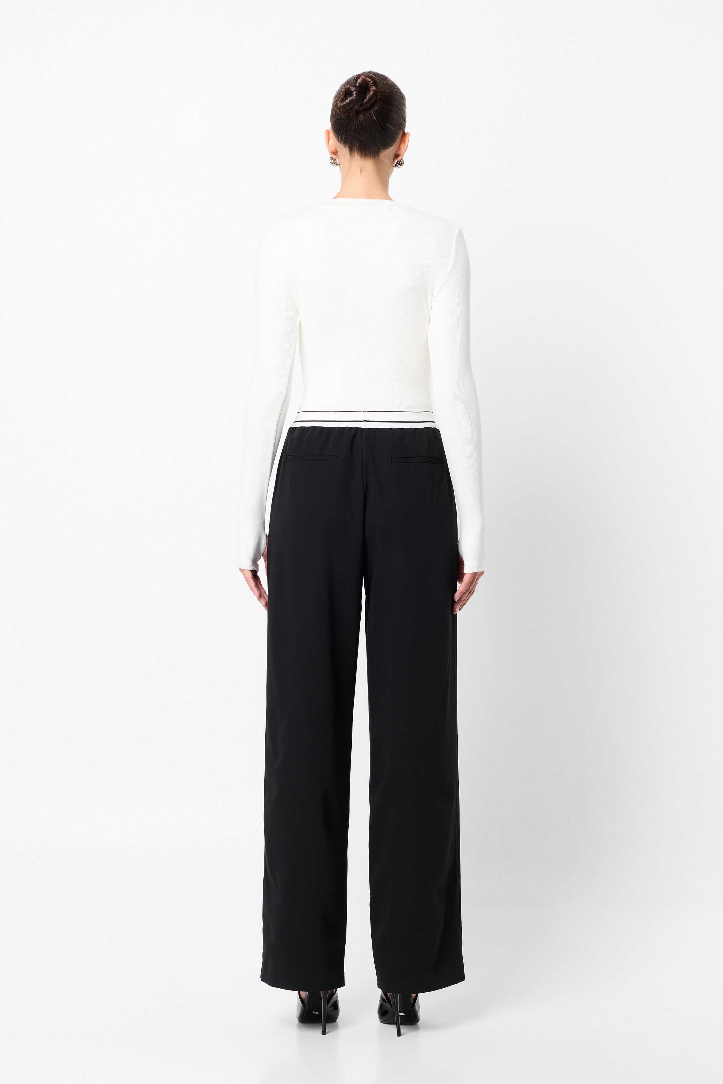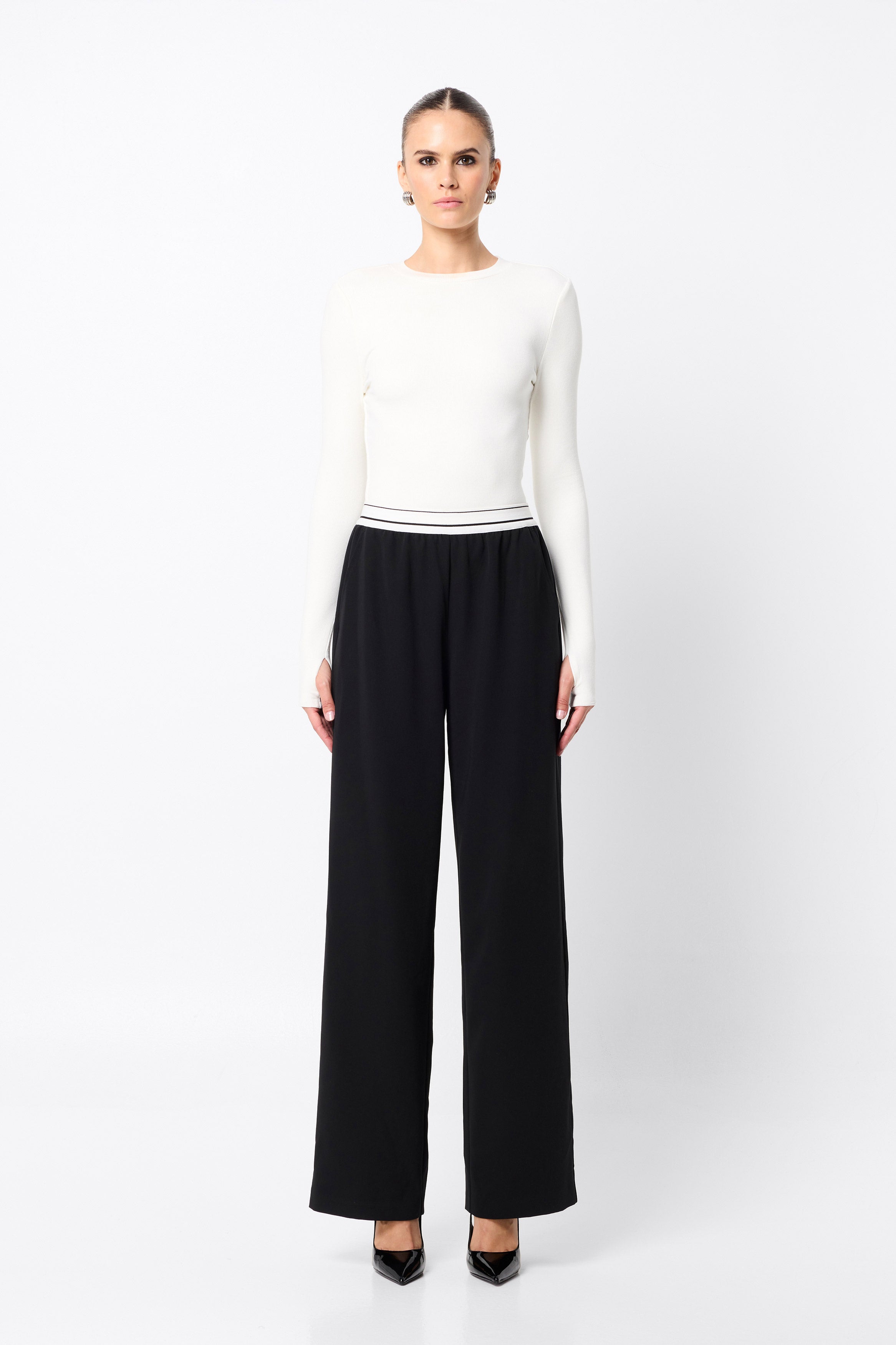 Adopt a new wardrobe favourite with the Levitate Pant in Black. Crafted from premium suiting fabric, this wide-leg style pant delivers effortless appeal. Featuring a contrast striped elasticised waistband, it blends structure with a sports-luxe edge. Style it with the Levitate Shirt for a polished finish, and a jersey top or tank cardigan for a relaxed weekend look.