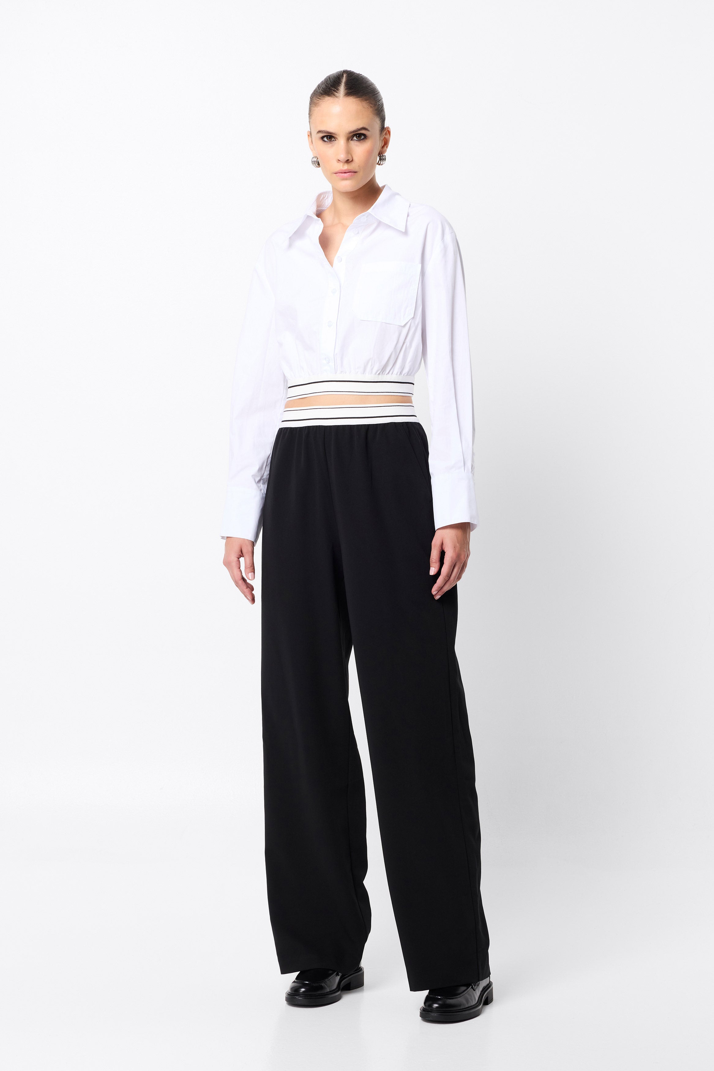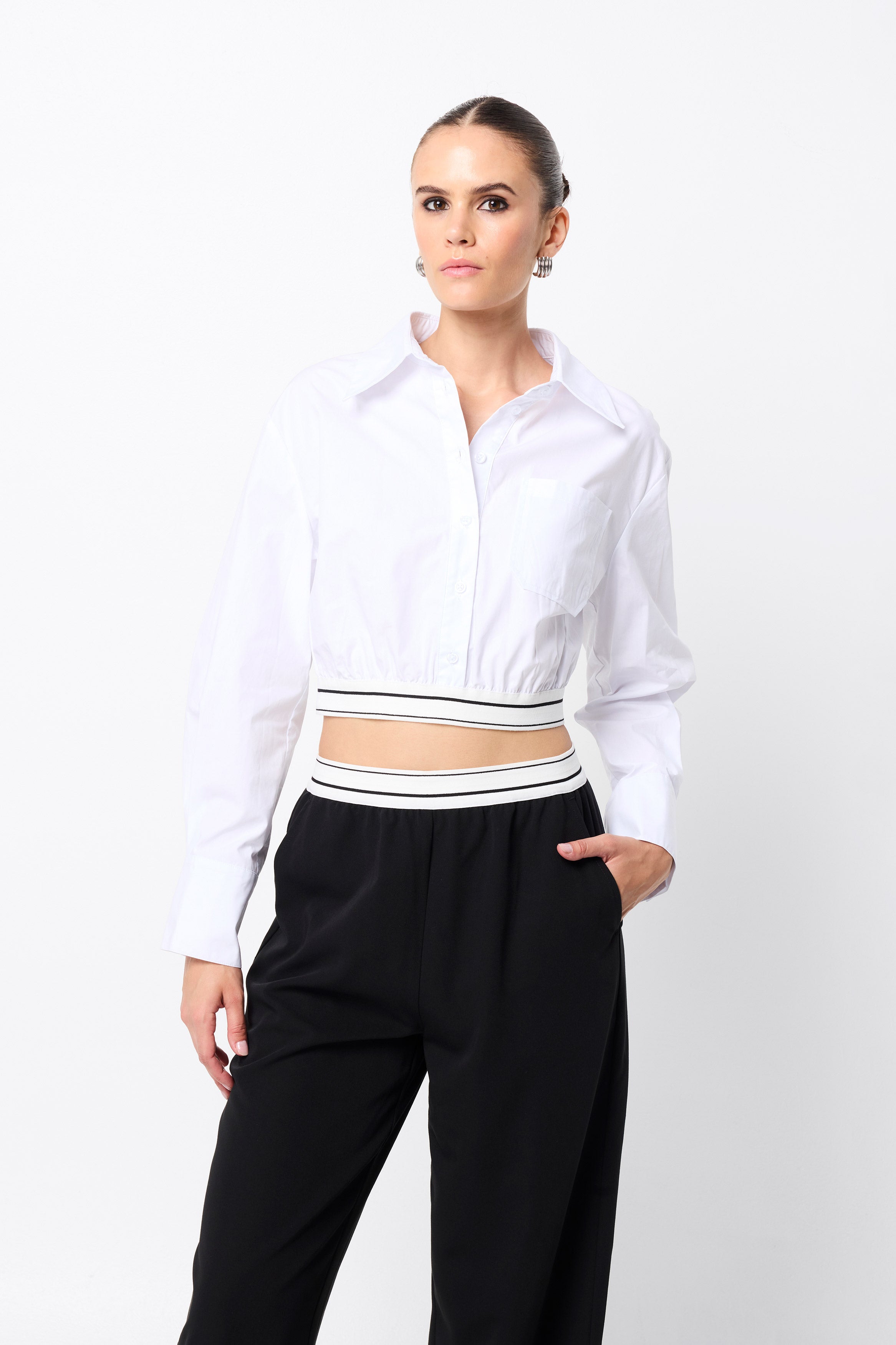 The Levitate Shirt strikes the perfect balance between contemporary edge and everyday ease. Crafted from premium cotton, this relaxed-fit shirt features a pointed collar, button-up front, and a functional patch pocket. A contrasting striped elastic waistband adds a modern twist to the cropped hemline, giving the classic silhouette a sports-luxe update. Style it with the Levitate Pant for a refined look, or combine with your favourite jeans for off-duty chic.