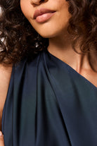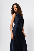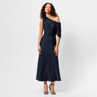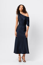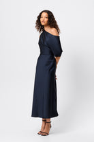 Crafted from a luxe satin fabrication in ink, the Love In The Dark Midi Dress exudes elegance and glamour. The bodice of the dress features a stunning off the shoulder design with asymmetric draped detailing, and the skirt showcases a flattering A-line silhouette. Style it with a black heel for your next cocktail event.