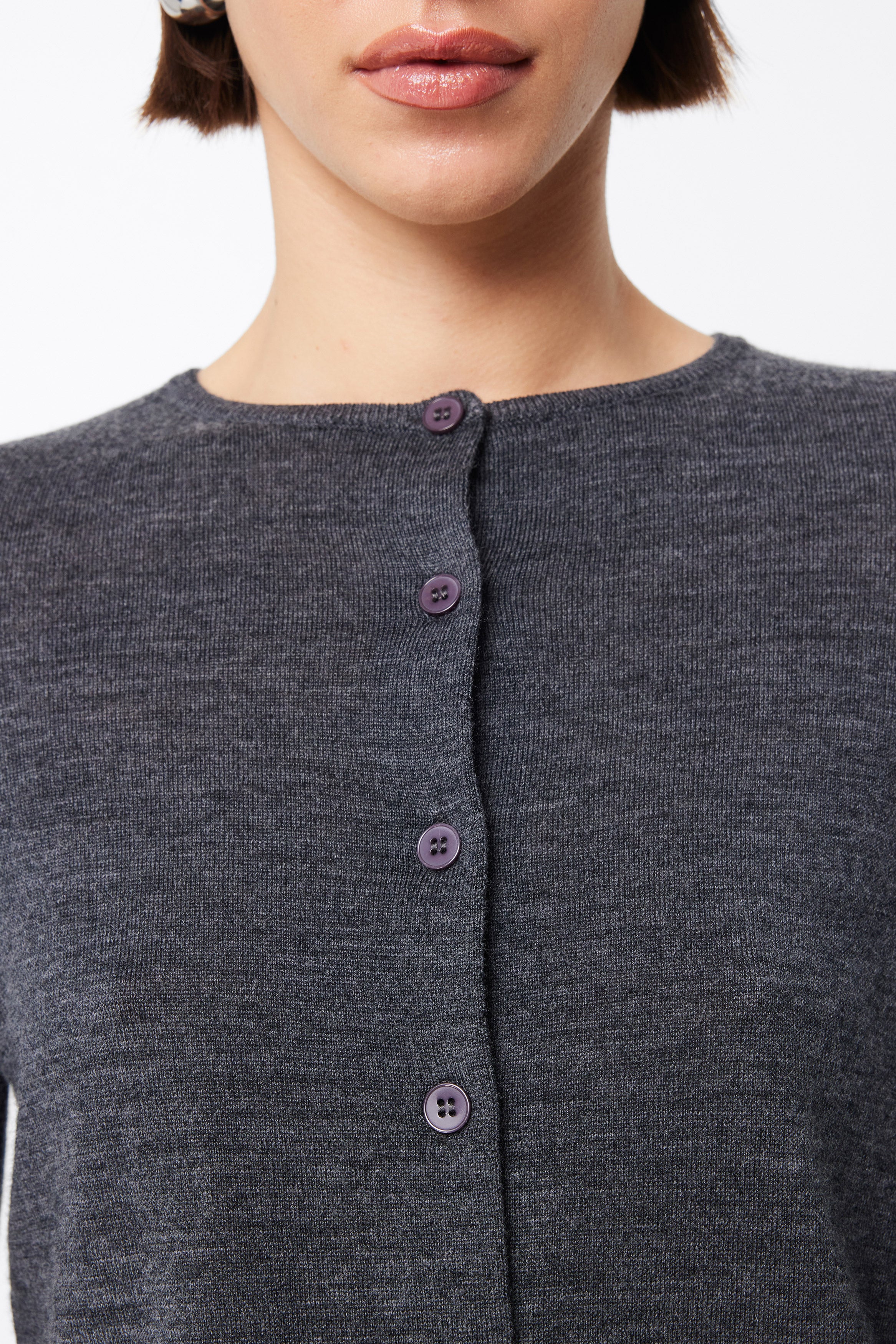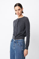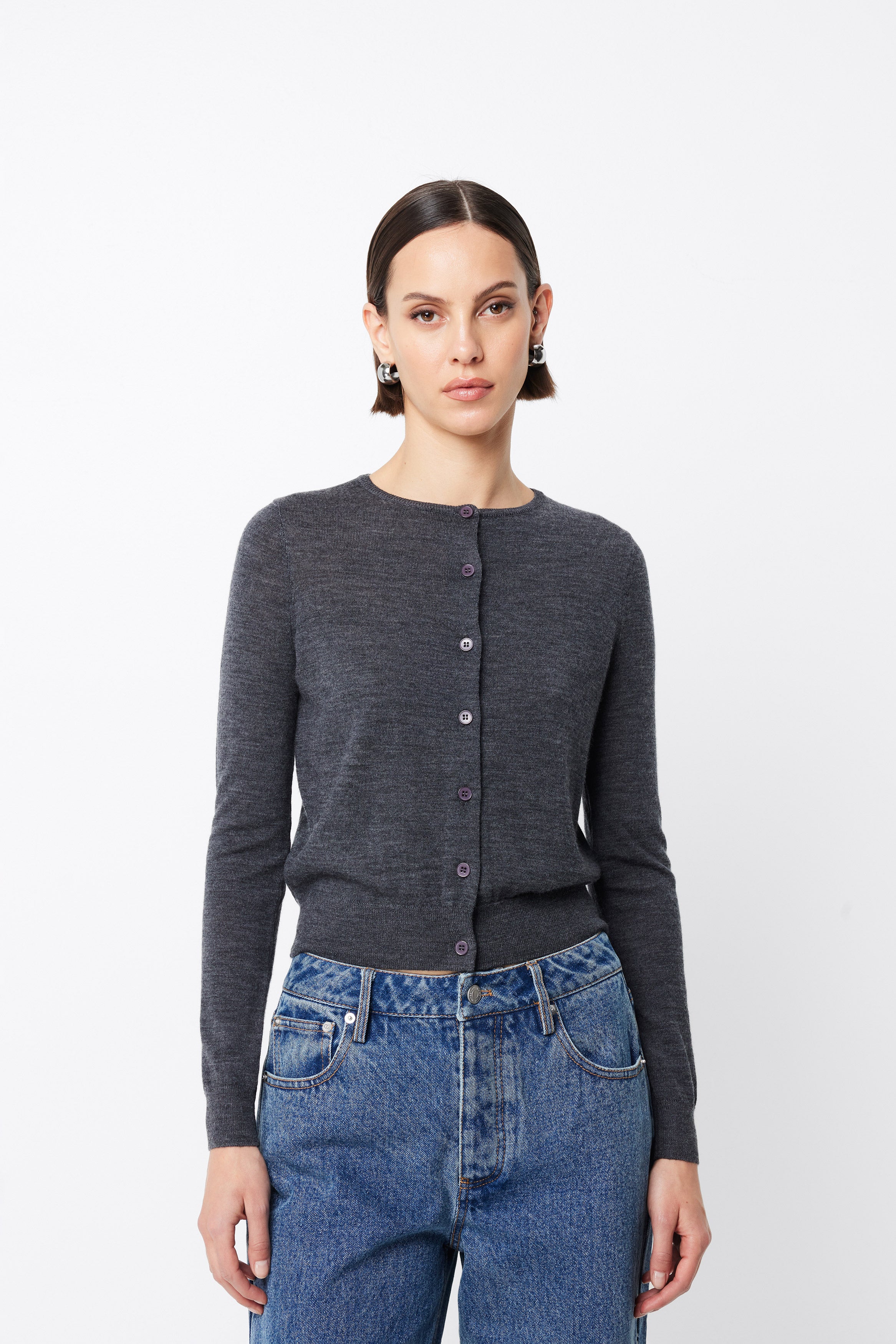 The Maine Cardigan in Charcoal is a refined yet versatile staple designed for warmth and effortless style. Crafted from soft 100% merino wool, it features a round neckline, cropped length, body skimming fit, and a self-coloured button front. Perfect for layering or wearing solo, this trans-seasonal essential seamlessly pairs with your wardrobe favourites for a polished yet relaxed look.